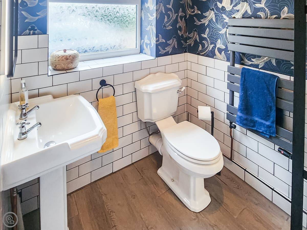 The stairs up to the bedroom are steep. I'd take care if you're bringing kids. The bathroom is ensuite, it's a shower room.