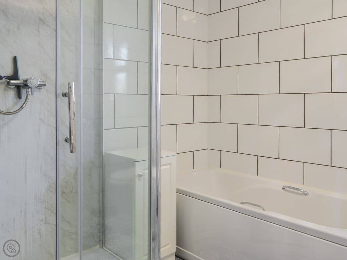 The living room looks out over the town. The kitchen has a dishwasher and a breakfast bar. One of the bedrooms has an old fireplace in it, but it's not in use. The bath has a separate shower over it.