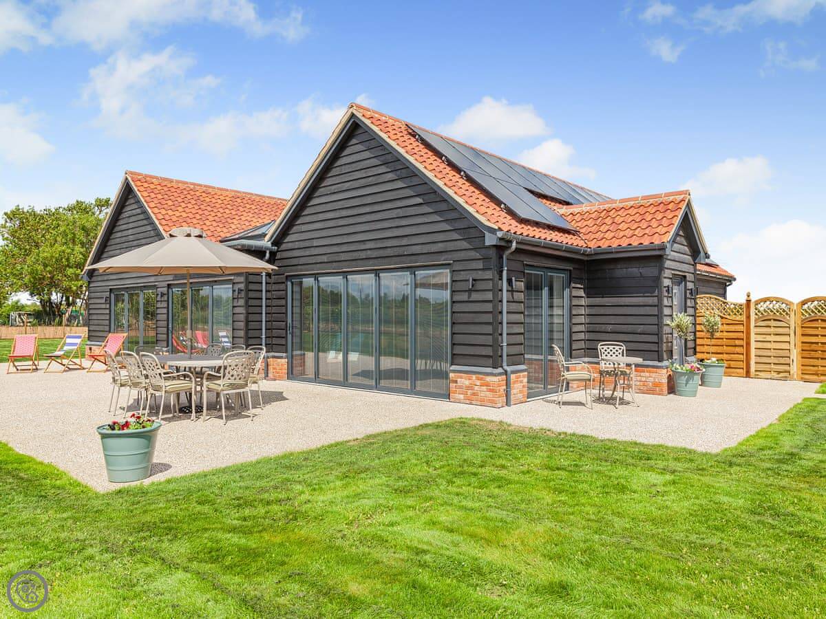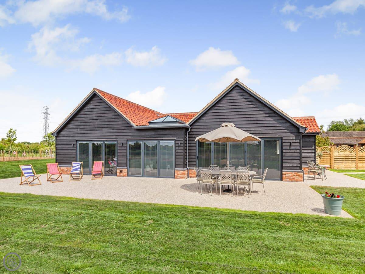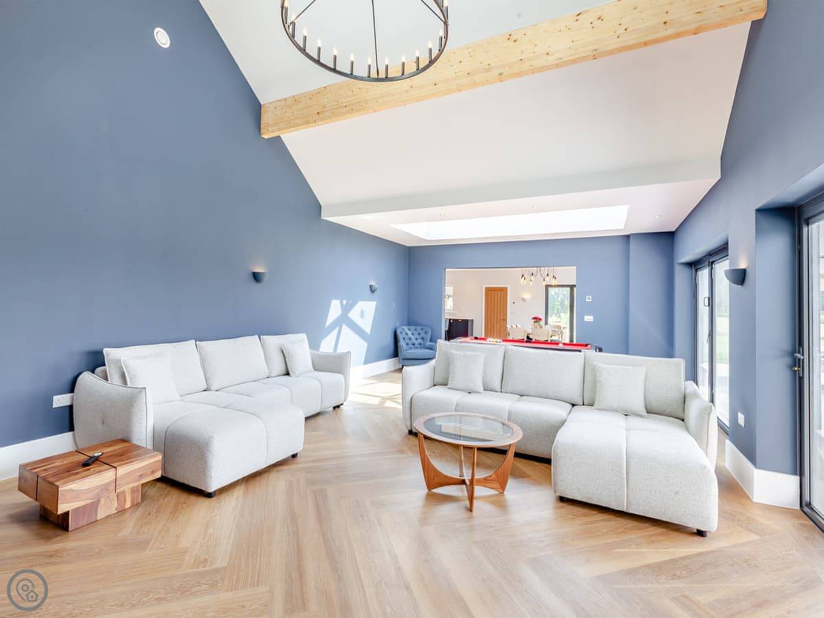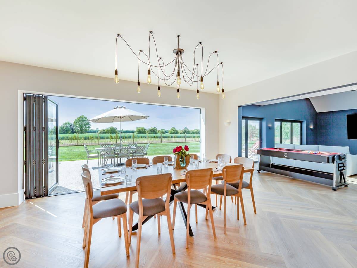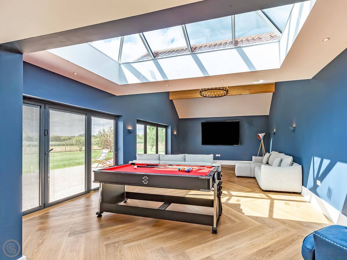 It's got a 5 Star rating. It's a high-spec place. The main living area has a vaulted ceiling and big bifold doors that open to the garden. The kitchen is well equipped. There's a separate games barn with table tennis.