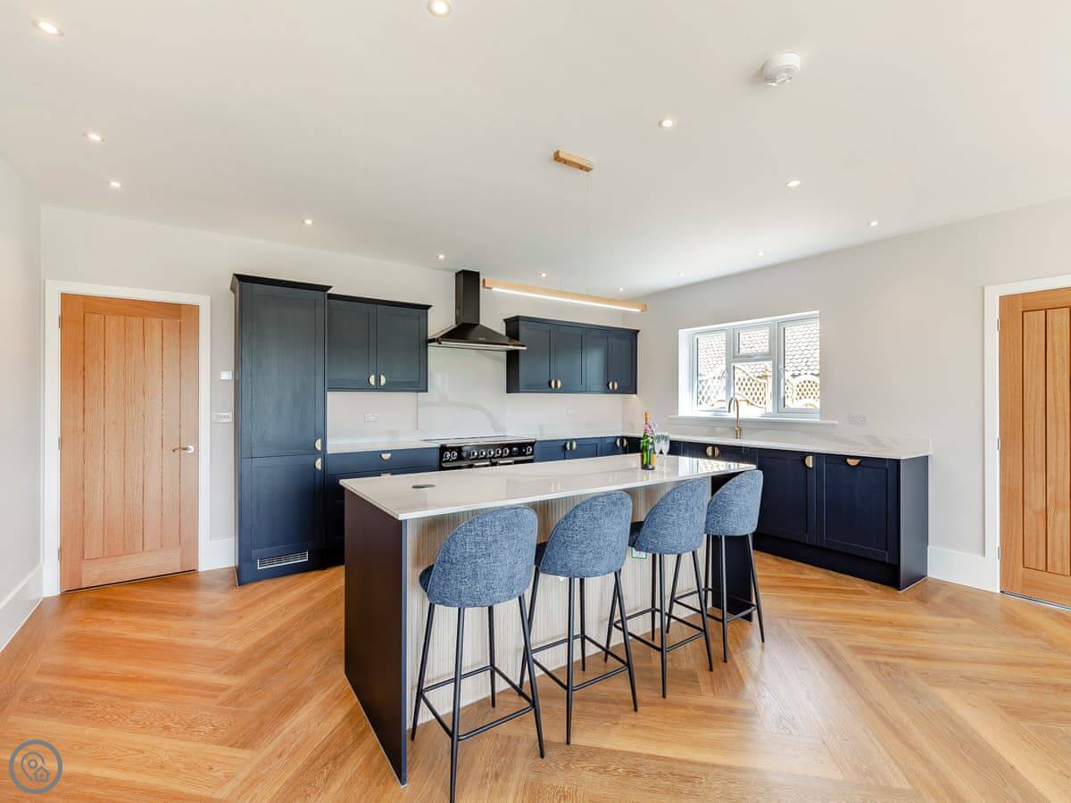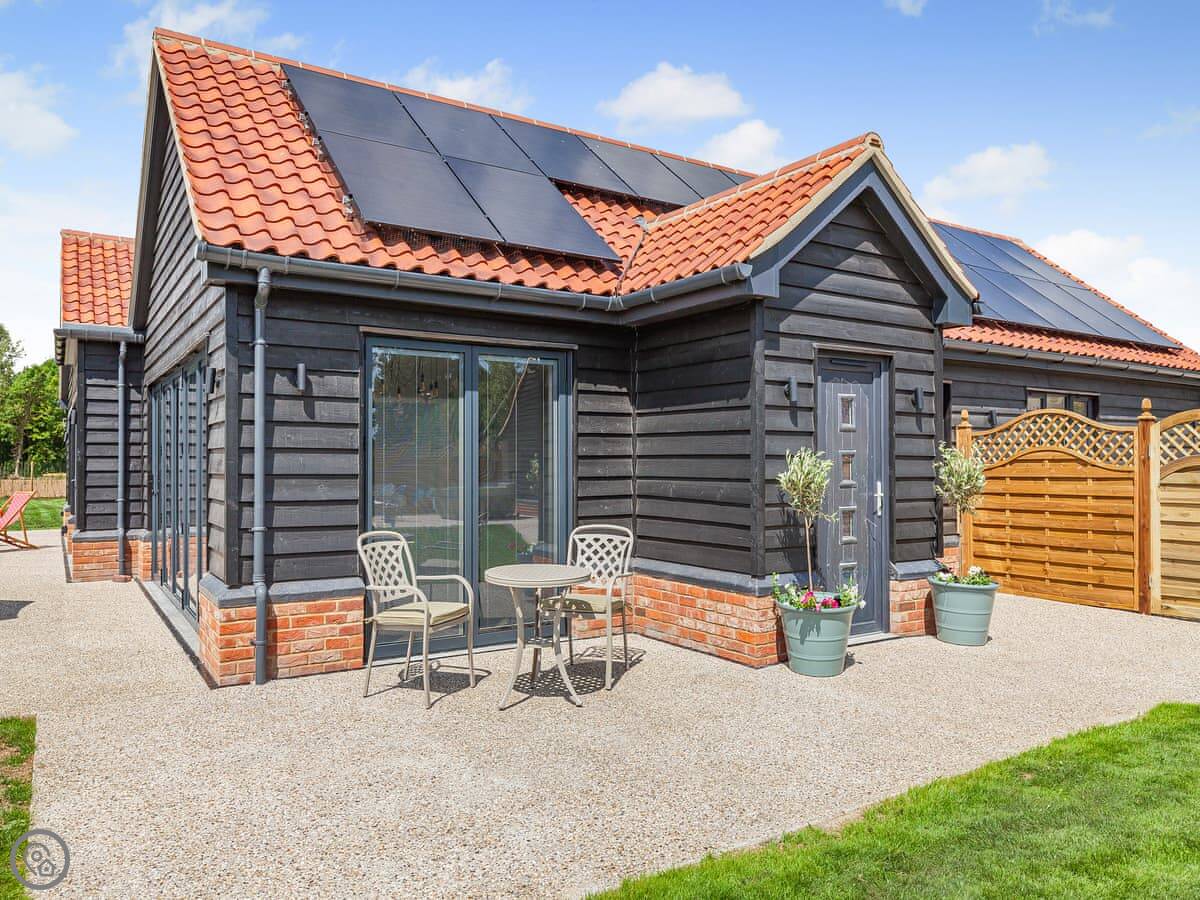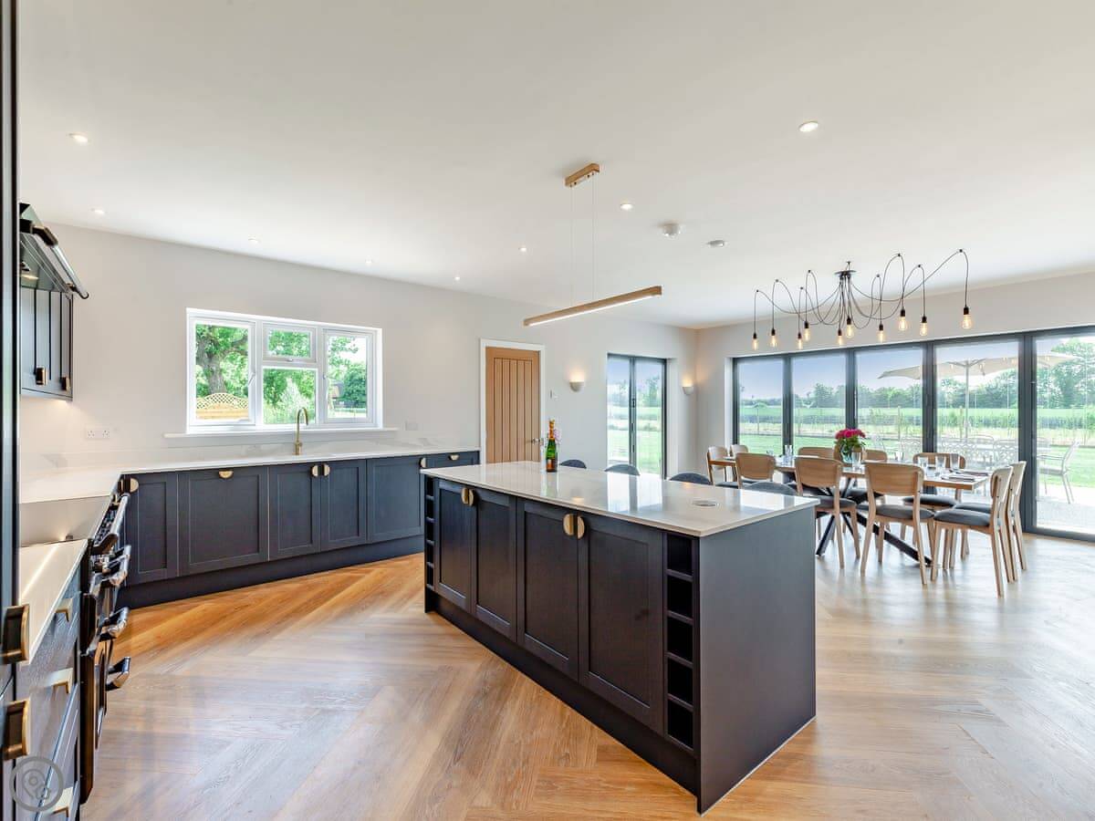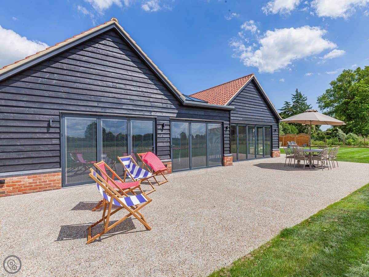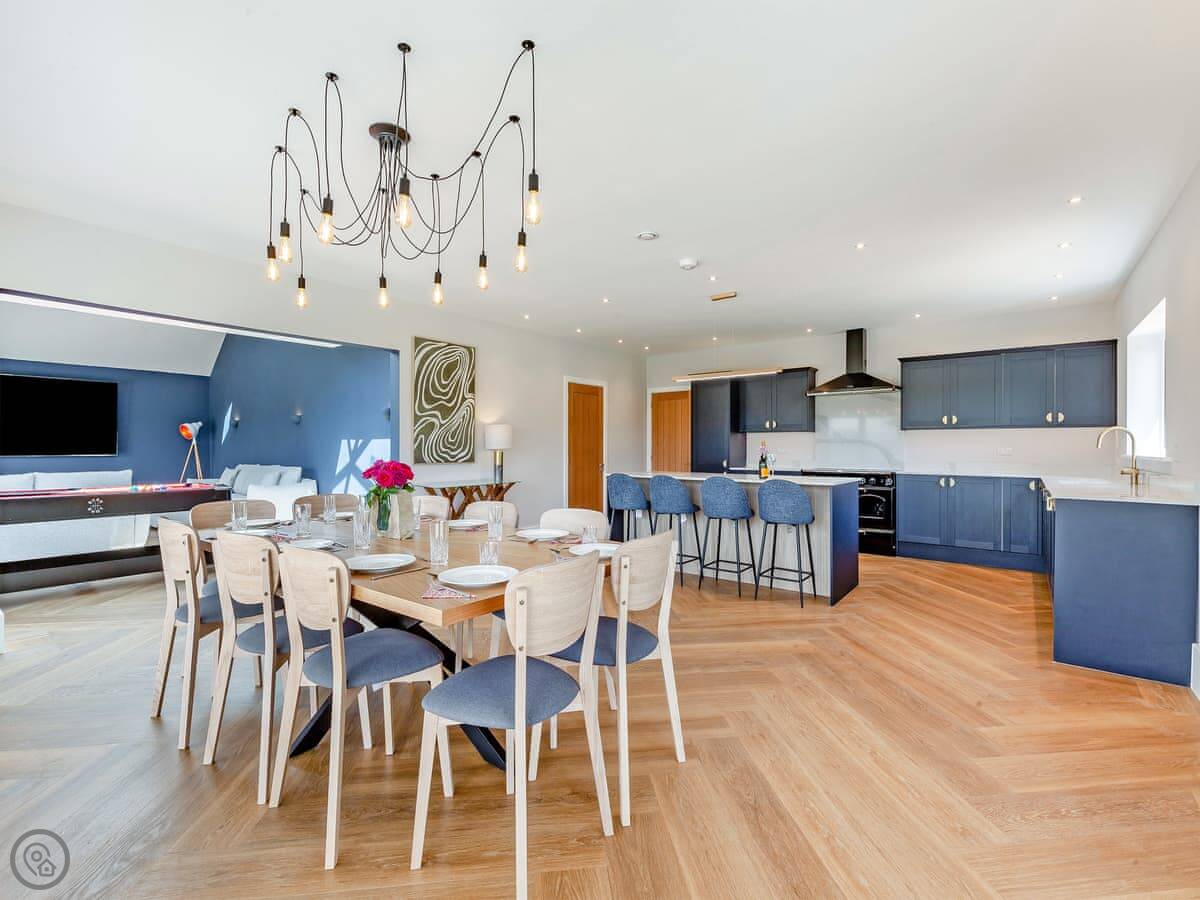 It's got a 5 Star rating. It's a high-spec place. The main living area has a vaulted ceiling and big bifold doors that open to the garden. The kitchen is well equipped. There's a separate games barn with table tennis.