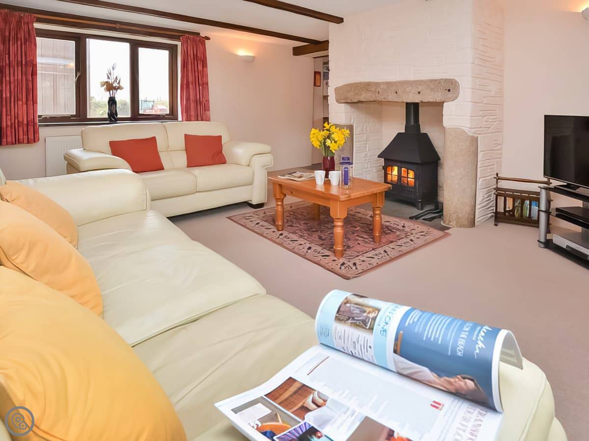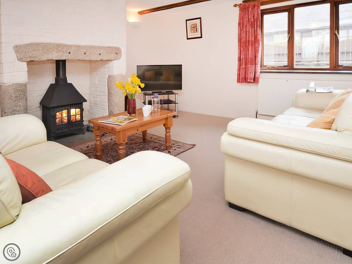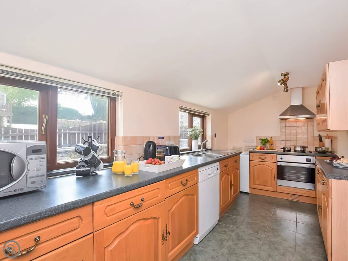 The kitchen has what you need, including a dishwasher and washing machine. The living room has a wood burner in the old granite fireplace. We provide the first bag of logs. There's a Smart TV and WiFi. The stairs are fairly steep, as you'd expect.