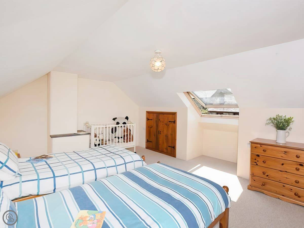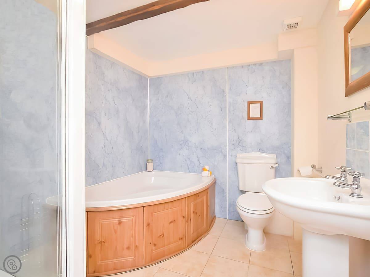 There's one bedroom downstairs with a bathroom next to it. That bathroom has a corner bath and a separate shower. Upstairs is a bit tighter, you've got a kingsize bedroom with its own shower room, then a twin room.