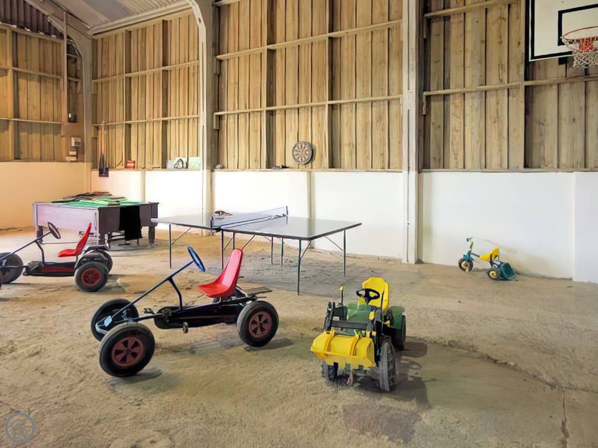 Outside, there's a private patio with a table and a BBQ. You can use the farm grounds. There's coarse fishing in the pond, a tennis court, and a games room in the old barn. The kids can see the alpacas and sometimes help feed the lambs.