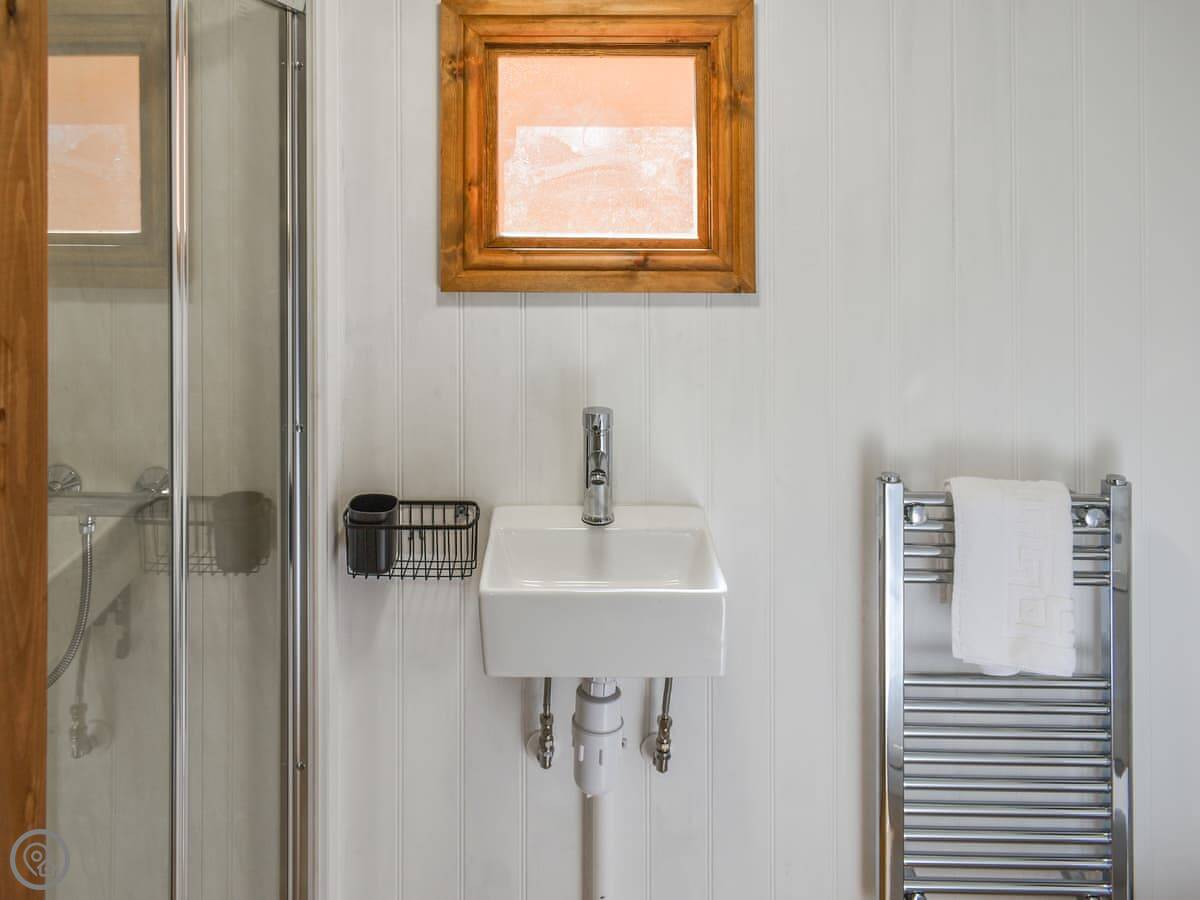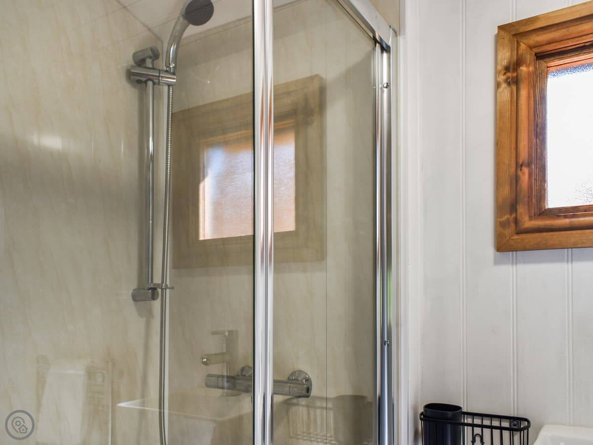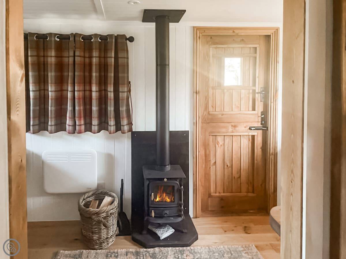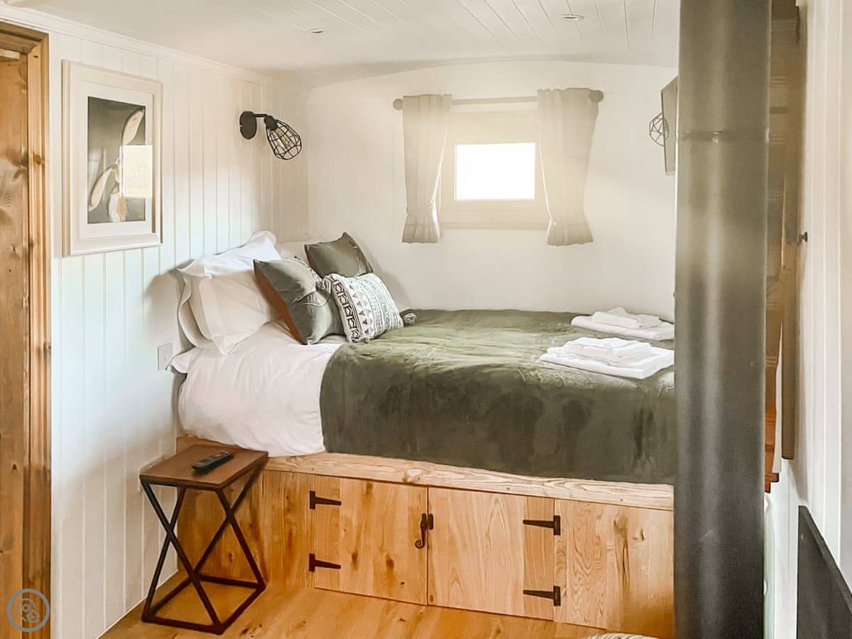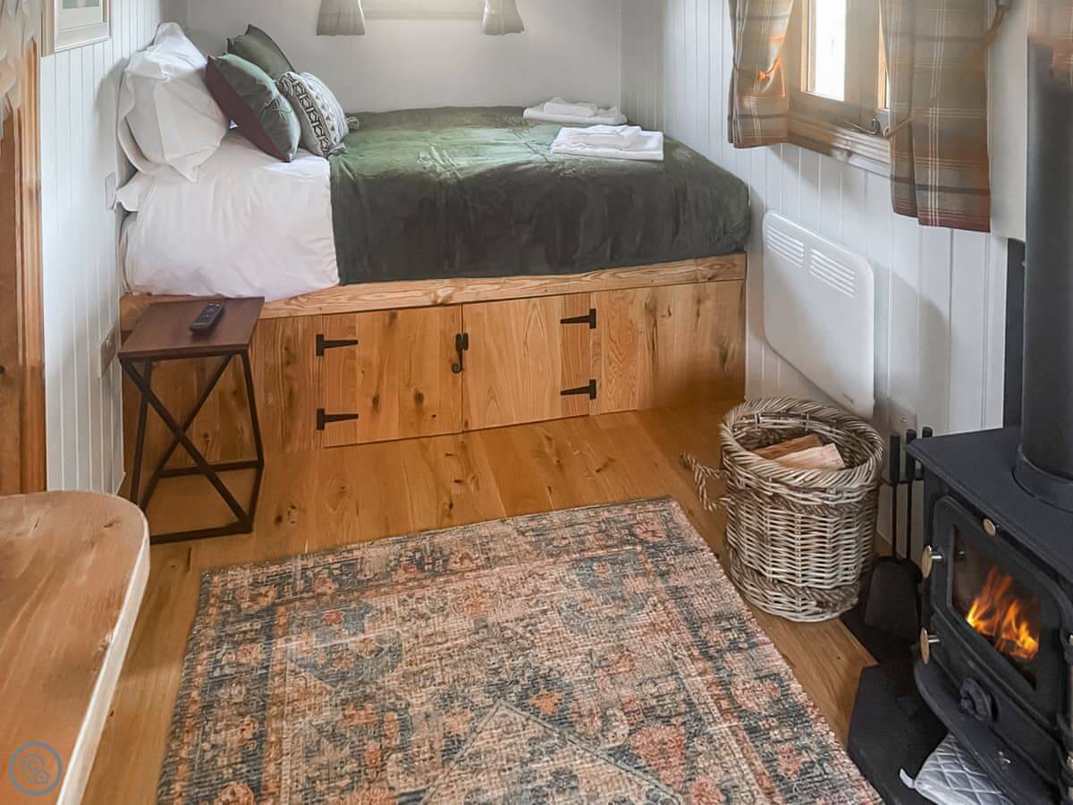 It's a shepherds hut, so it's one room. There's a double bed, a wood burner, a TV, and a kitchen area. The shower and toilet are in a separate little hut right next to it. Everything you need is there, it's just compact. It's got a 4 Star rating.