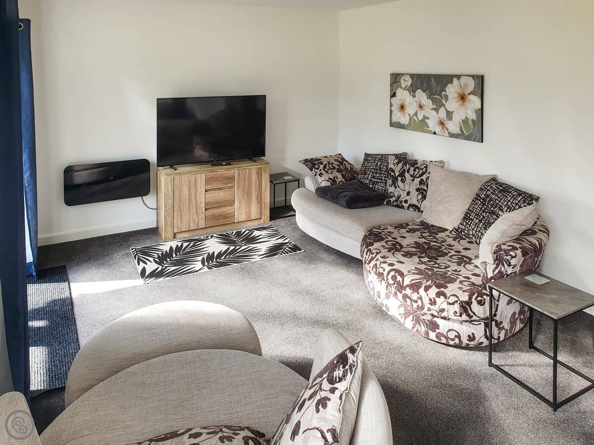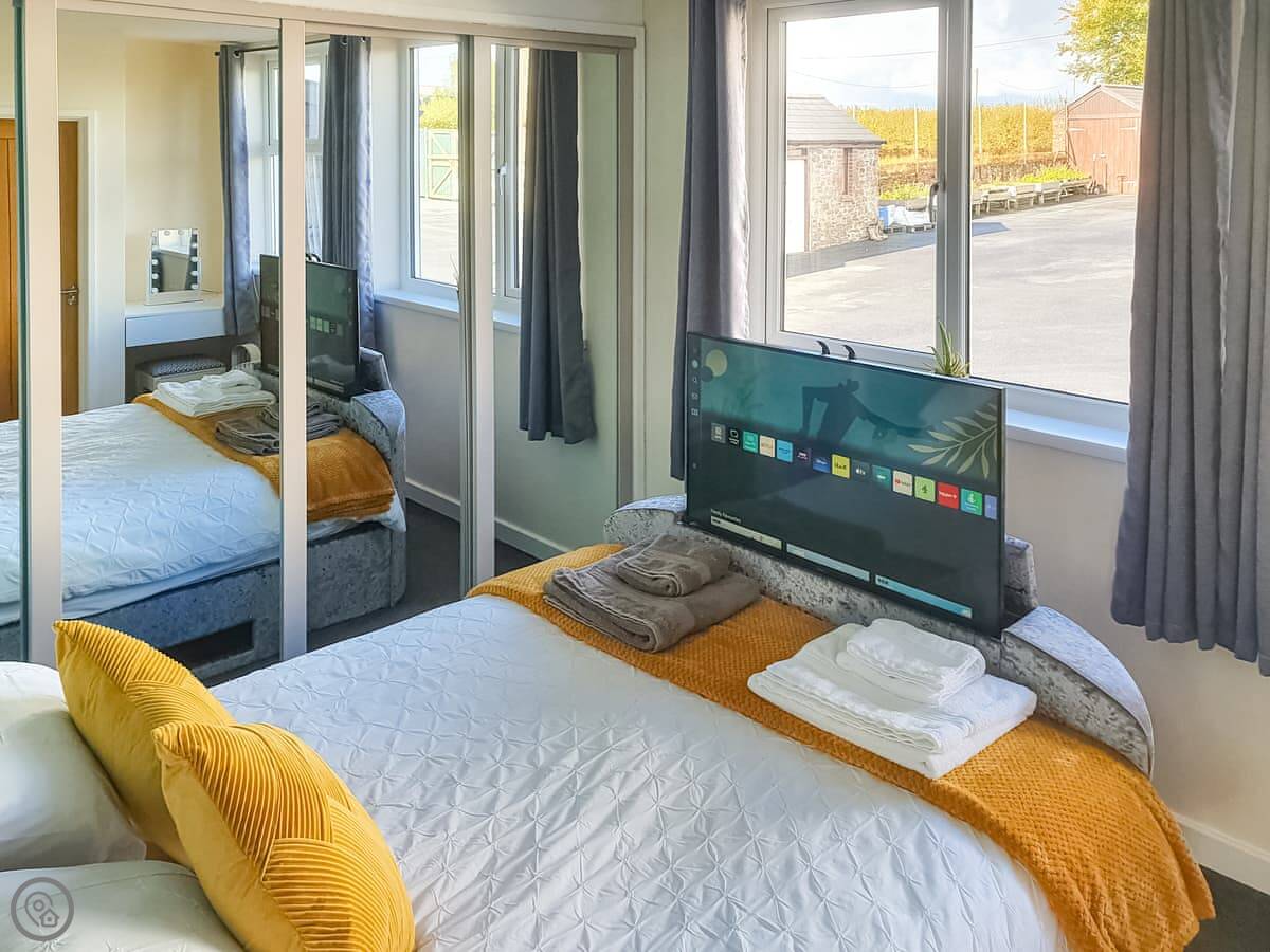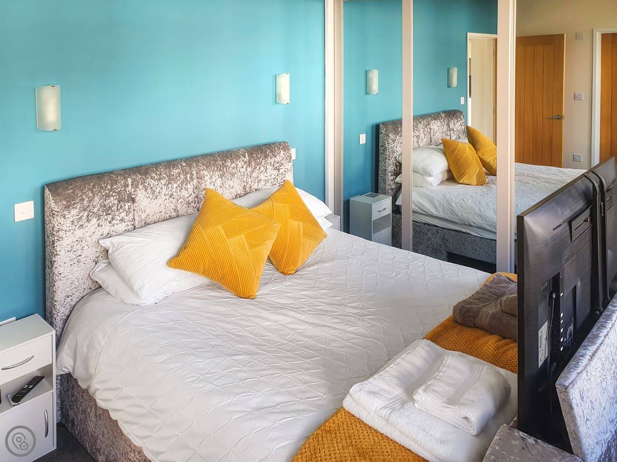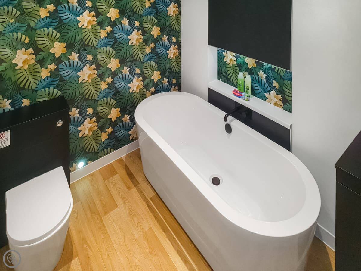 The bedroom has a kingsize bed. There's a TV in the footboard, which people either love or find a bit unnecessary. The bathroom has a bath and a separate shower cubicle.