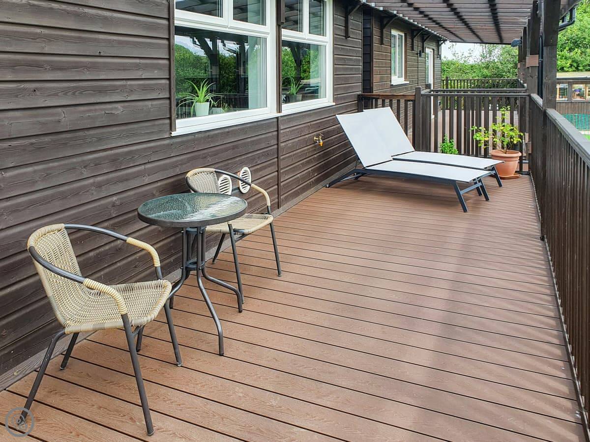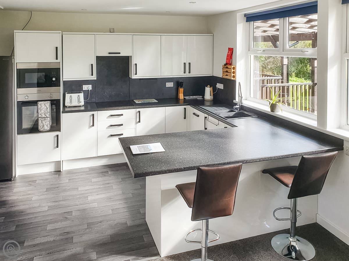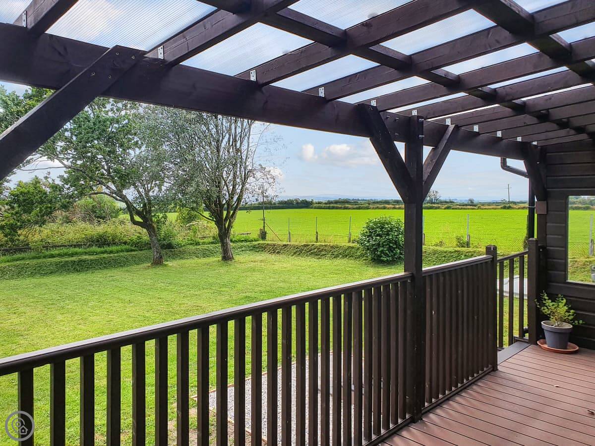 Inside is open plan. There's a kitchen, a breakfast bar, and a sitting area. Doors open out onto a covered terrace. It's sheltered and looks out onto fields.