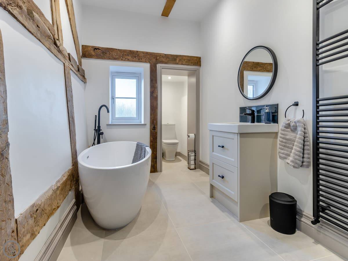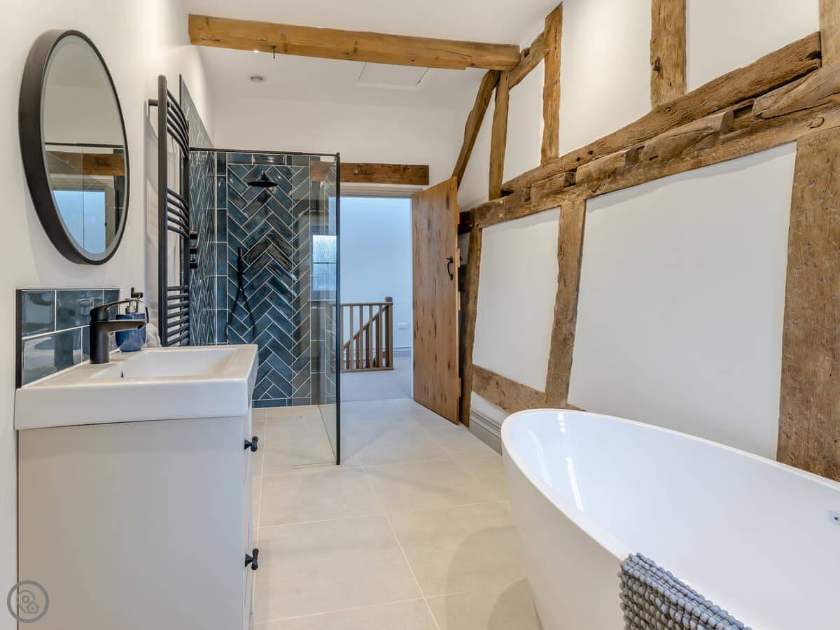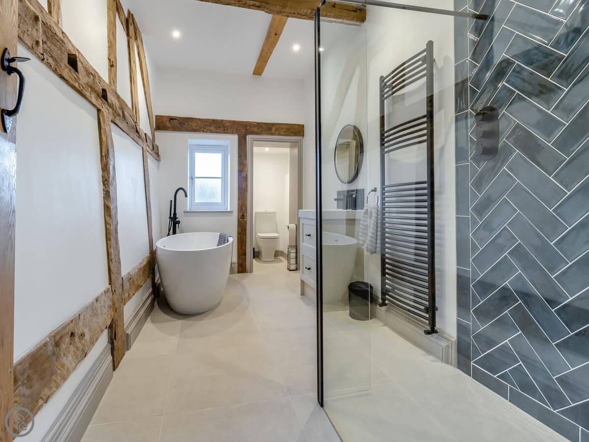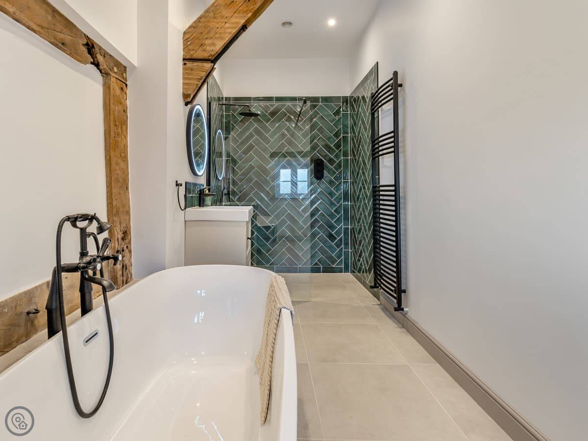 The Farmhouse is in All Stretton, just outside Church Stretton. It's a detached house. Sleeps eight, has four bedrooms and three bathrooms. It's got a 5 Star rating. You can bring one dog.