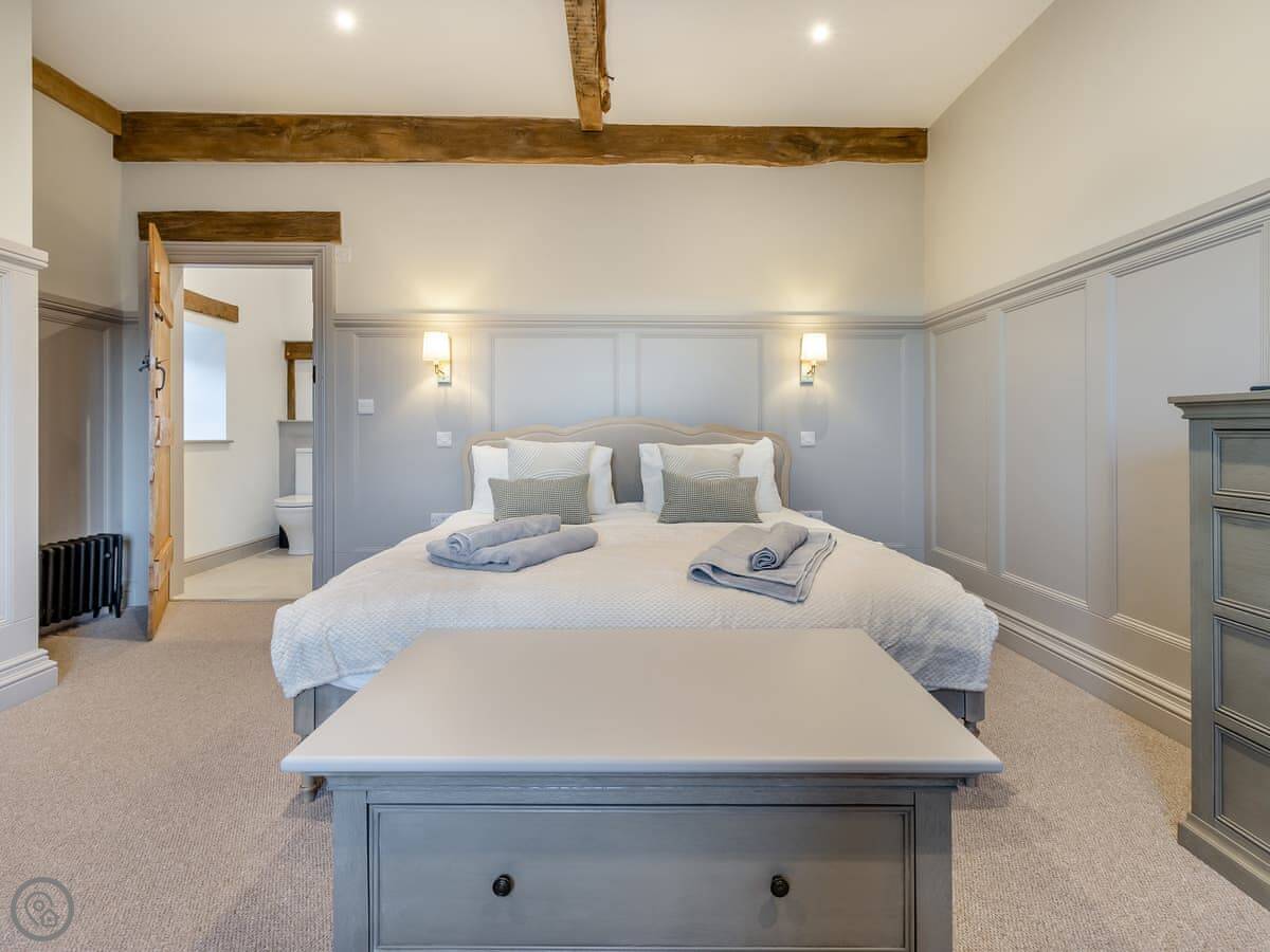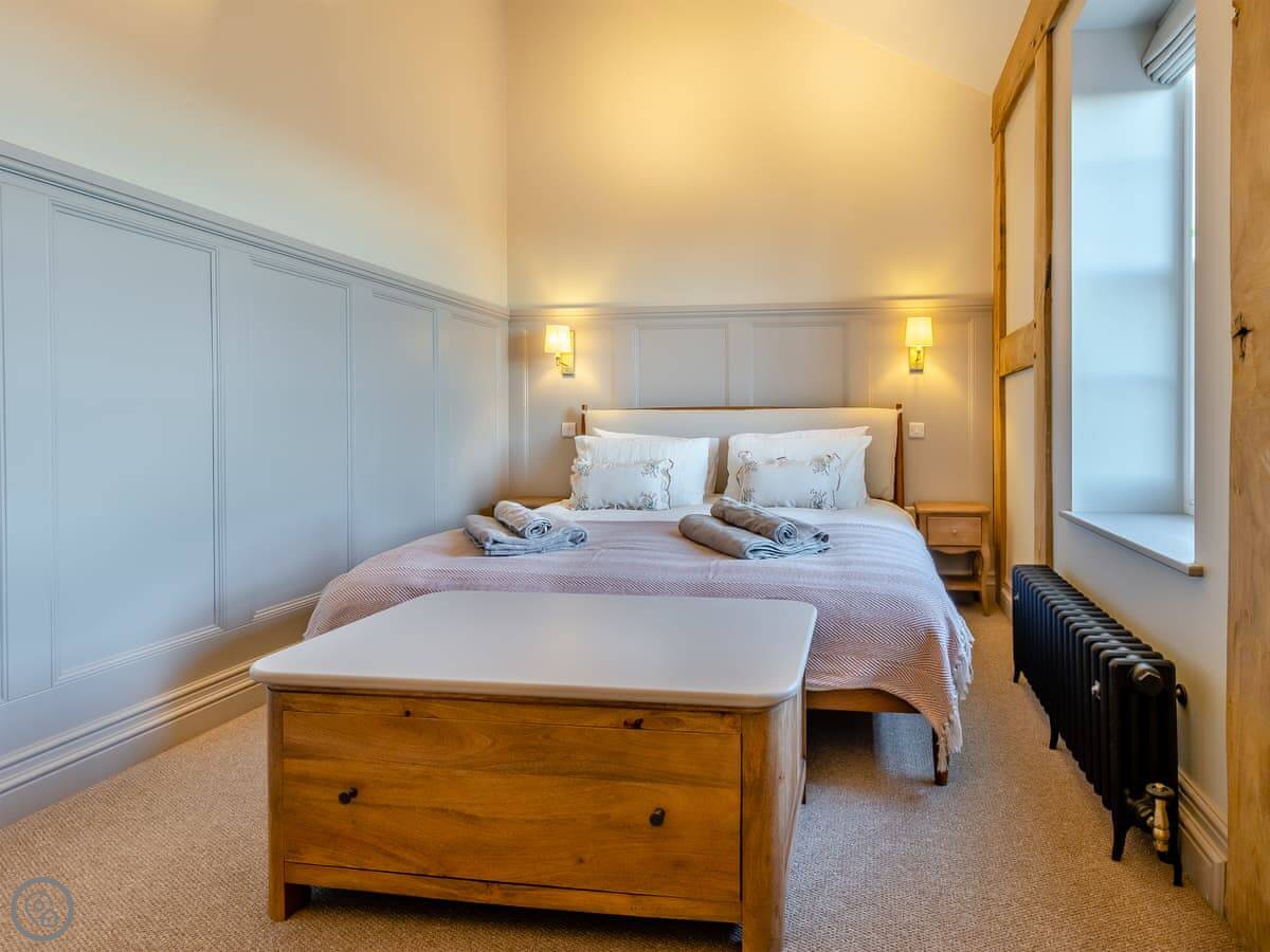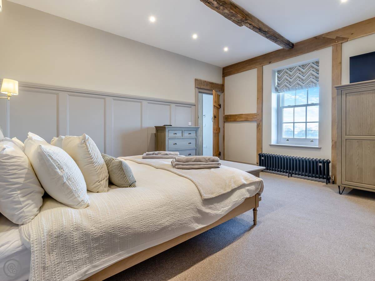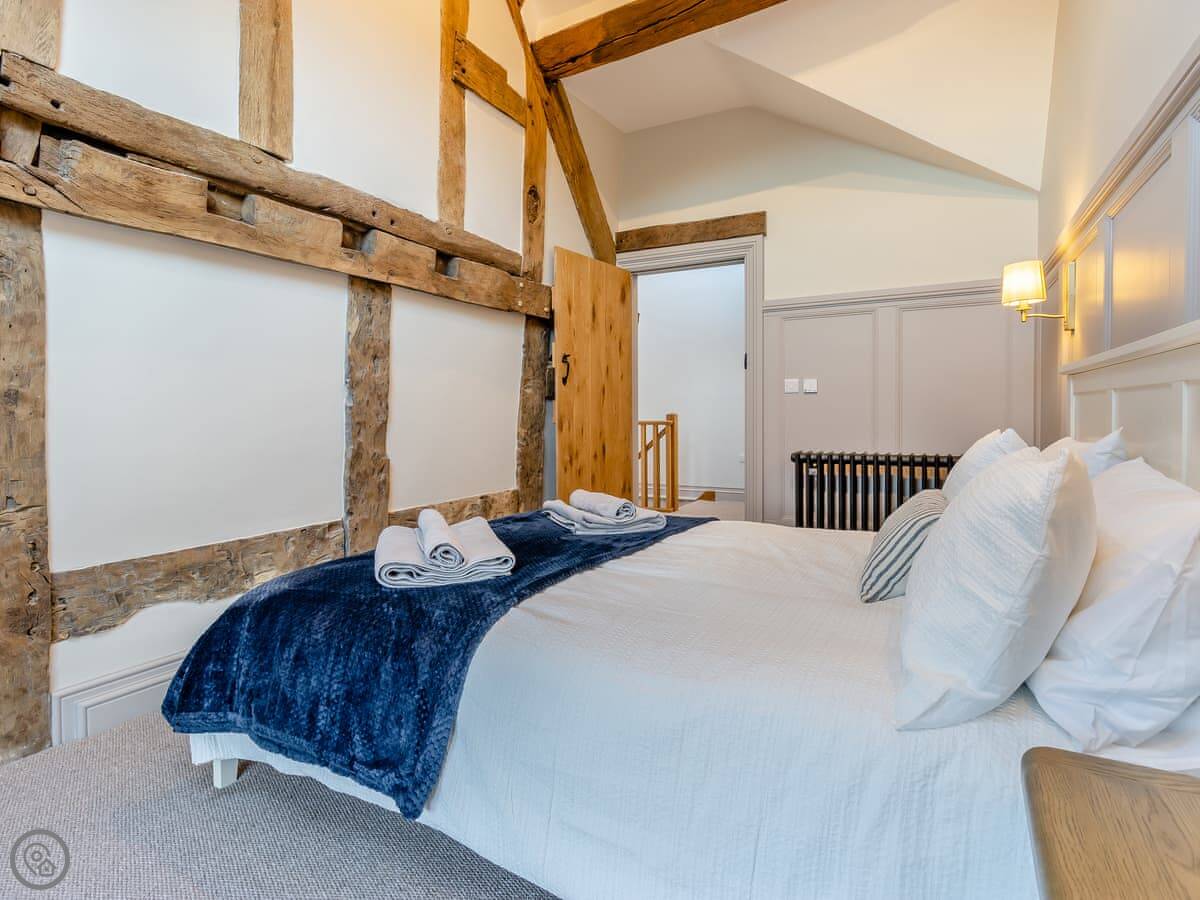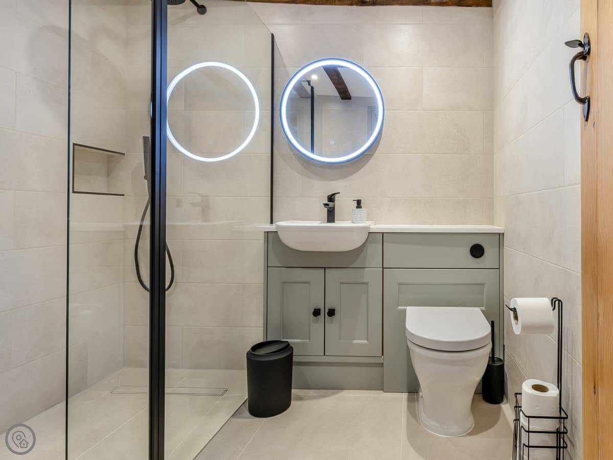 The Farmhouse is in All Stretton, just outside Church Stretton. It's a detached house. Sleeps eight, has four bedrooms and three bathrooms. It's got a 5 Star rating. You can bring one dog.