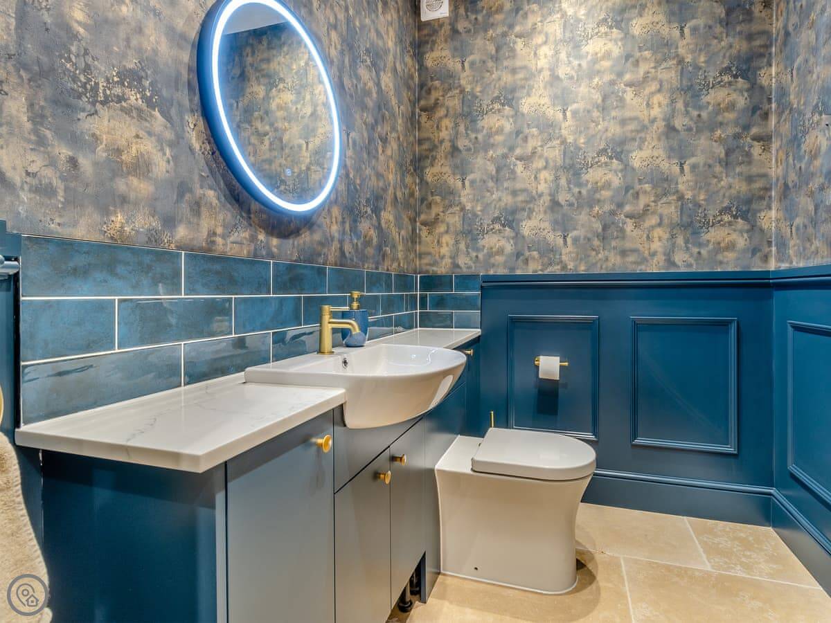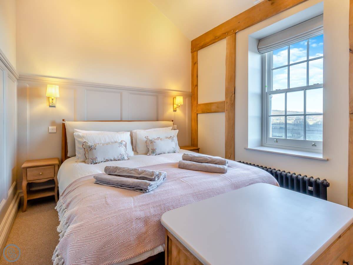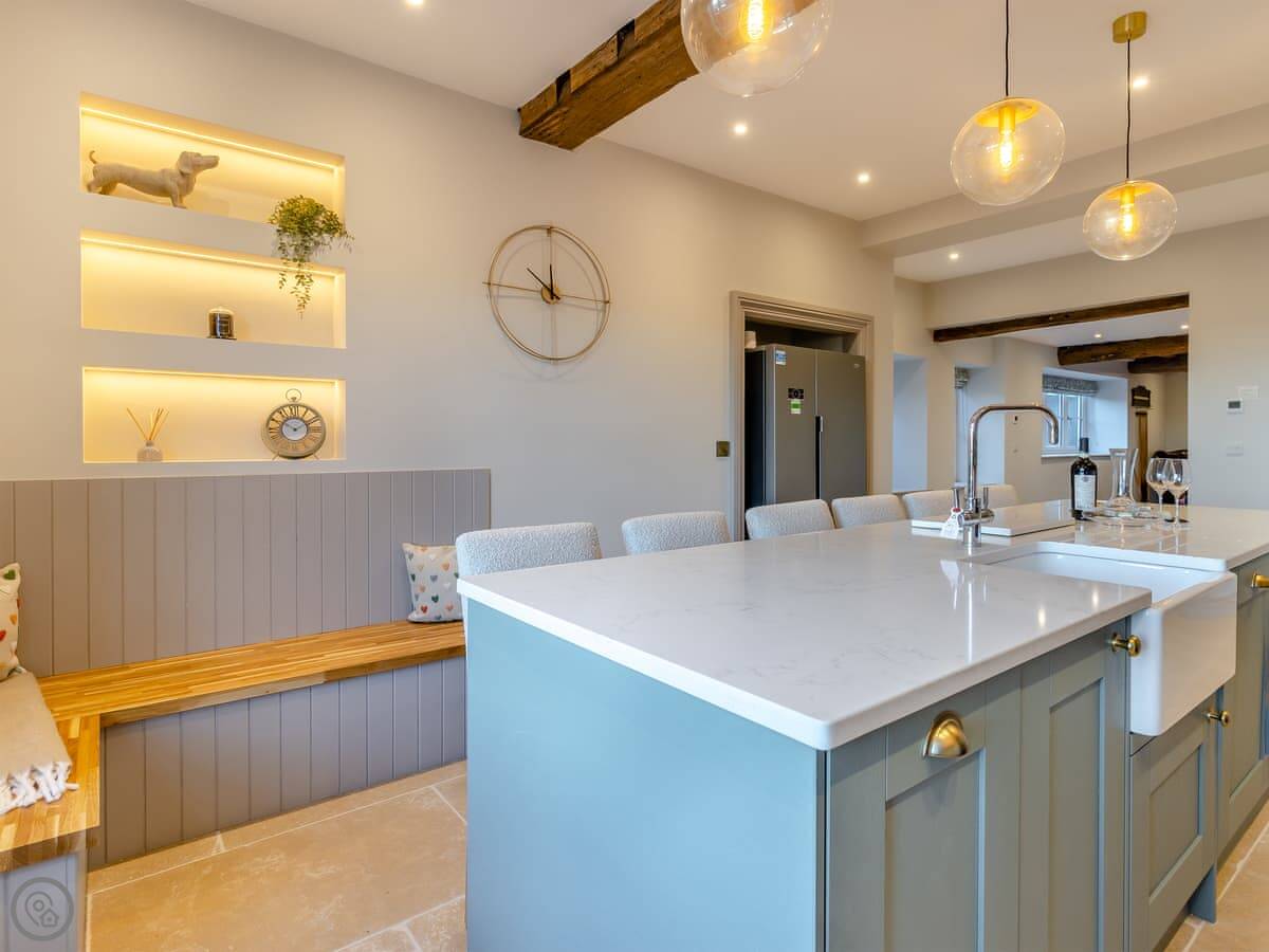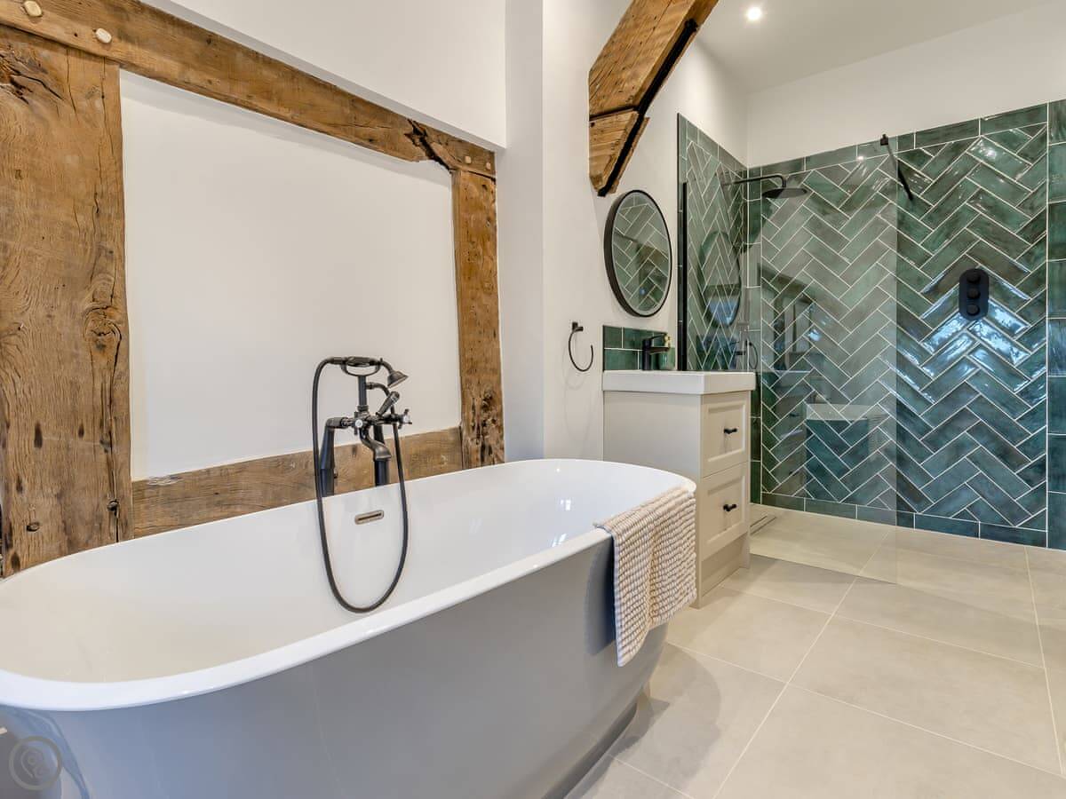 The Farmhouse is in All Stretton, just outside Church Stretton. It's a detached house. Sleeps eight, has four bedrooms and three bathrooms. It's got a 5 Star rating. You can bring one dog.