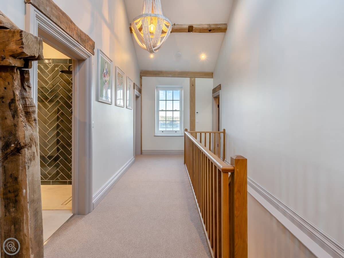 The stairs are fine. The bedrooms are spread over two floors. Two of the bathrooms are upstairs, and there's a downstairs loo. All bedding and towels are included. There's a washing machine, dishwasher, cot and highchair. Parking is on site.