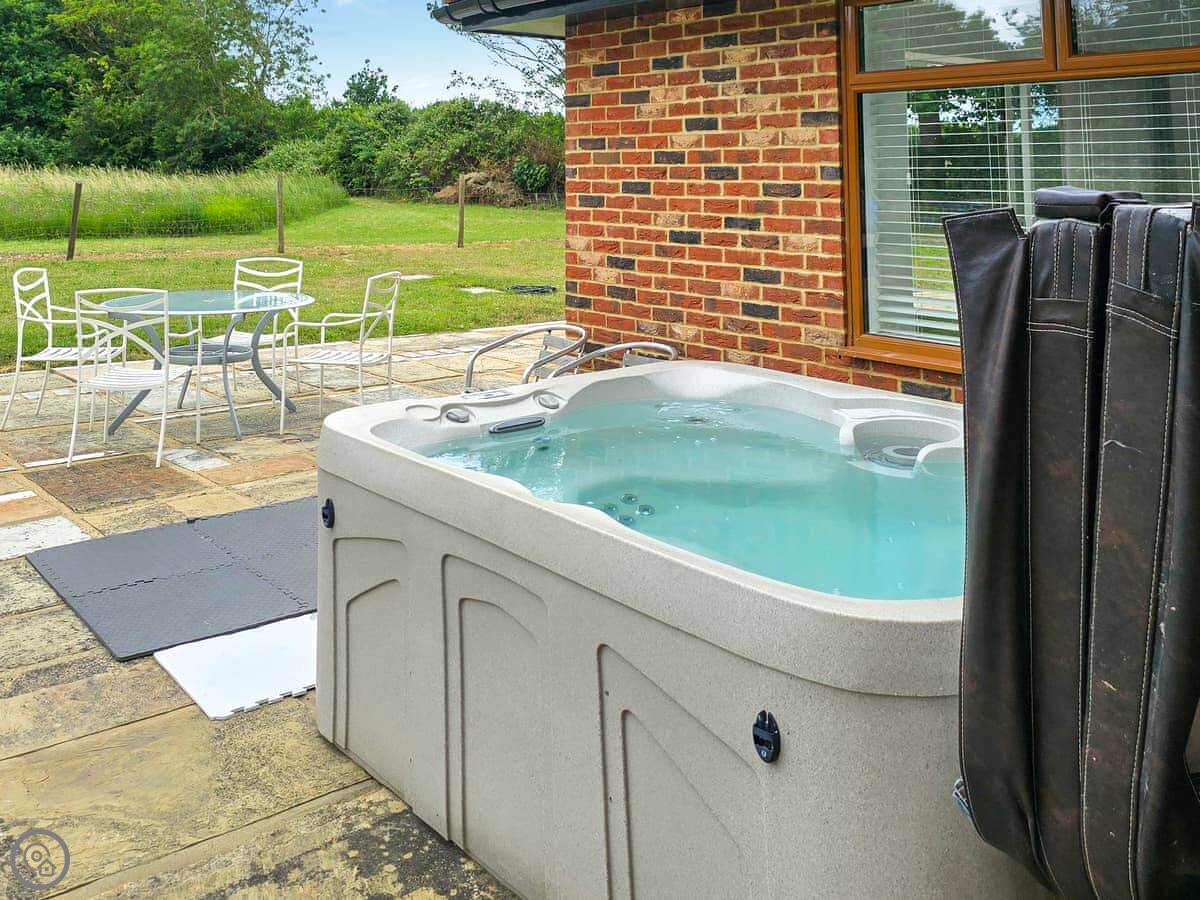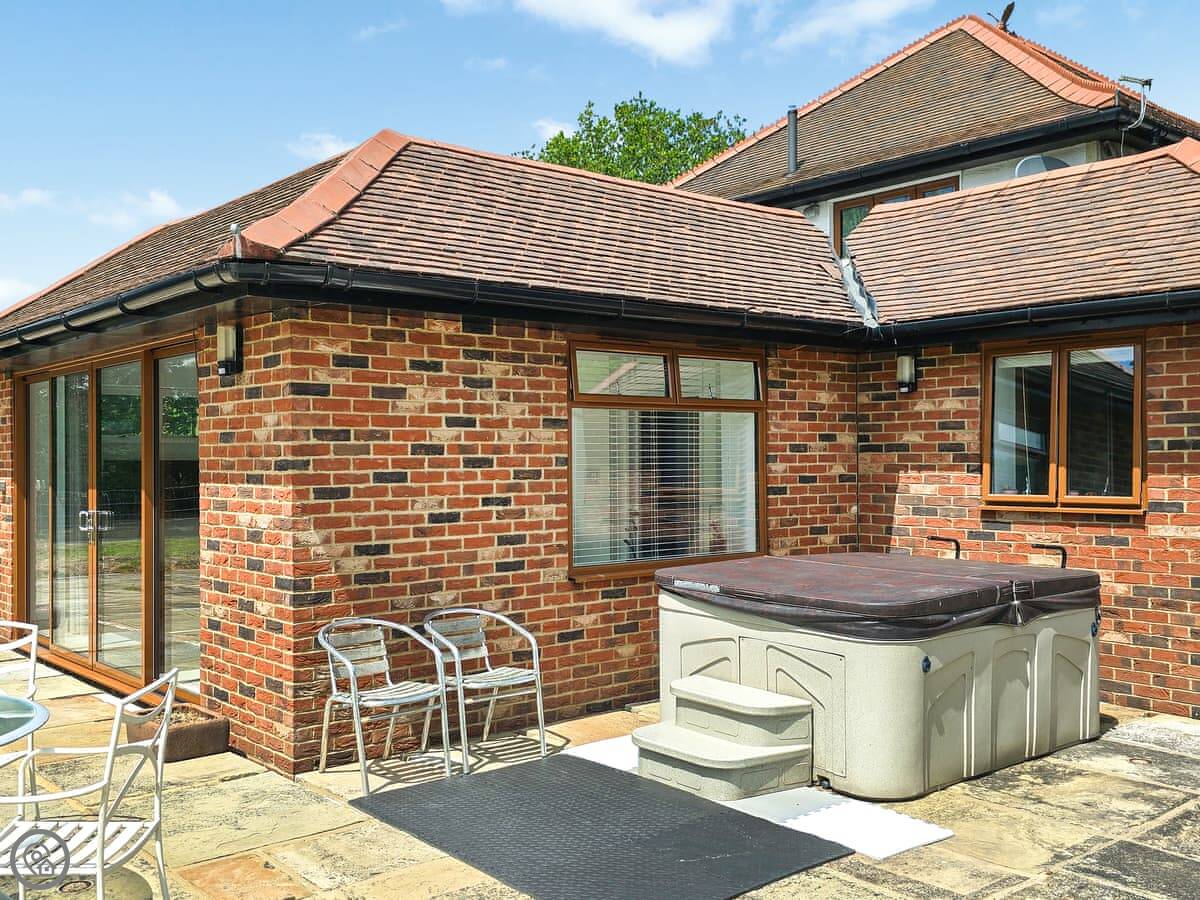 Outside, there's a private patio area with a table and chairs. You can sit out there. Further down the garden there's a hot tub you're welcome to use.