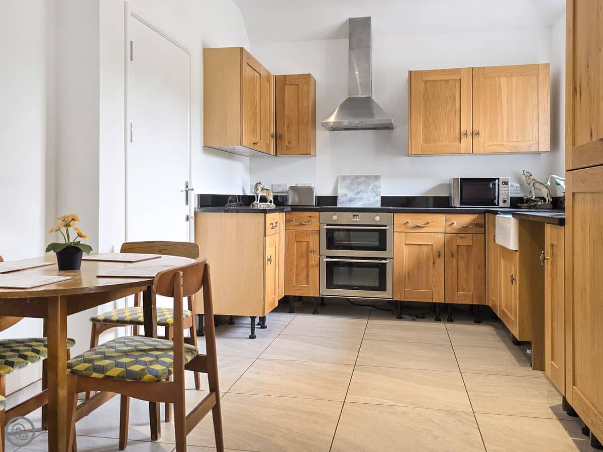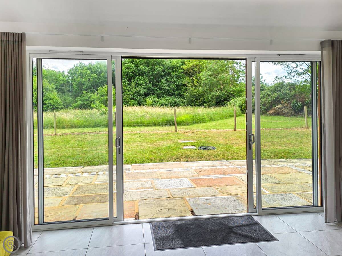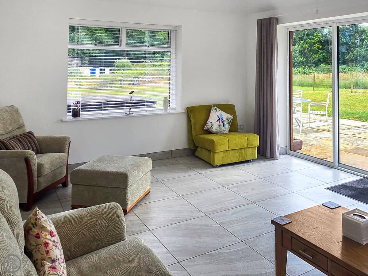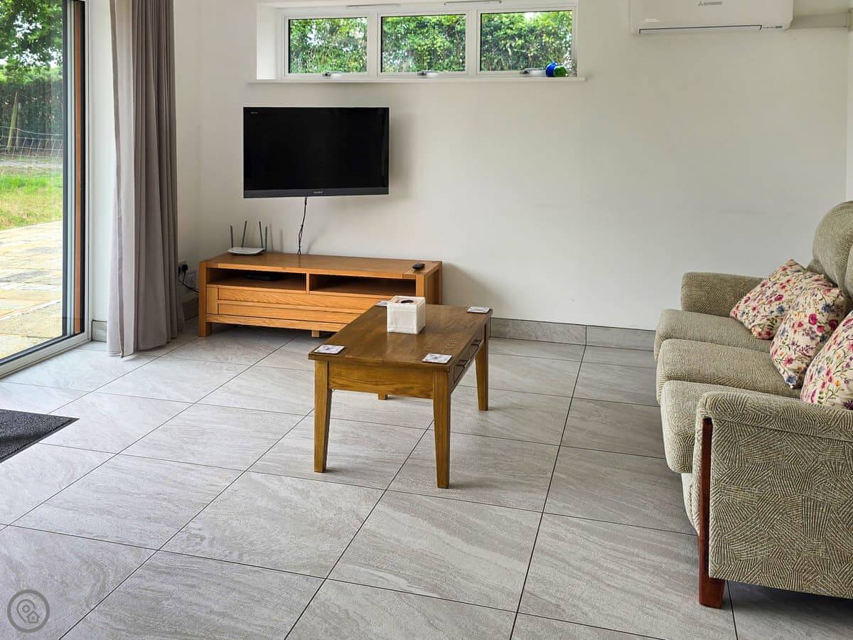 You've got your own front door. Inside, the ceilings are high so it feels more spacious than you might expect. The main room has a sofa, TV, a small kitchen area, and a table. There are large windows looking out onto the garden and the woods. We see foxes and pheasants out there, and sometimes deer in the field beyond.
