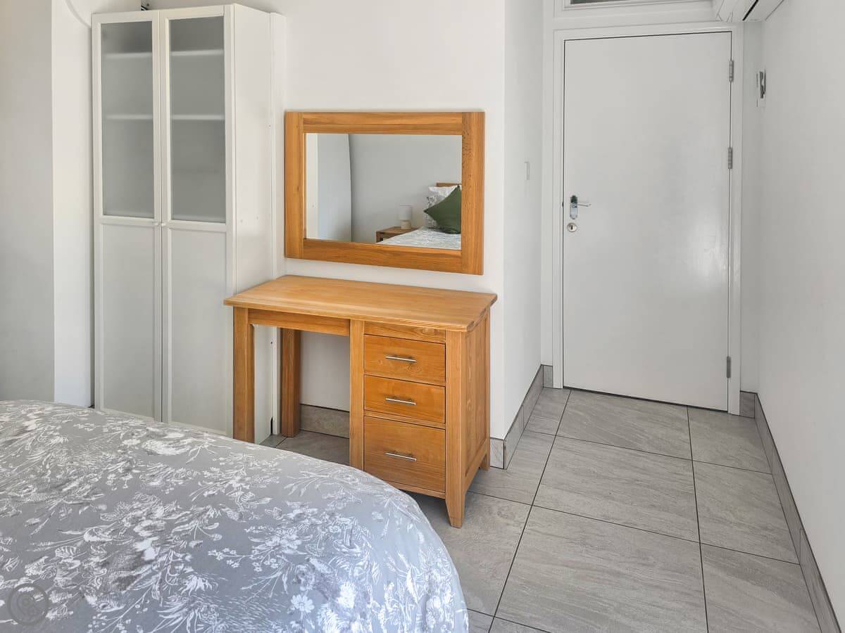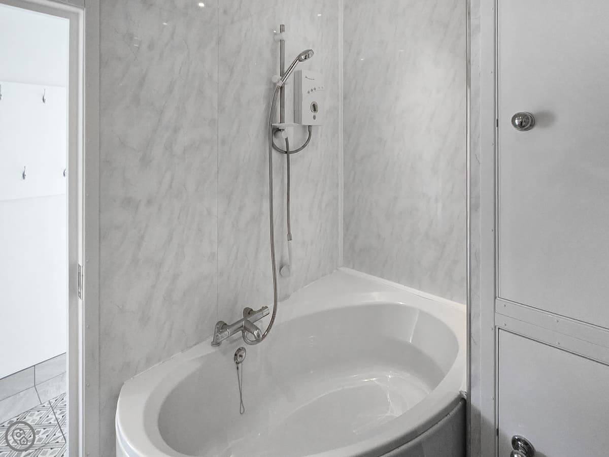 The bedroom has a double bed and air conditioning. The bathroom is a wet room, so it's all one level. That's handy.