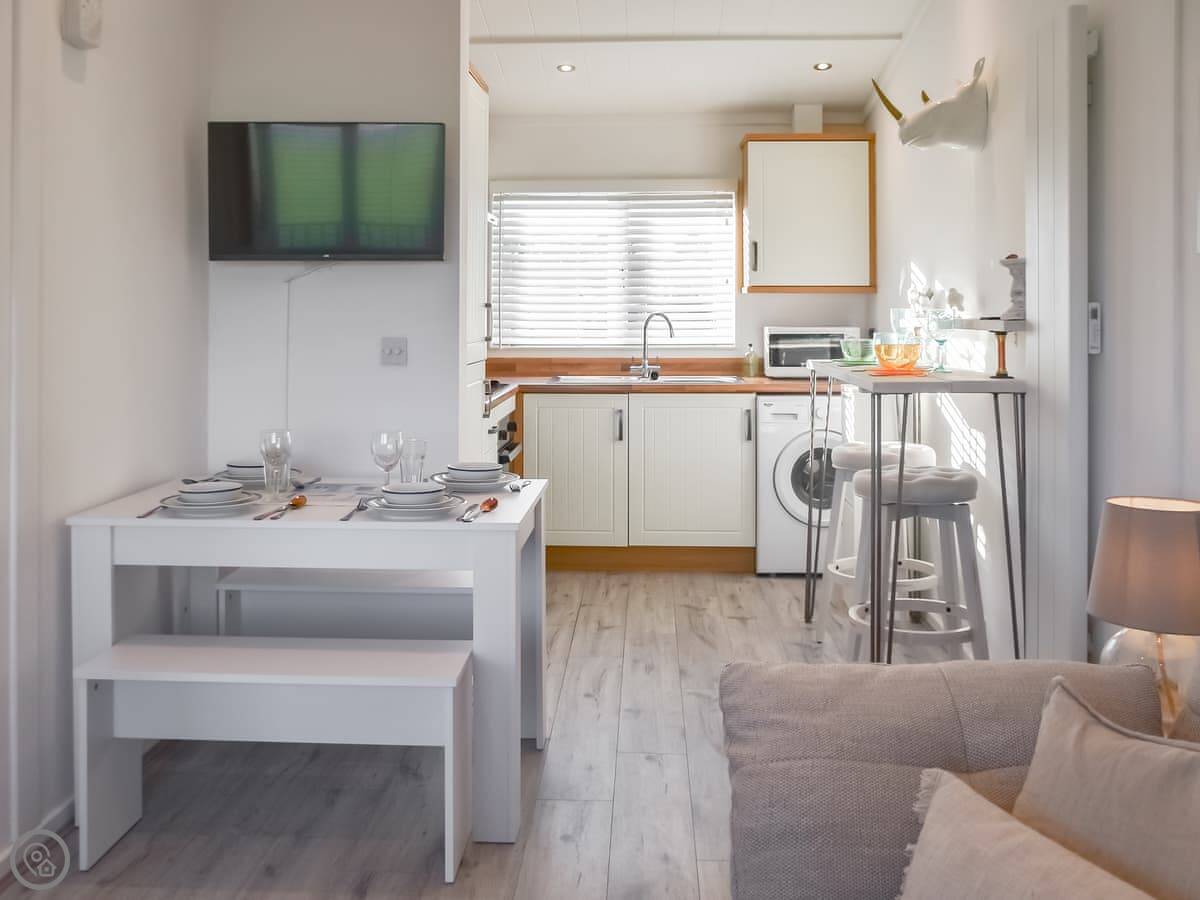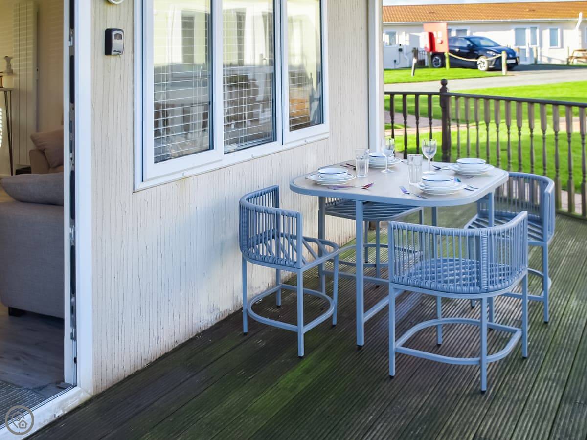 The living area is all open-plan. Big windows for the view. There's a TV, WiFi, and the basics in the kitchen. You get your own patio area with seating out the front, which is all yours. Parking is right outside.