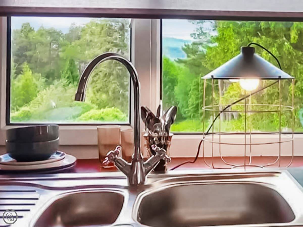 Because it's a listed building, the ceilings are high and the windows are big. You get a good view of the fields out the back. It's a decent size for two people. Everything is open plan, so the bed, kitchen and sitting area are all in one room.