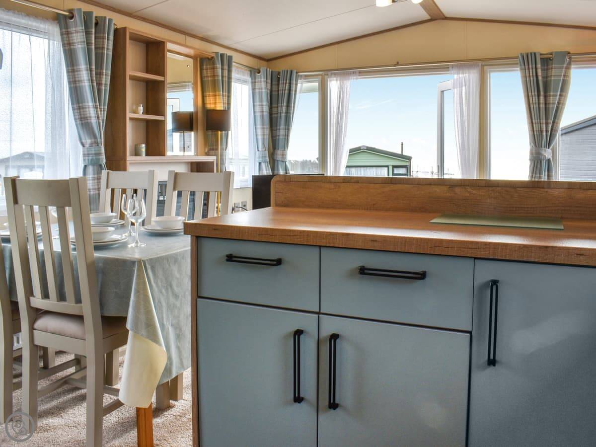 It sleeps six in three bedrooms. One double, two twins. There's one proper bathroom with a shower, and the double room has its own separate toilet. It's open plan inside, so the kitchen, dining and living area are all one space. Doors open onto the deck.
