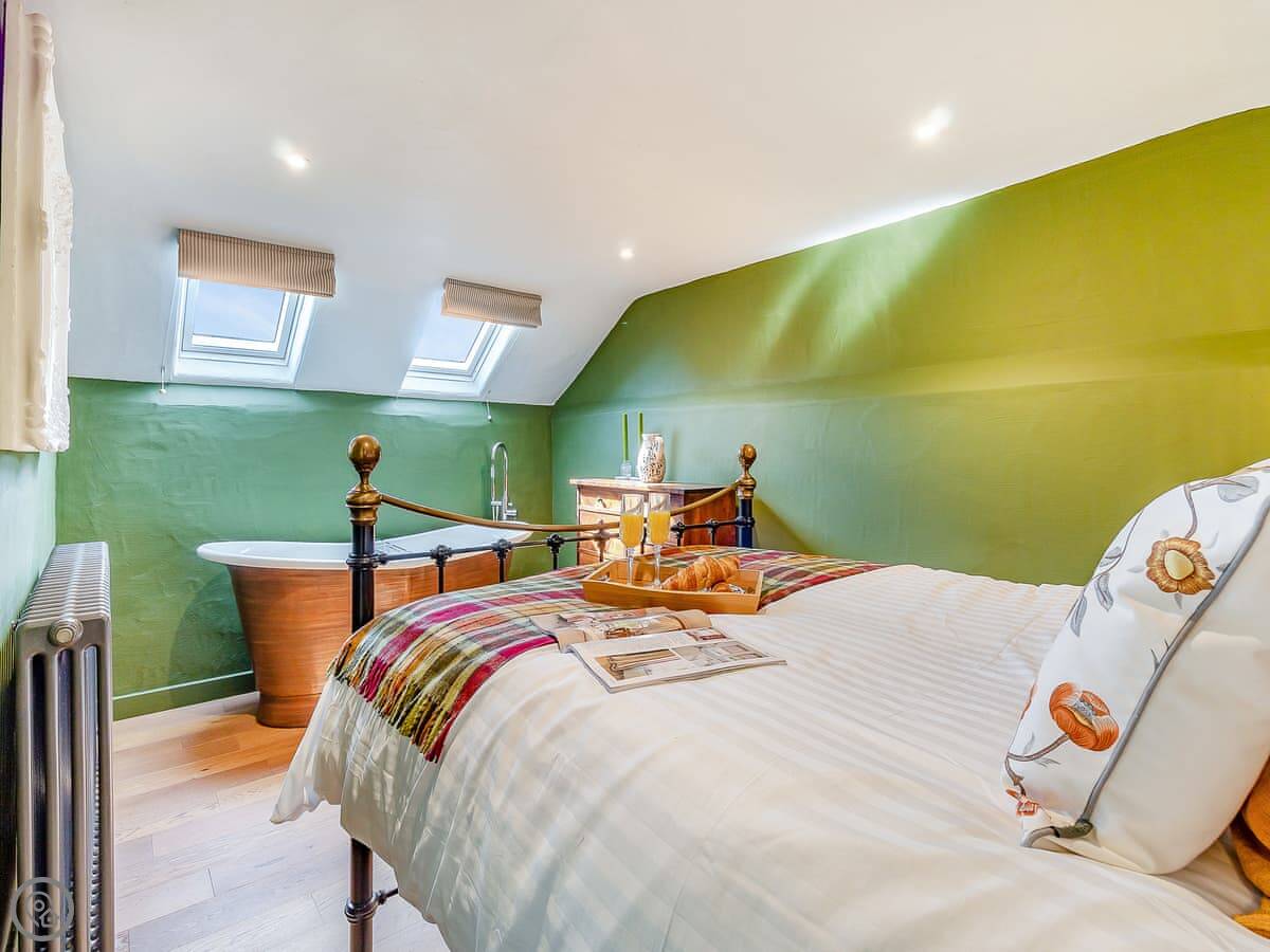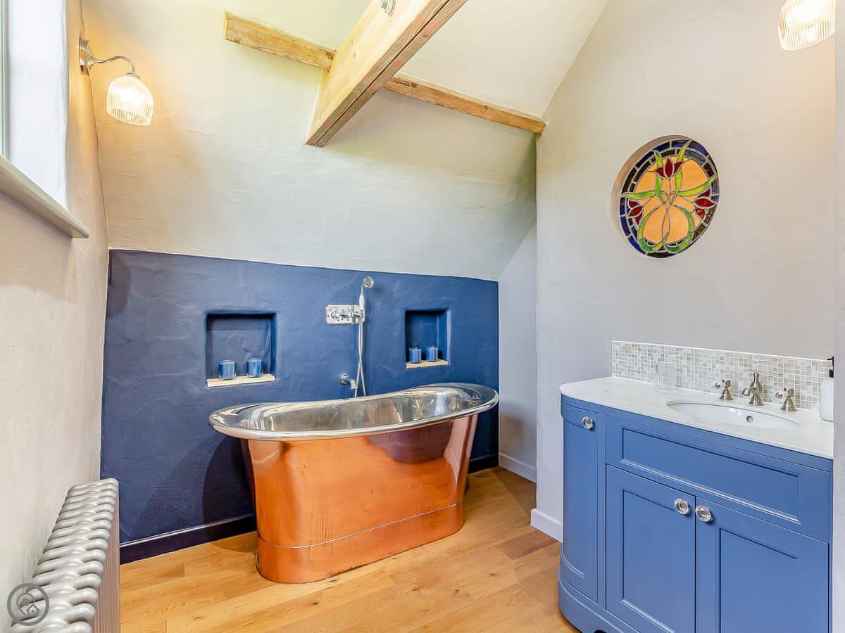 It sleeps eight but there are only three bedrooms. Two are king-size rooms, each with its own staircase. The third bedroom sleeps four, in bunk beds. There are two bathrooms, both have showers and one also has a roll-top bath. There's another roll-top bath in one of the king bedrooms. They're copper.