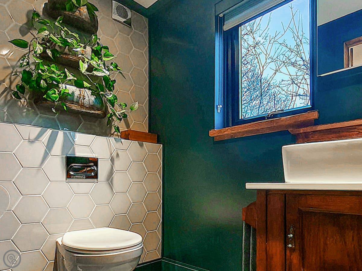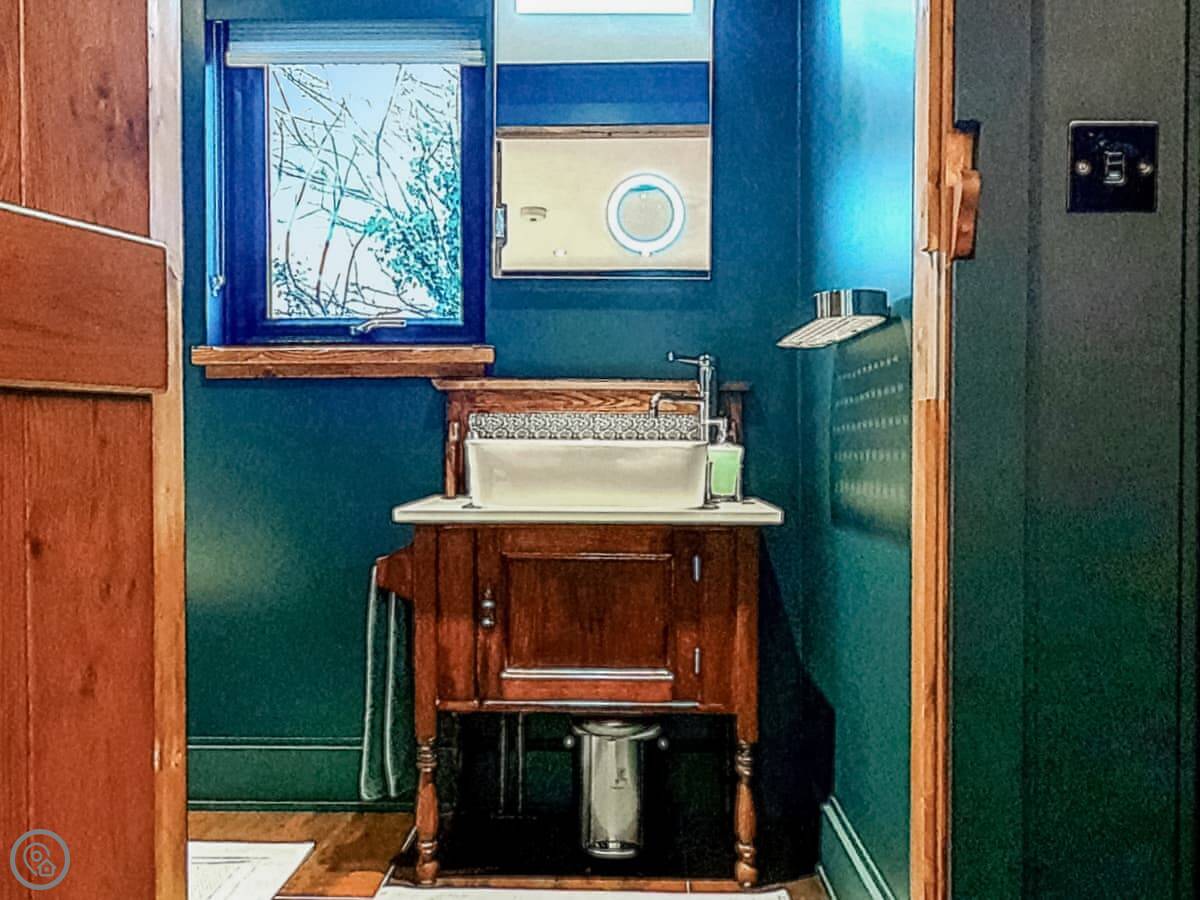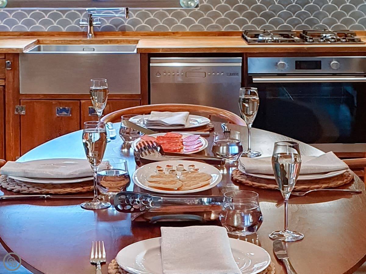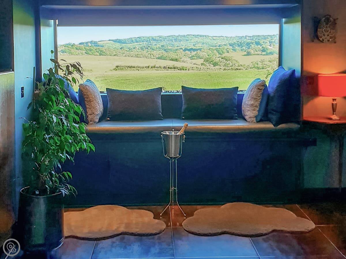 Inside, it's all open-plan downstairs. Big windows looking out at the fields. There's a wood burner, a dishwasher, a washing machine, wifi, and parking right outside. Bedding and towels are included. No pets.