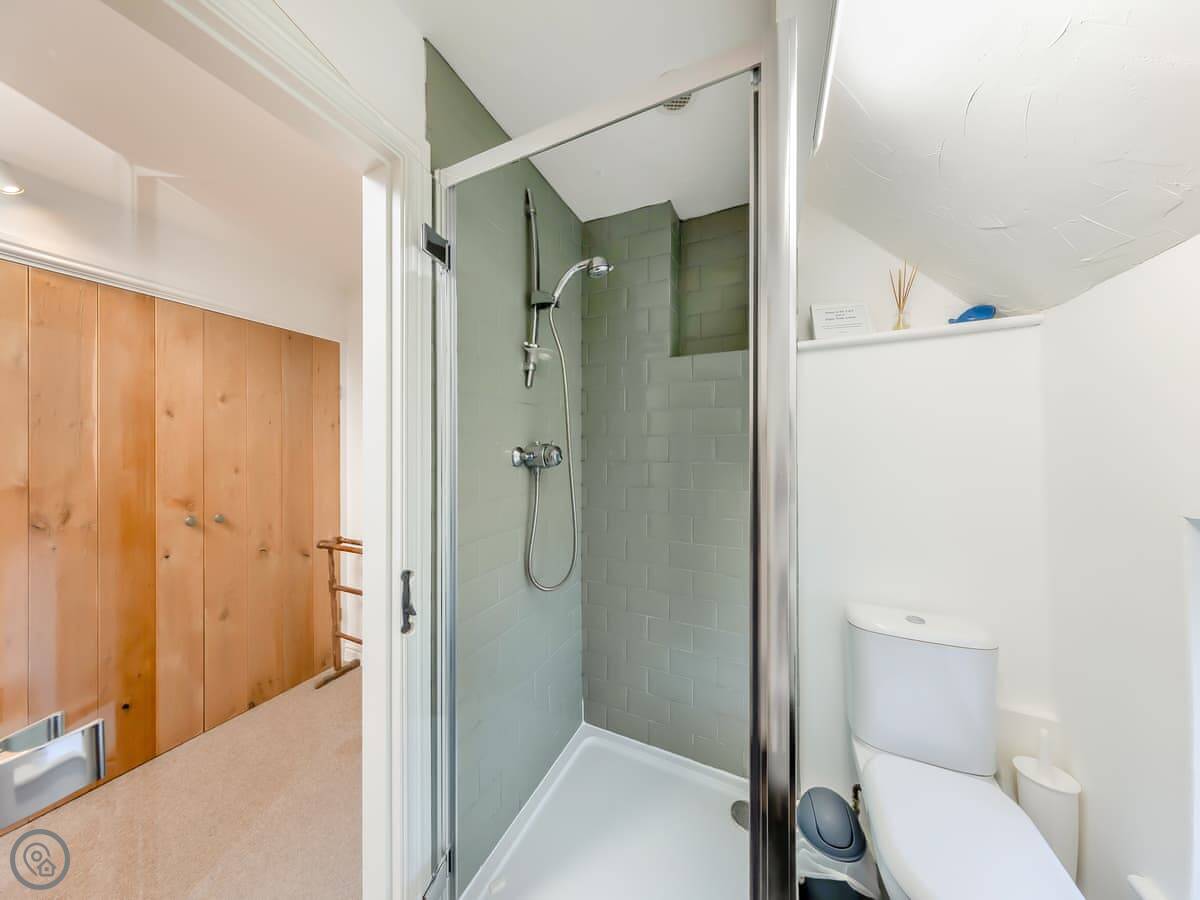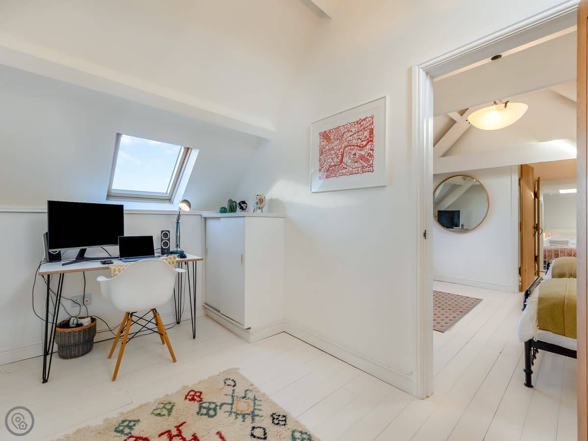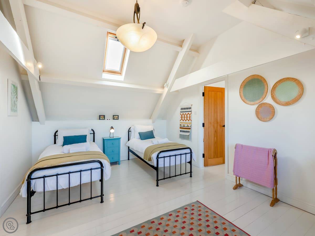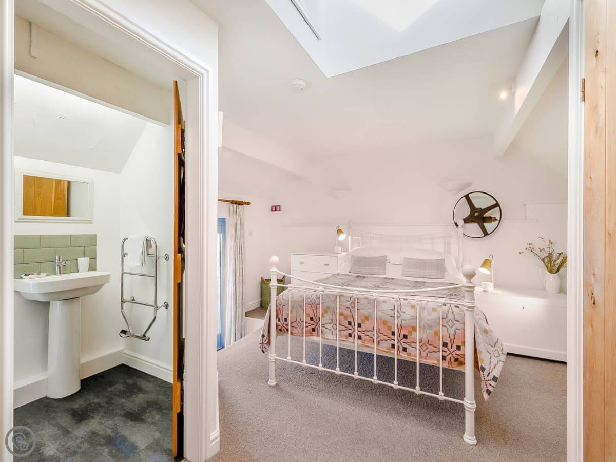 Upstairs is all on one level, but the rooms connect. You go up to a landing, which has a desk. That leads into the twin bedroom. From there, you go through the main bathroom and a dressing area to get to the king-sized bedroom, which has its own ensuite shower. It works fine, just not a standard hallway layout.