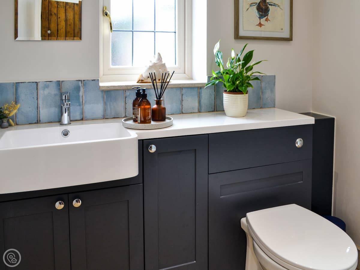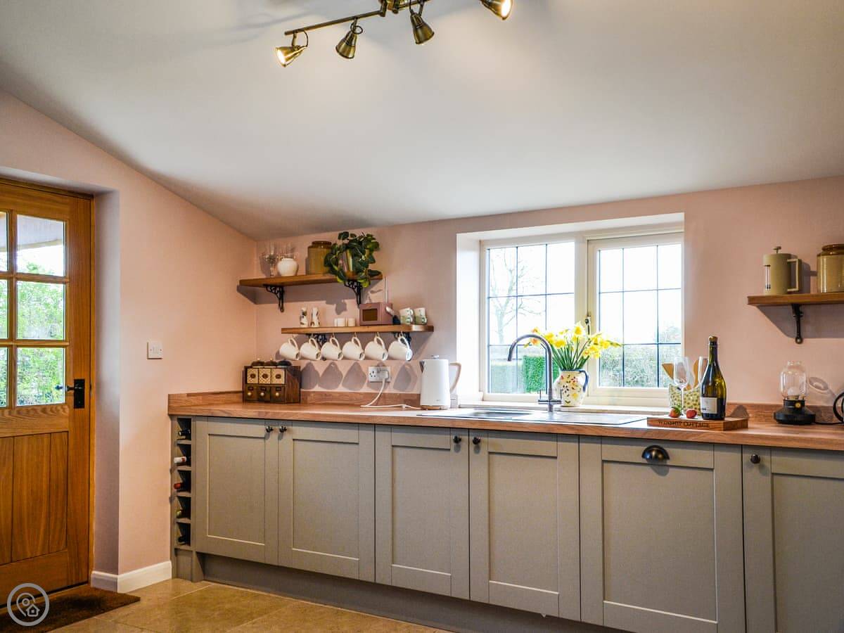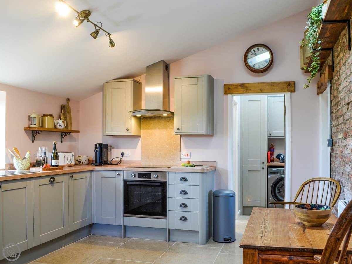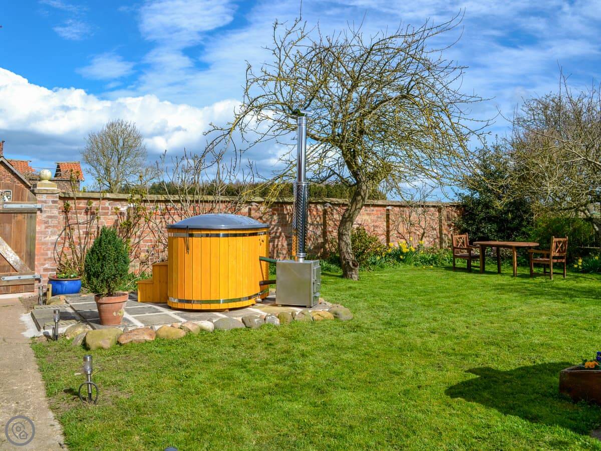 Downstairs has stone floors, which are nice and cool, and an inglenook fireplace. The kitchen is small but has what you need, including a dishwasher. There's a washing machine in a separate utility room, and that leads to a ground-floor shower room. Outside, there's a proper enclosed garden at the back with a wood-fired hot tub. You'll need to get that going yourself. There's a boot room for coats and wellies, and space for bikes.