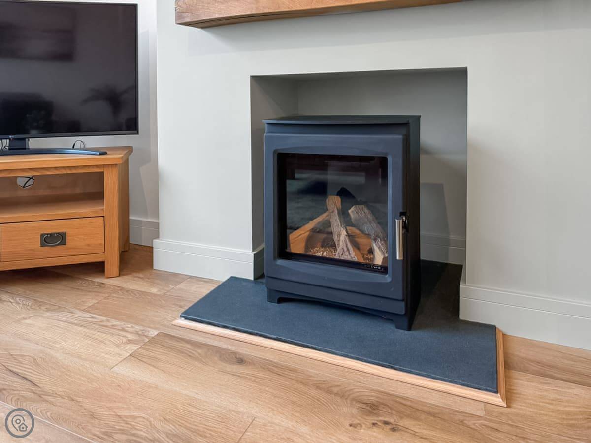 Upstairs is all one space. Kitchen, dining area, and living room. There's a gas stove that looks like a wood burner. The big window is the main feature. It looks out over the lochs and the hills. There's a private balcony off this room too.