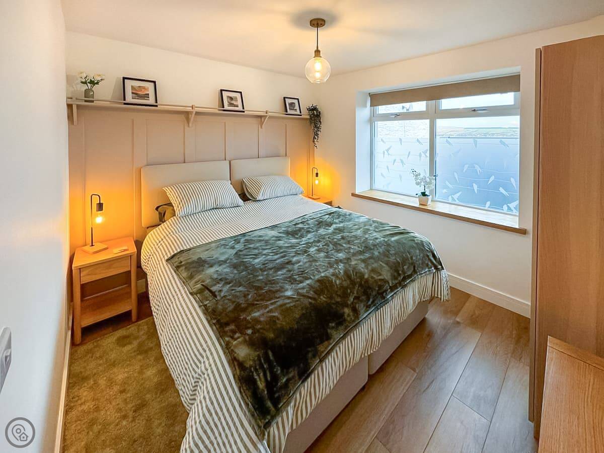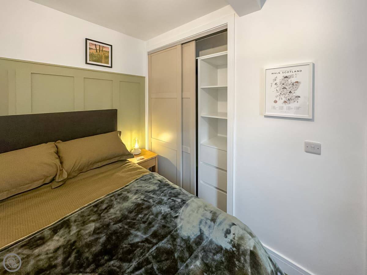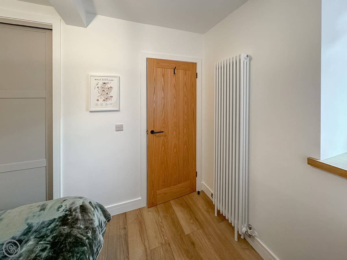 The cottage sleeps four. Two bedrooms, one bathroom. Both bedrooms are doubles and they're downstairs. The main one has good views over where the lochs and the River Clyde meet. It's a quiet spot. The bathroom is a shower room.