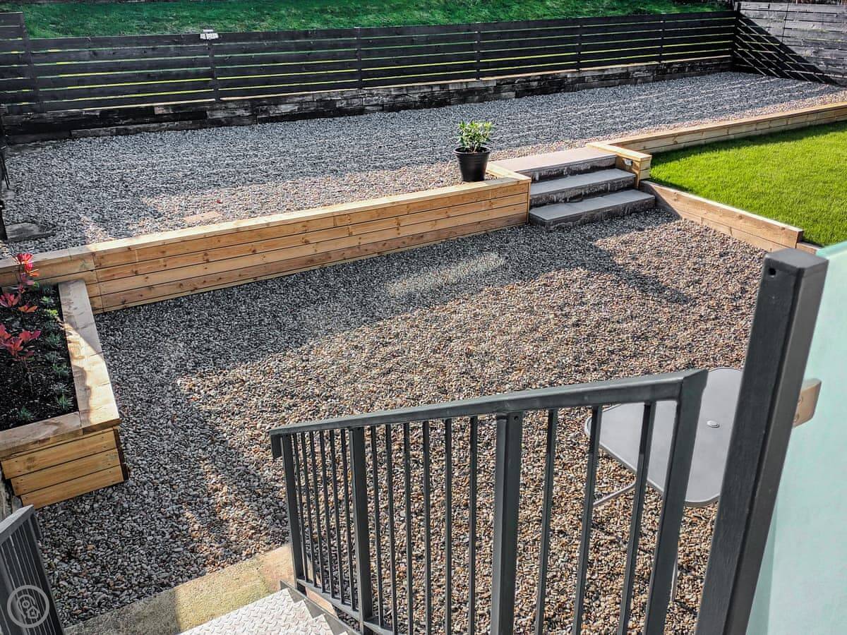 Outside, there's a garden area and a BBQ. I've put in a lockable shed for bikes if you bring them. There's a washing machine and a rotary dryer. Parking is right there.