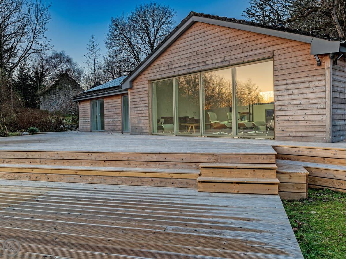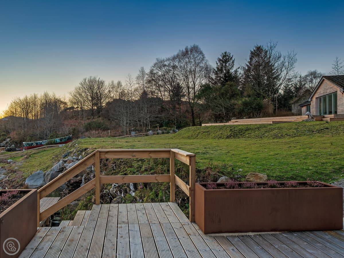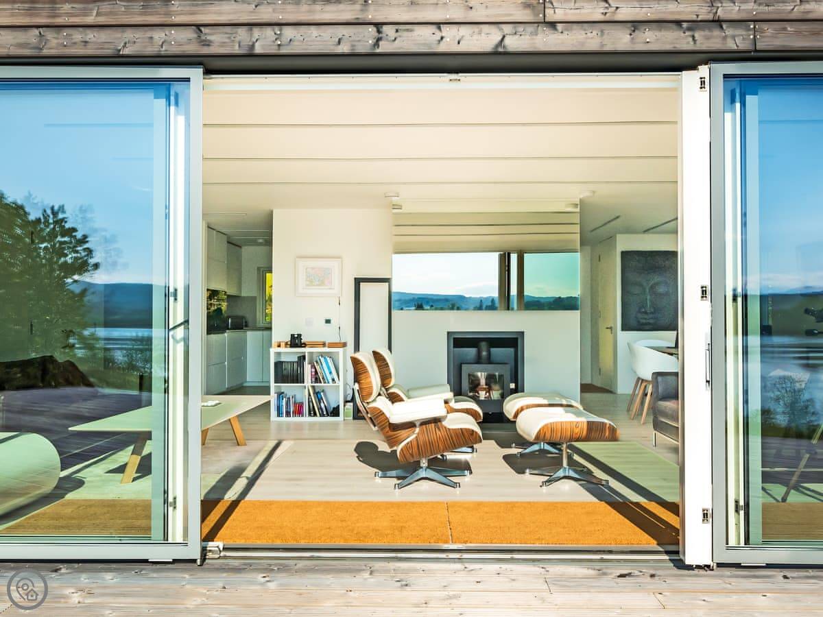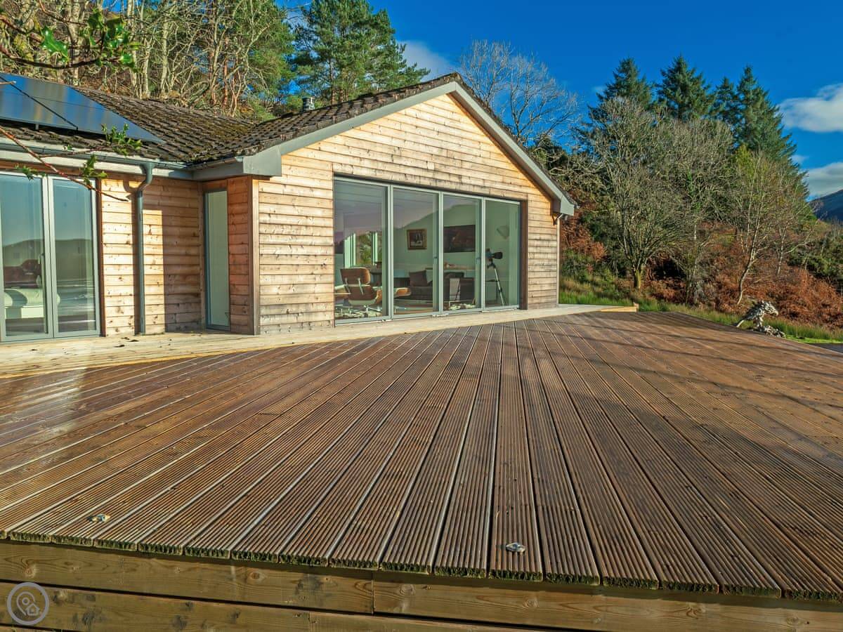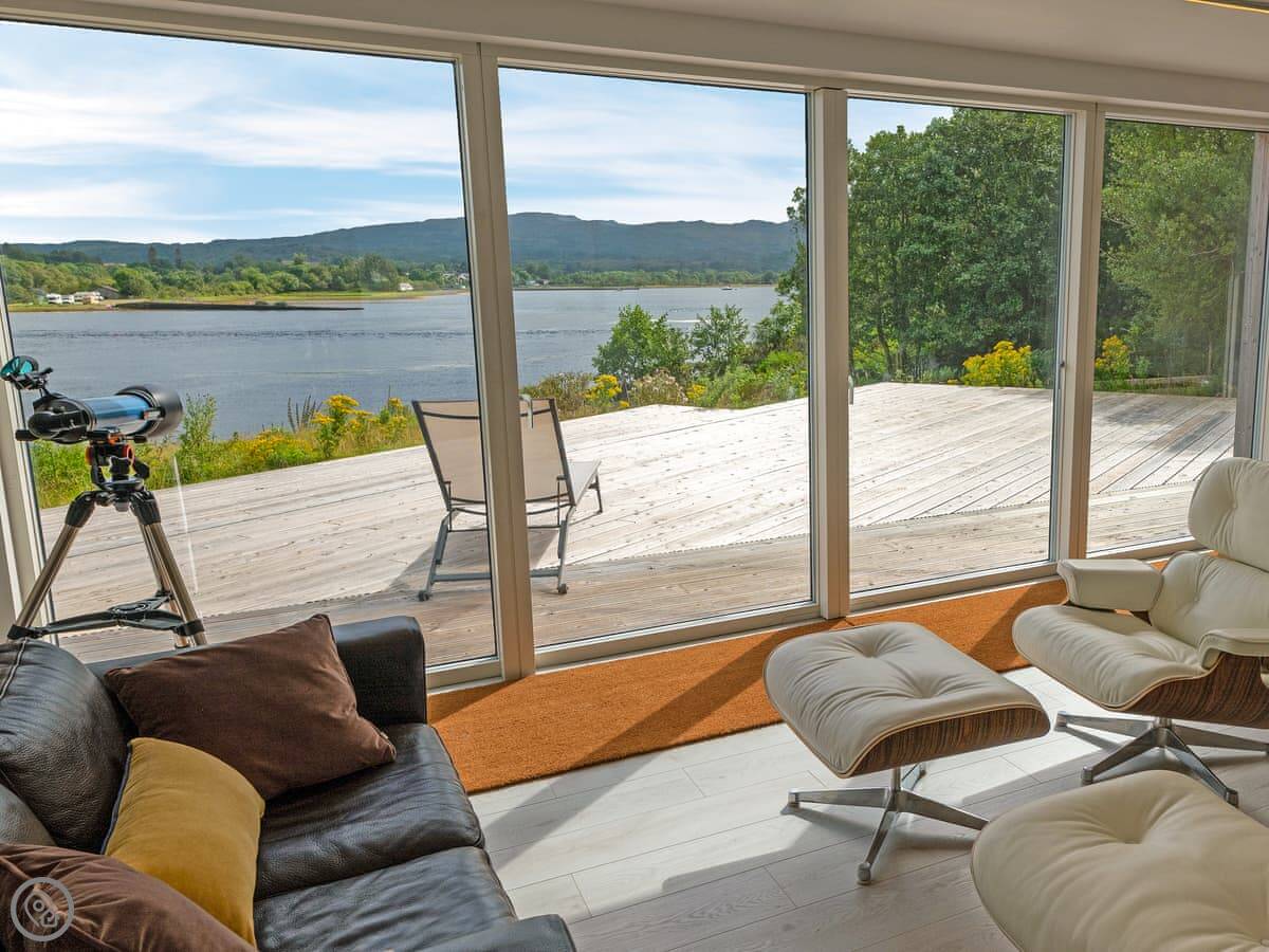 The main thing about it is the view. The living room has big patio doors that look straight out over the loch. You can walk out from there onto the decking. There's more decking down by the water. It's quiet.