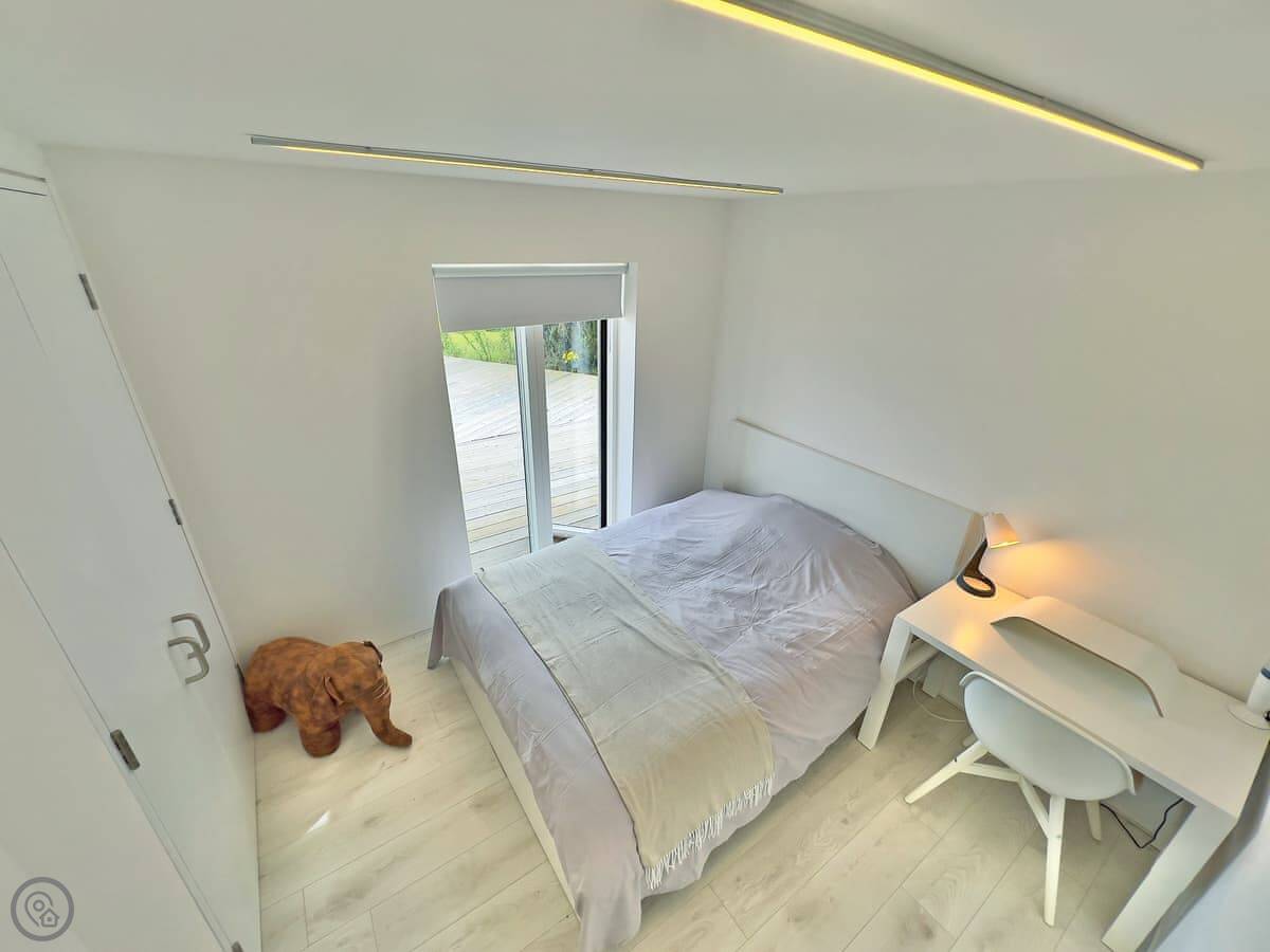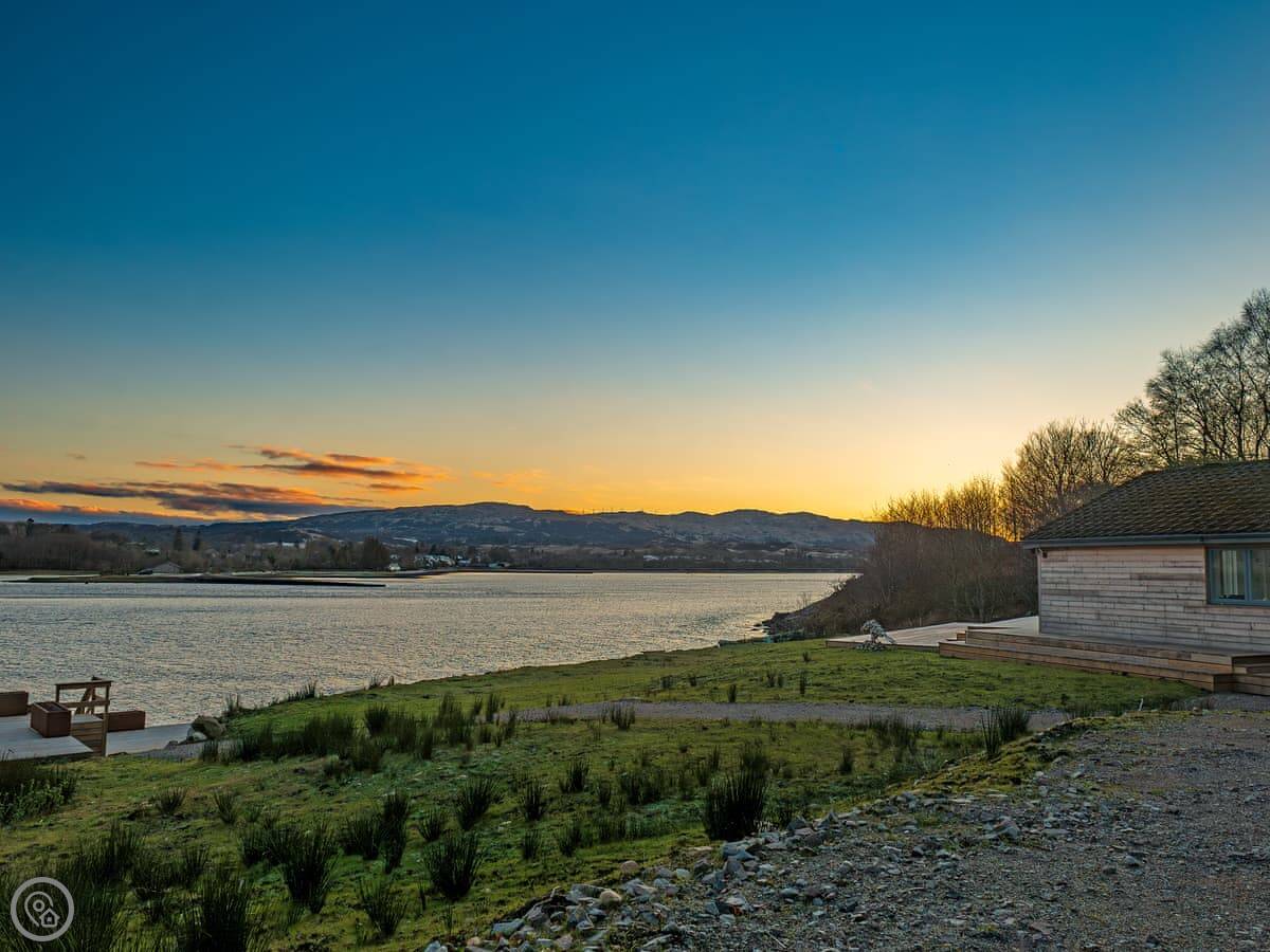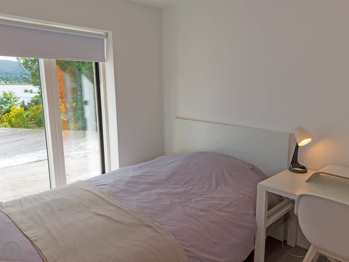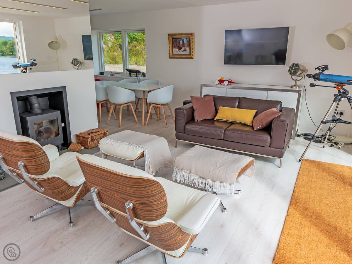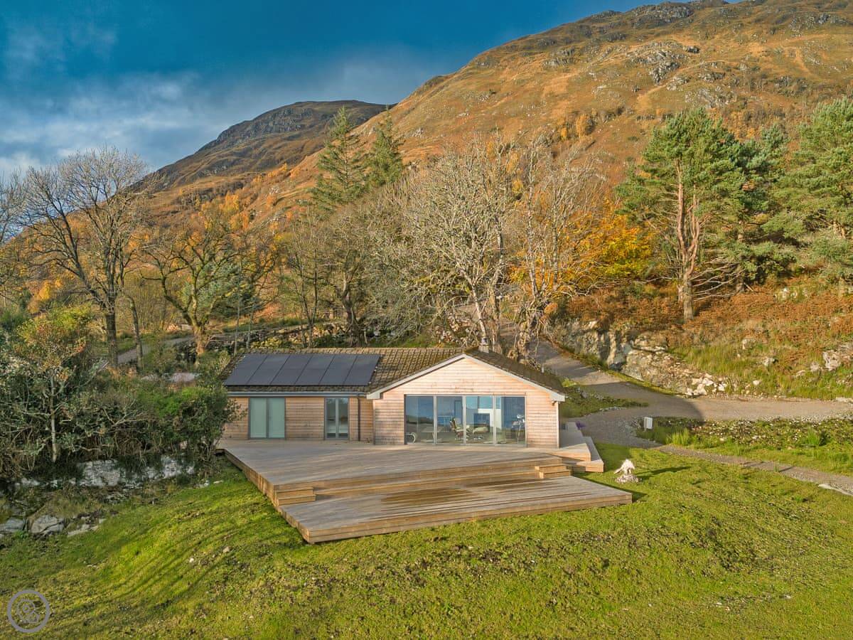 The main thing about it is the view. The living room has big patio doors that look straight out over the loch. You can walk out from there onto the decking. There's more decking down by the water. It's quiet.