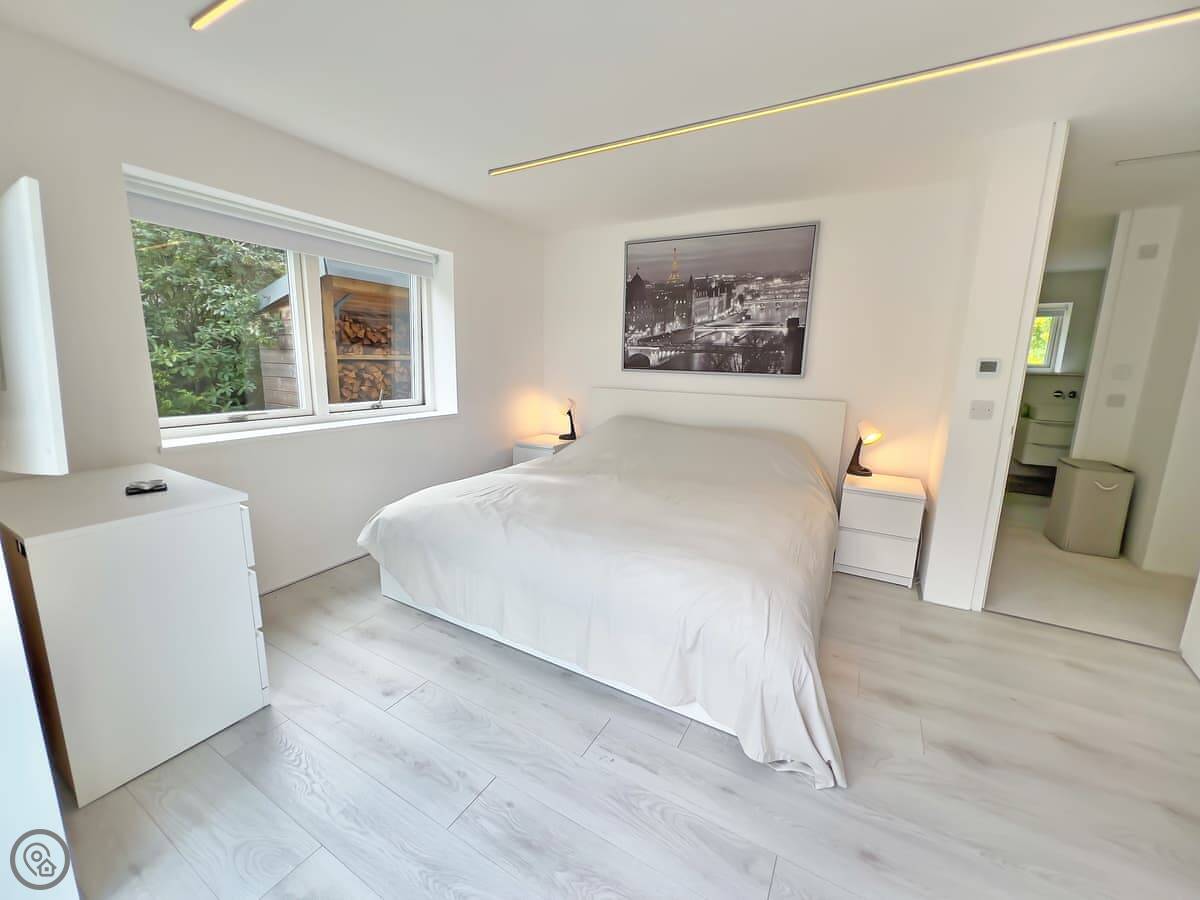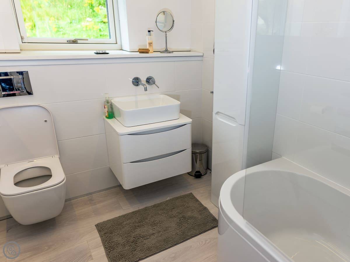 The living space is open plan. There's a wood-burning stove. The kitchen has a dishwasher. There's a washing machine, and bedding and towels are included. There's parking and an electric vehicle charger. There's also a small study with WiFi if you need to work.