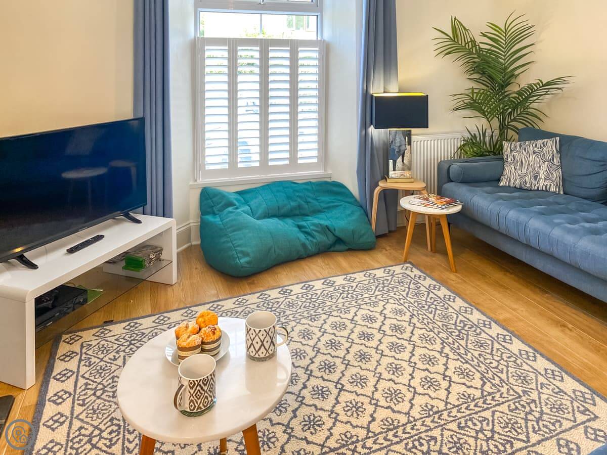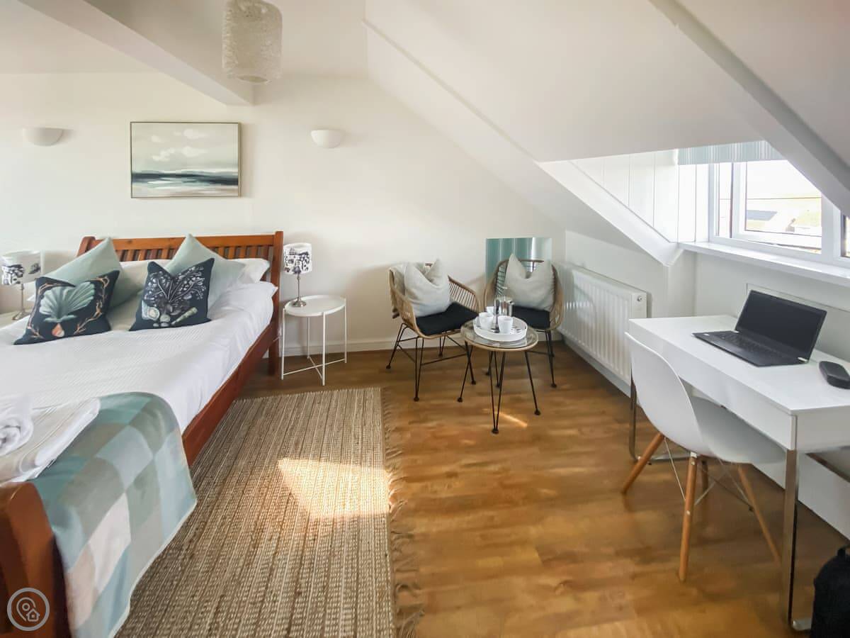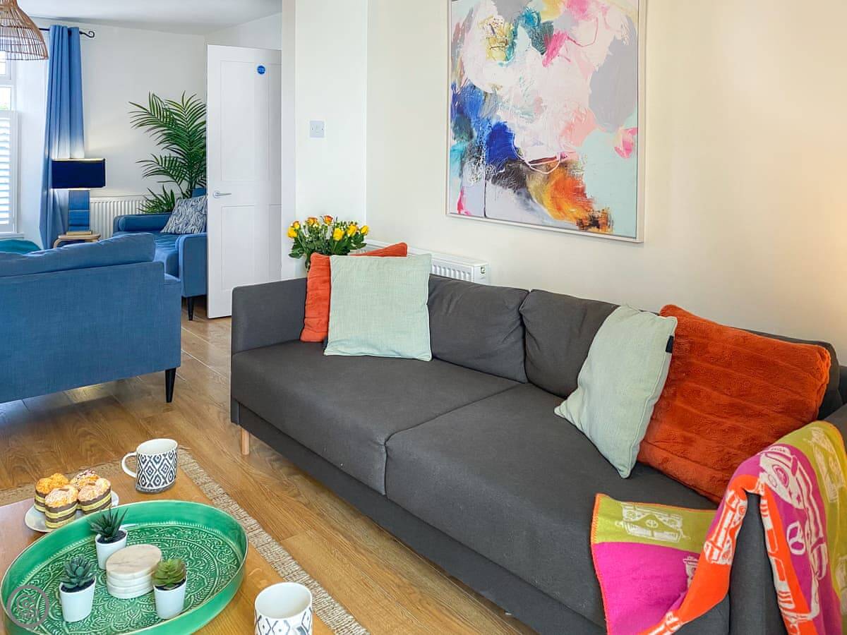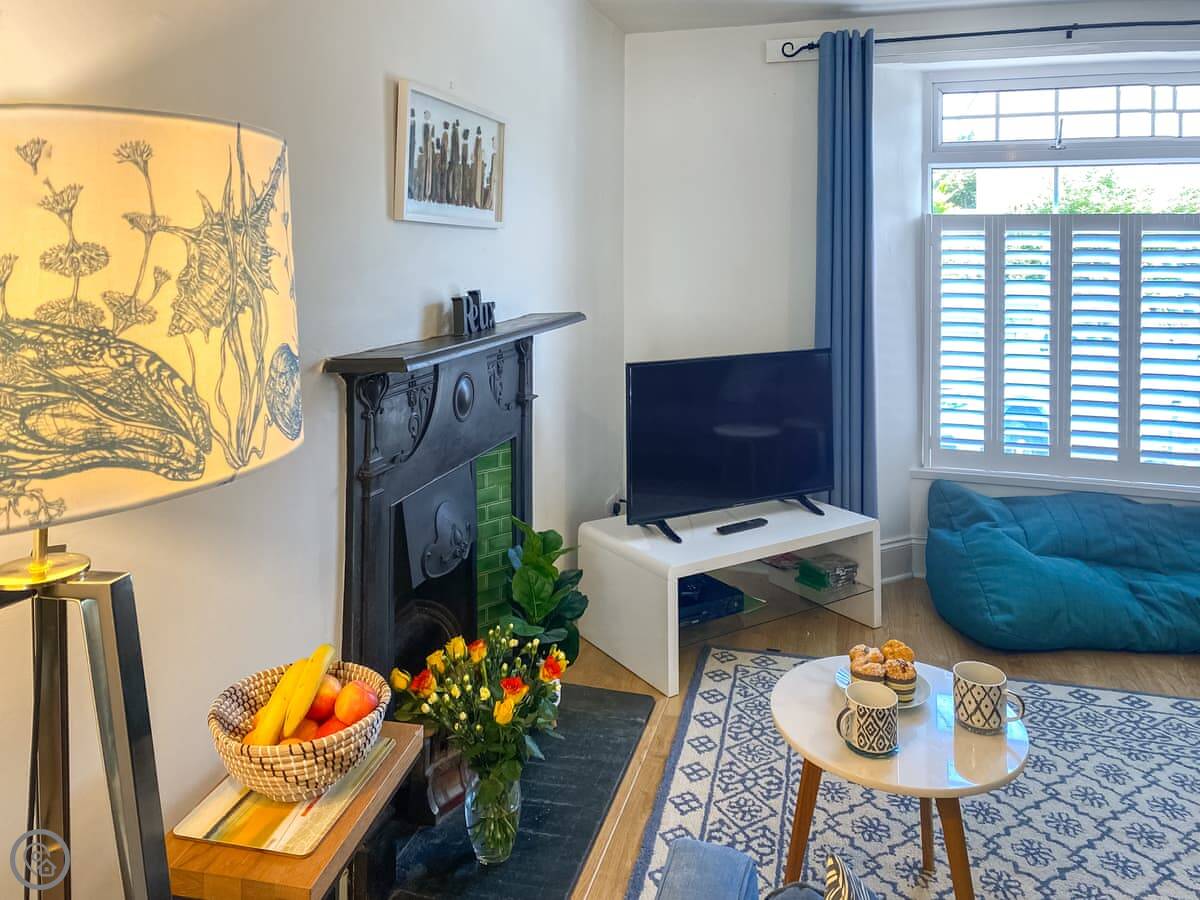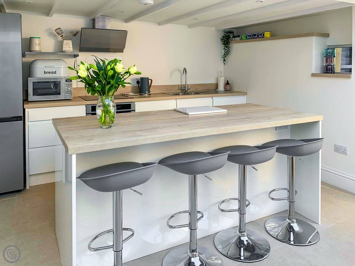 The kitchen is modern with an island you can sit at. There’s a good sized sitting room with a wood burner. We supply the logs. The garden is out the back, a decent spot for an evening drink.
