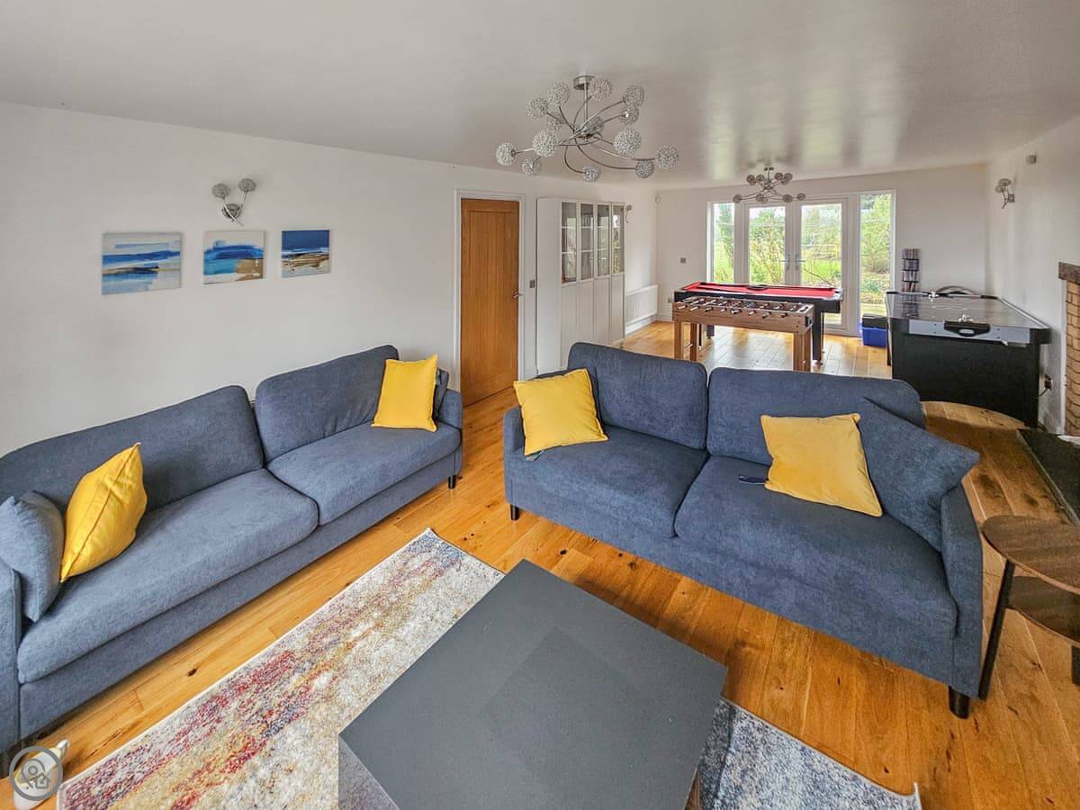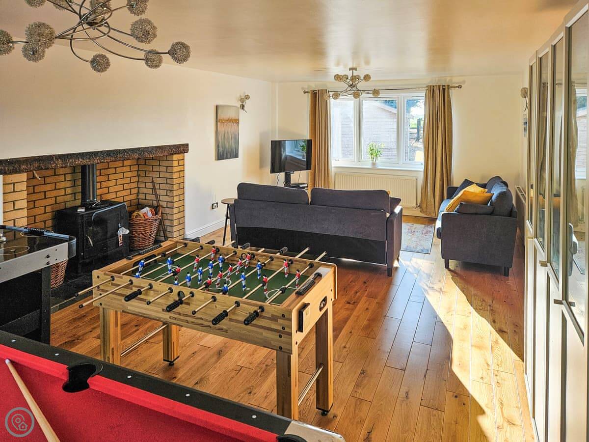 It's got a 4 Star rating. What that means here is it's spacious and set up for groups. The kitchen is big, plenty of room for people to be in there without getting in each other's way. Downstairs there's a living room with a wood burner, and there's also a games room with a pool table, air hockey and table football.