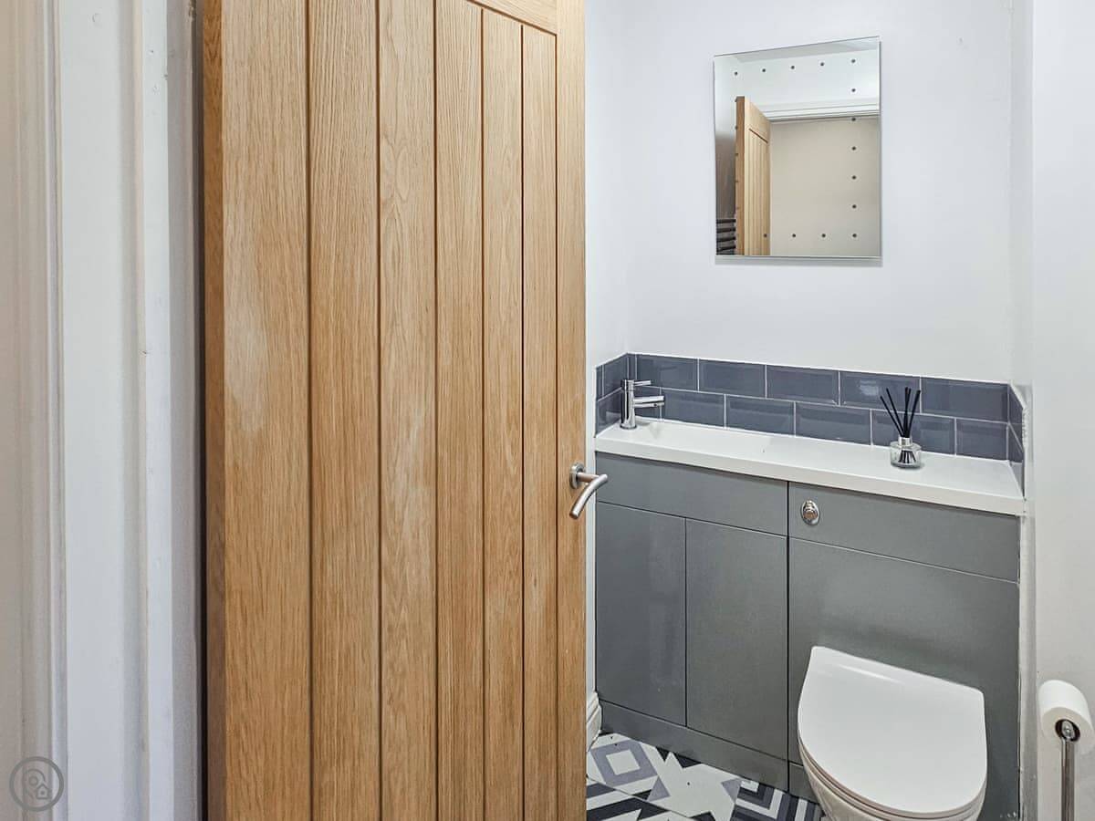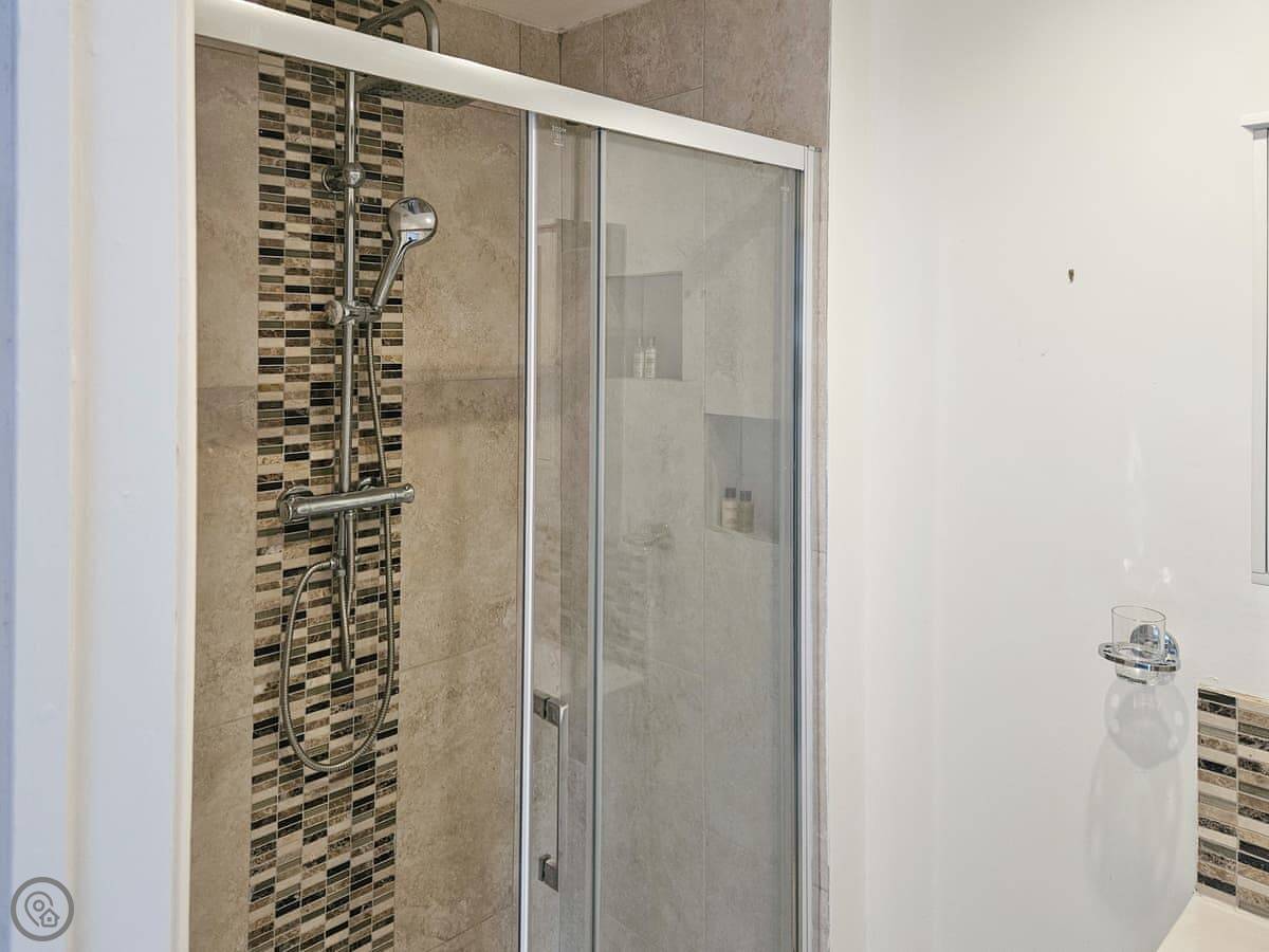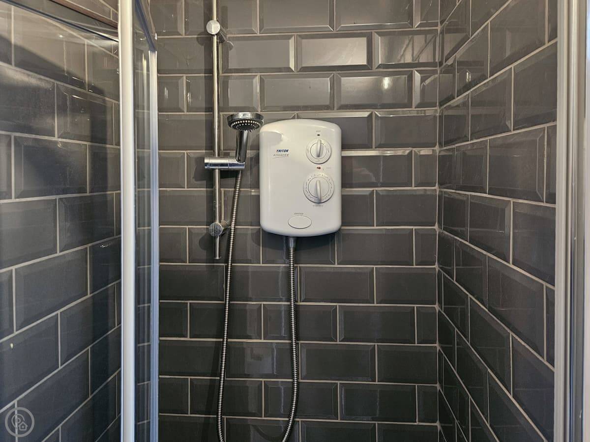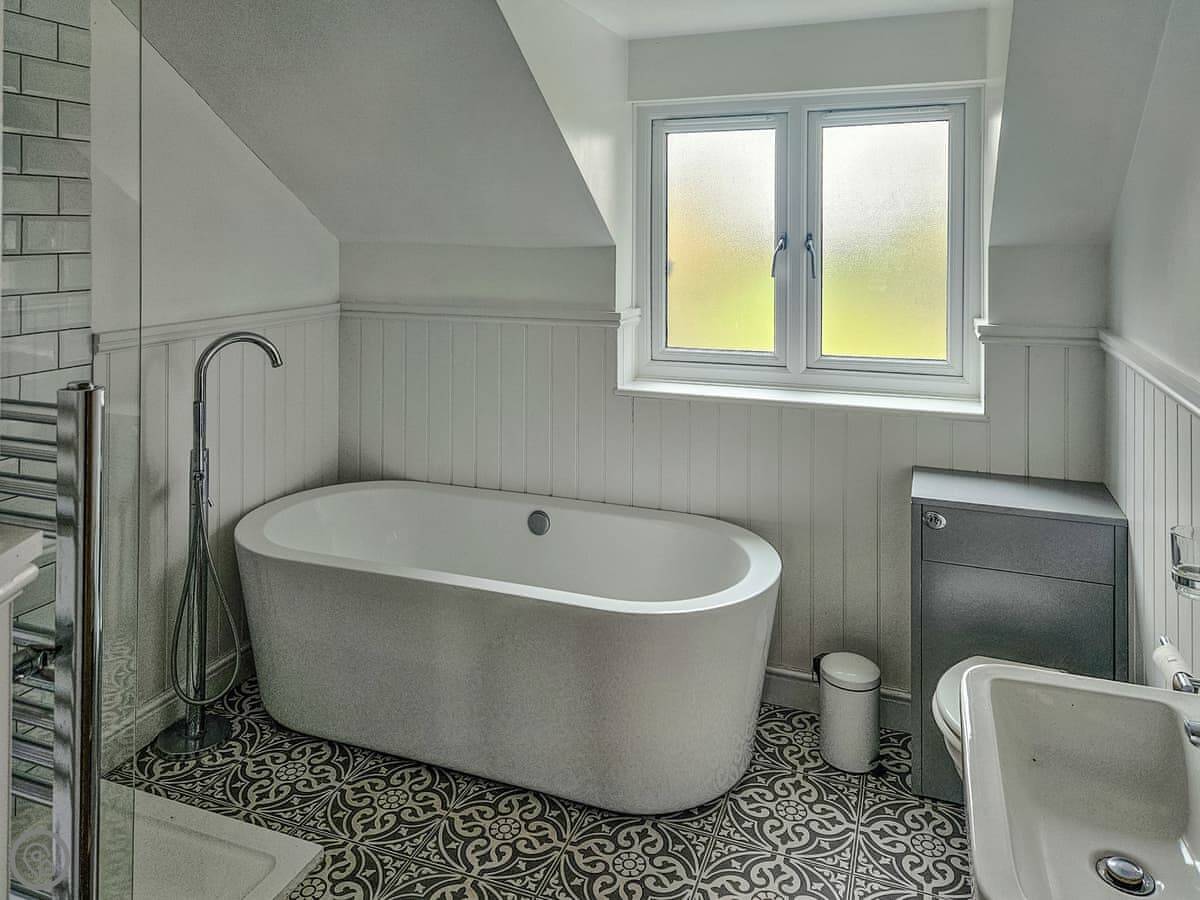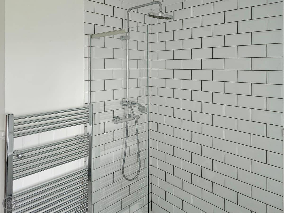Three of the bedrooms are on the ground floor. One is a super king with a TV, and there's a bunk room. Upstairs, there are two king rooms with en-suite showers, and two twins. The main bathroom has a separate bath and shower cubicle. There's another shower room too, so you shouldn't queue.