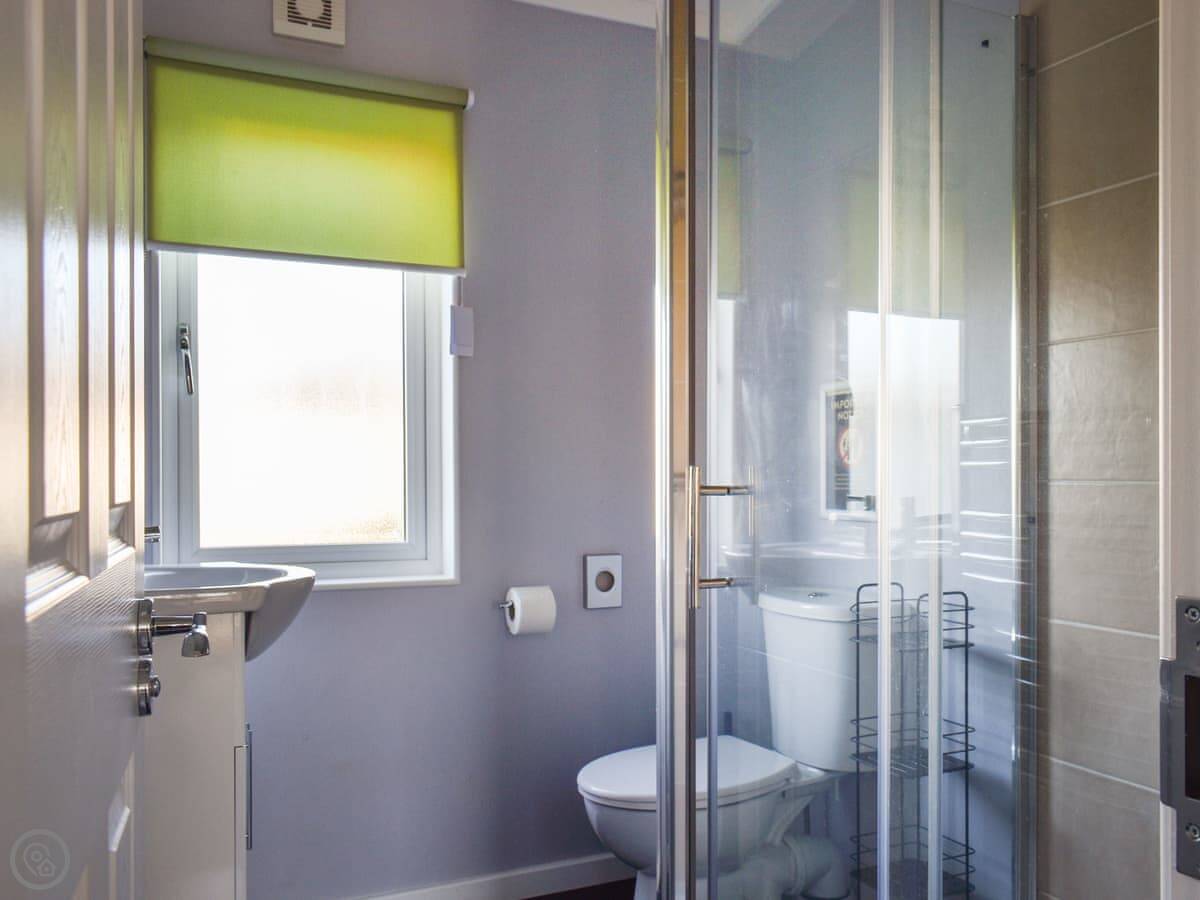 The layout is open-plan. The back opens onto a private deck with a big grassy area behind it. It's a good spot to sit out. Inside, there's a double bedroom and a twin room, and one bathroom with a shower cubicle. Everything you'd expect is there: TV, wifi, a washing machine, and the bedding and towels are included.