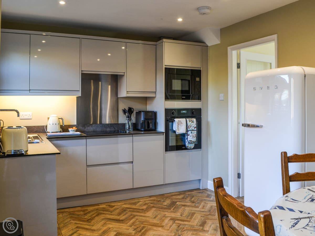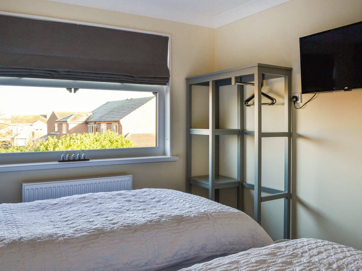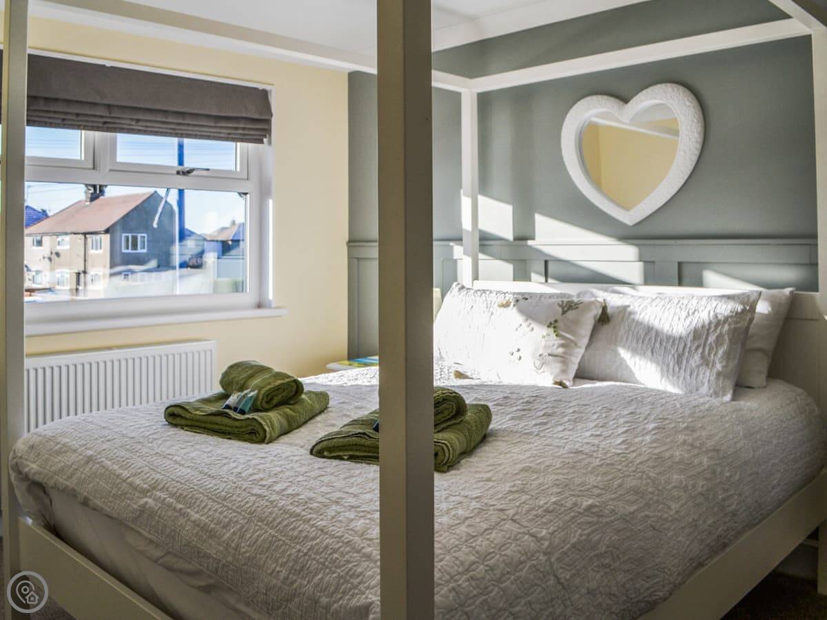 Inside, the kitchen has what you'd need. Induction hob, air fryer, dishwasher. The living room has a large TV. Two of the bedrooms have TVs as well. The main bedroom has a four-poster bed. The second bedroom has a super king that can be split into two singles if you ask beforehand.