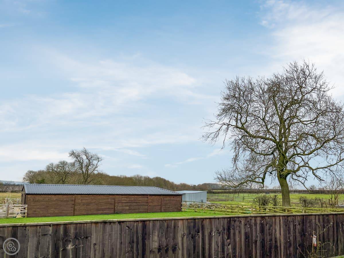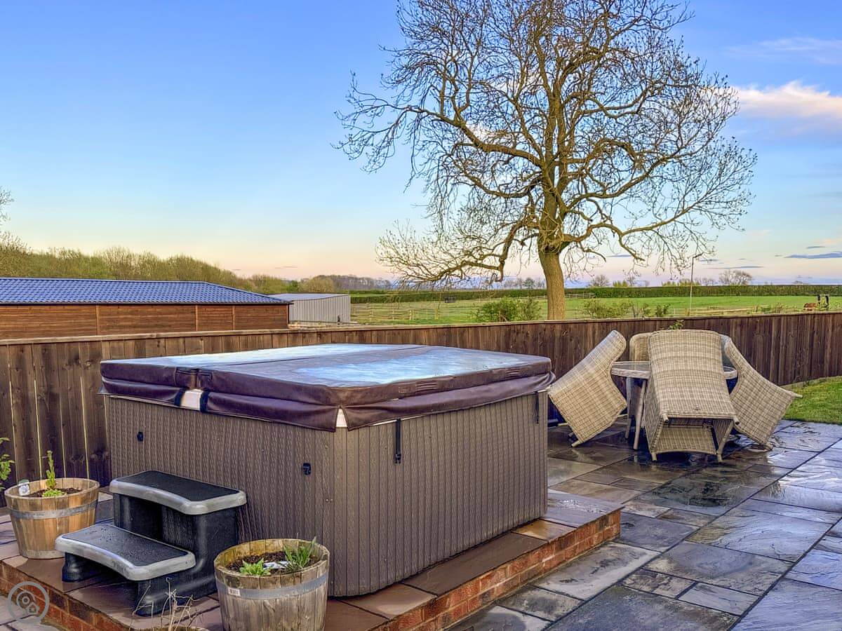 The main thing is the hot tub on the patio. It's a good size. You get the patio to yourselves. There's a BBQ and some garden furniture. The view from there is straight out towards the Cleveland Hills.