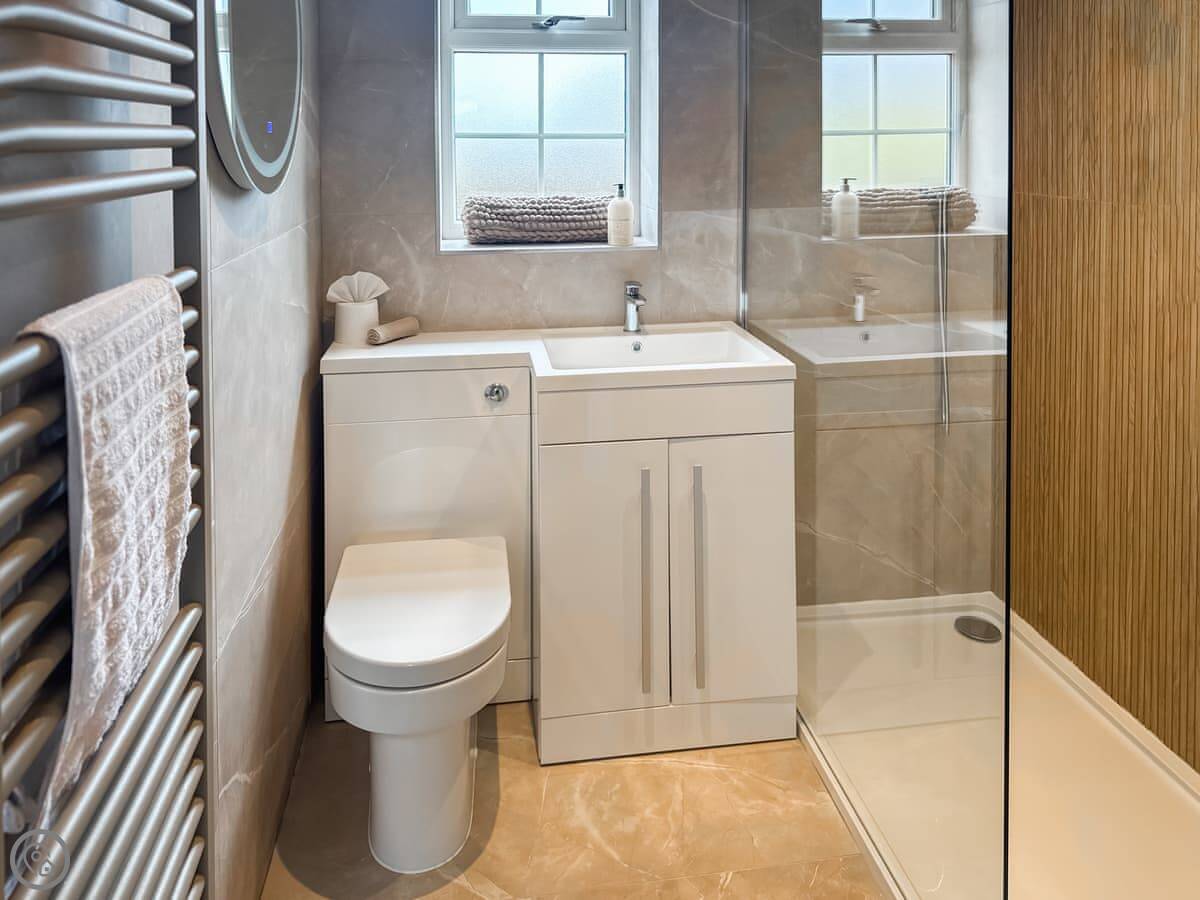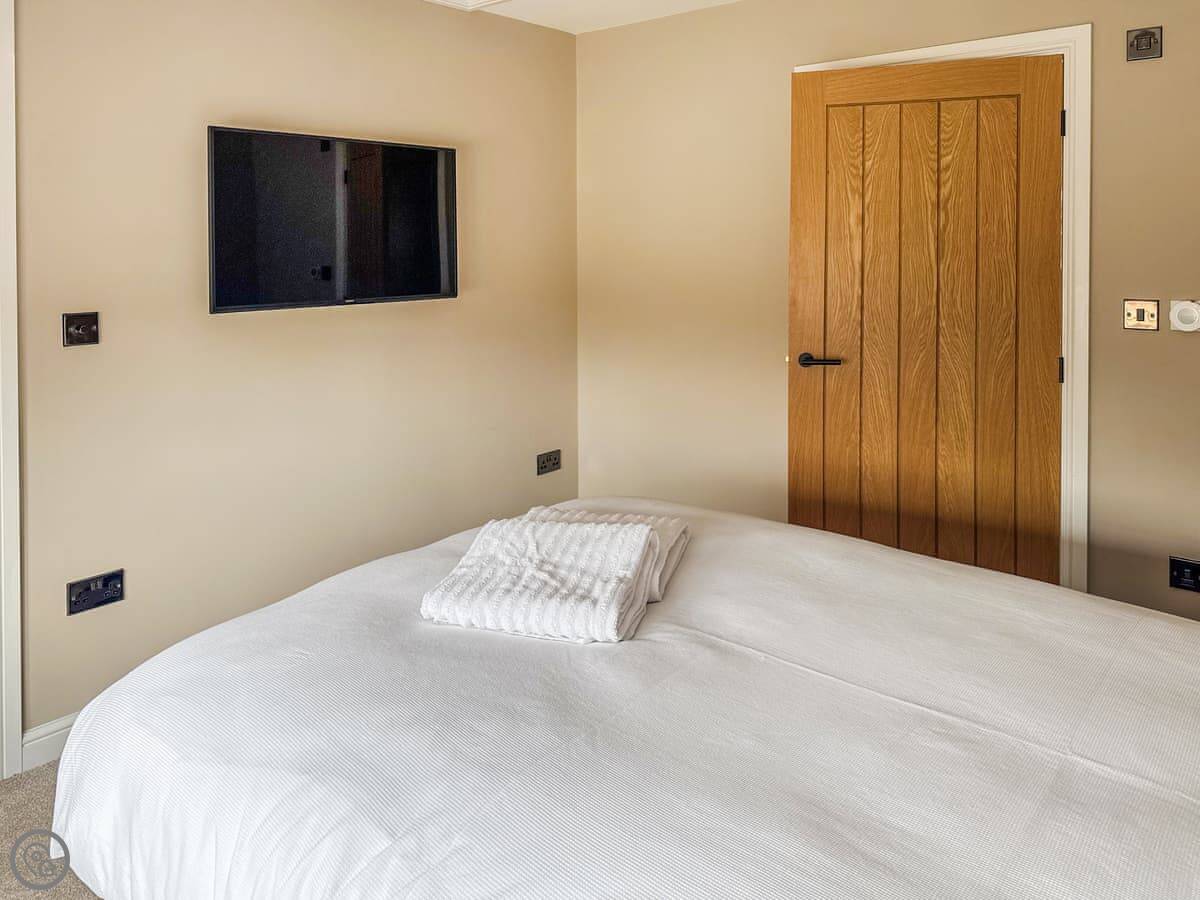 It sleeps four, but it’s one bedroom with a double bed. The other two sleep on the sofa bed in the living area. There's one bathroom, which is en-suite to the bedroom. It's got a 4 Star rating. It feels modern inside, with underfloor heating everywhere except the bedroom. That's got a radiator.