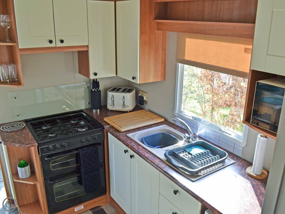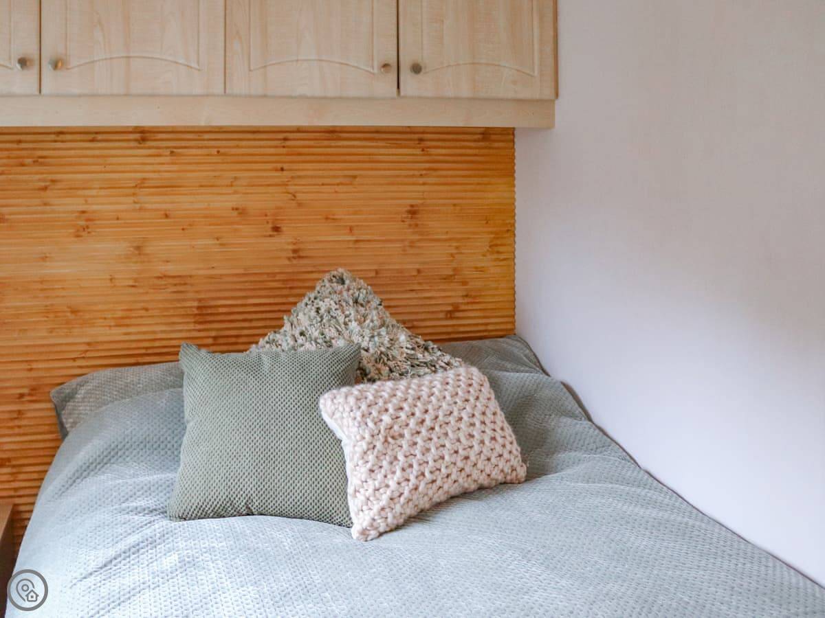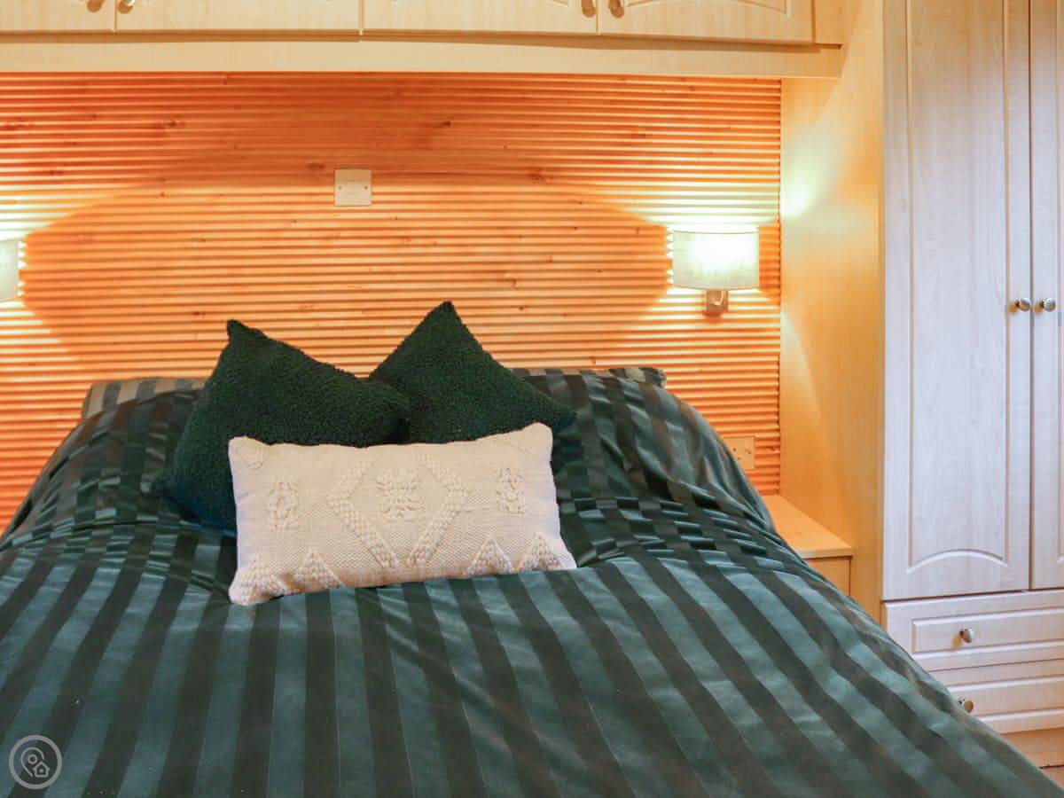 It sleeps four. Two bedrooms, one bathroom. It's got a 4 Star rating, so it's comfortable and well-equipped. The main bedroom has a double bed and a dressing table. The second bedroom has a small double, so it's fine for kids or two adults who don't mind a cosy space. The living area is all open-plan: kitchen, dining, and sitting area together.