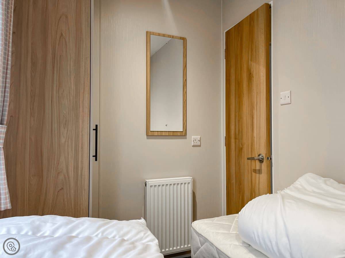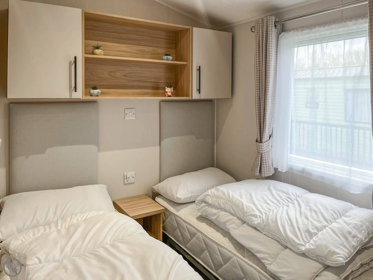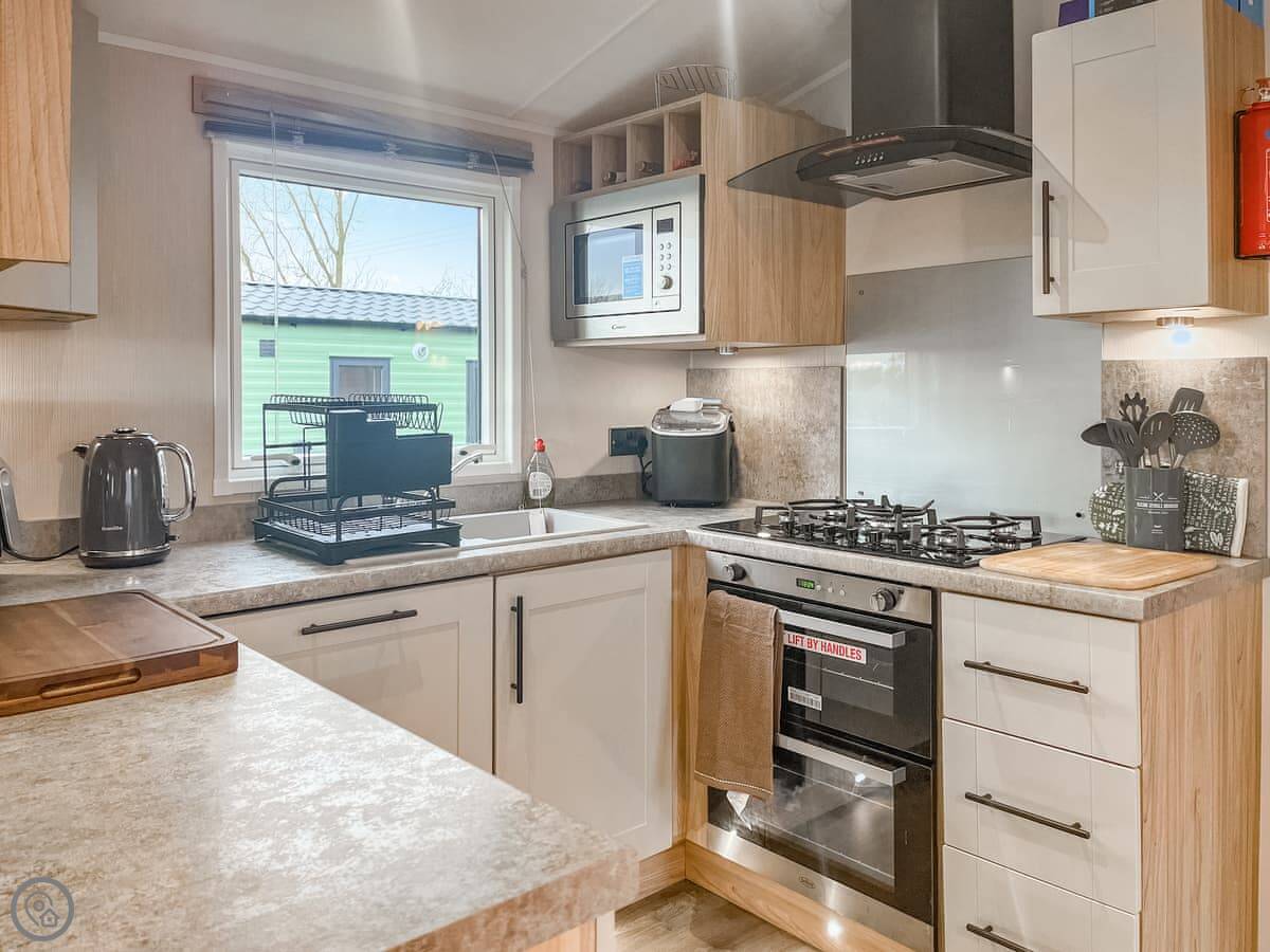 It sleeps four, in two bedrooms. One double with an ensuite toilet, and one twin. There's also a sofa bed in the lounge if you need it. It's a 4 Star lodge, so it's modern and well kept. You can bring one dog.