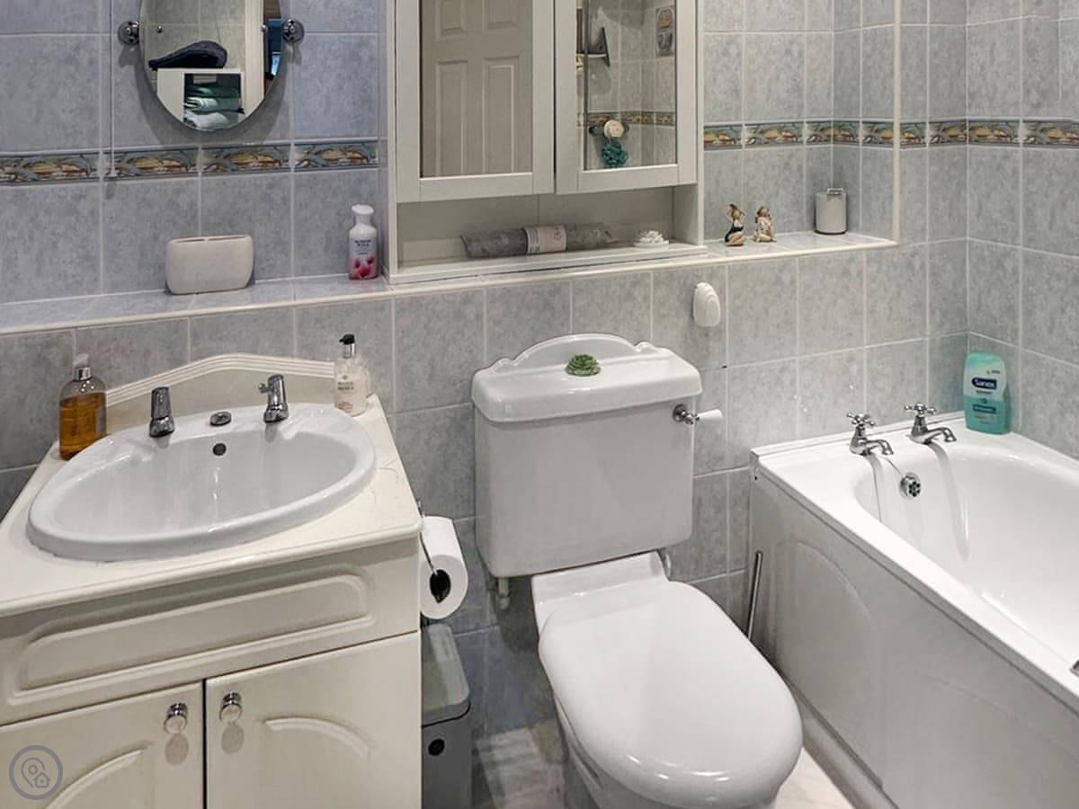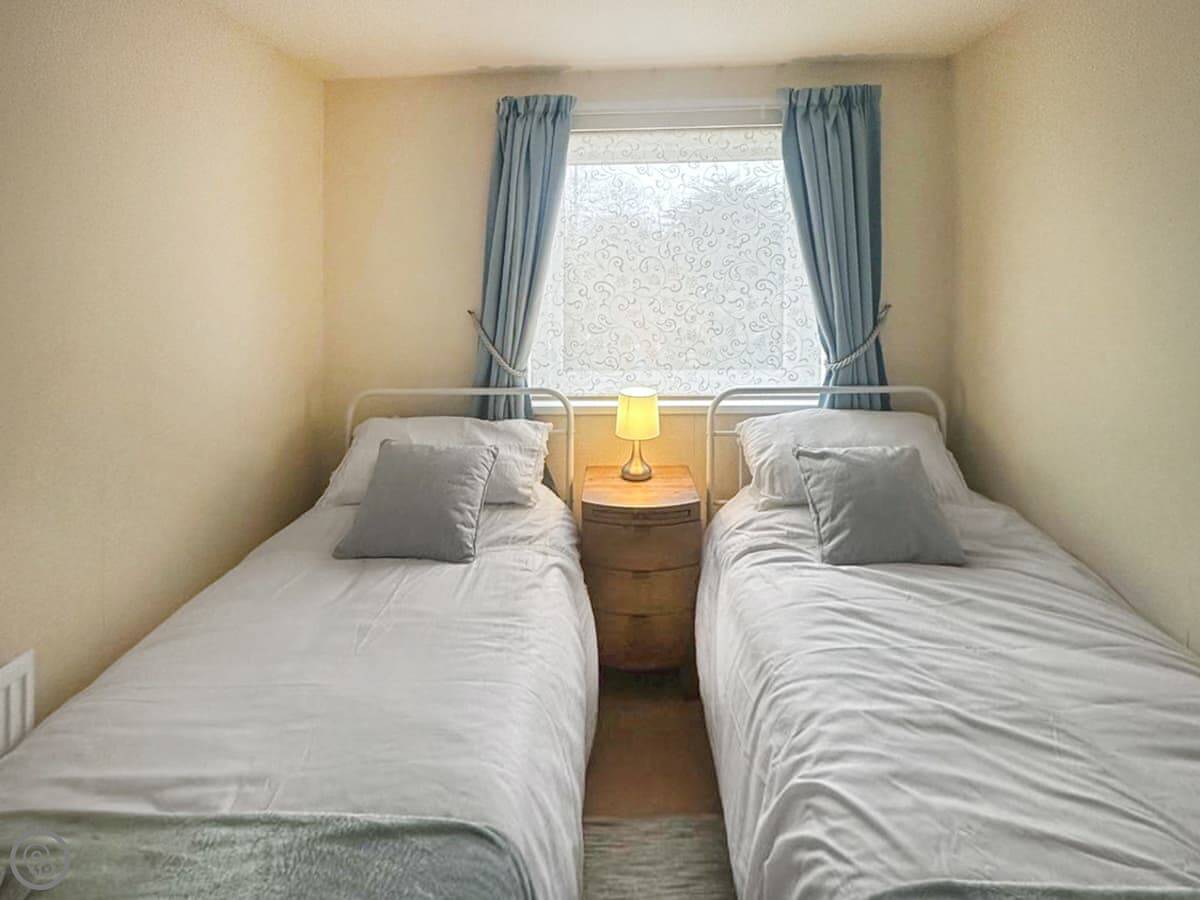 It sleeps four. Two bedrooms upstairs and one bathroom. It's a 3 Star place, so it's clean and has what you need, but it's not a fancy new build. The second bedroom is quite small, really just big enough for the two single beds.