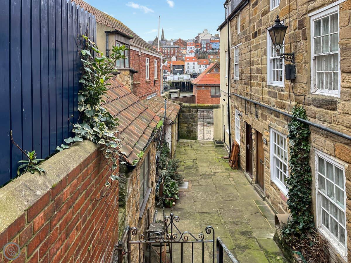 Conflict Cottage is in Whitby town centre, a couple of minutes' walk from the harbour. It's a tall, thin place on three floors. You get the ground floor patio to yourselves.