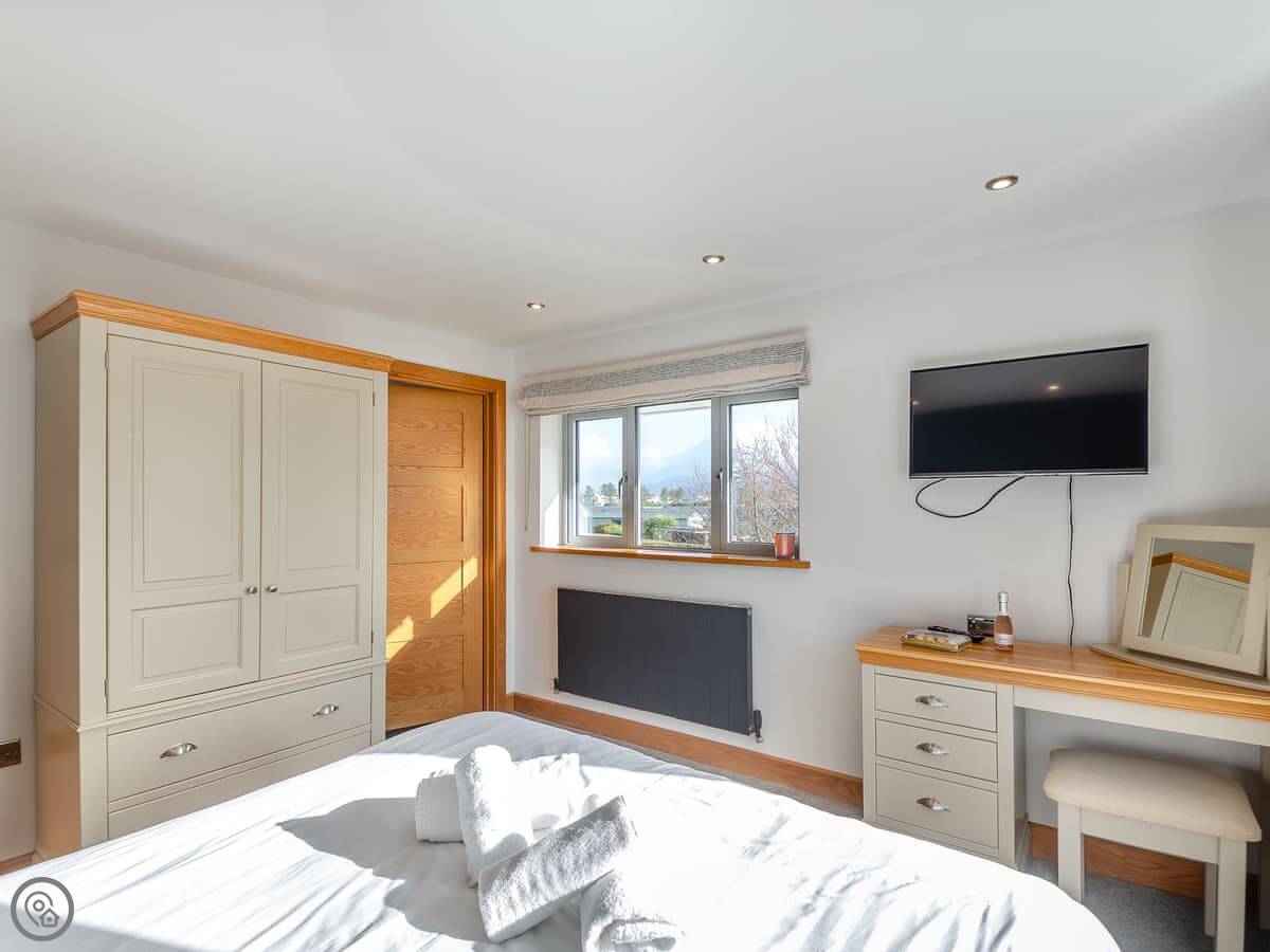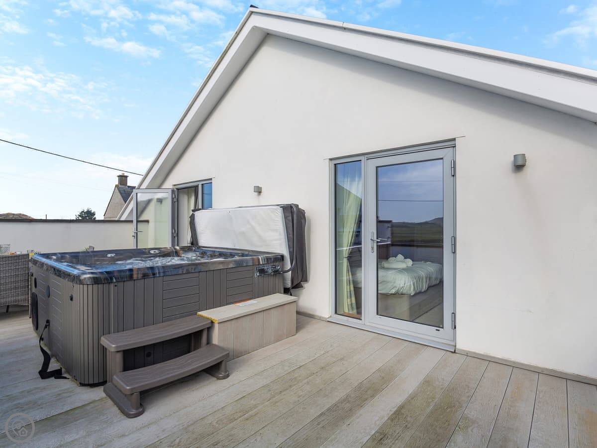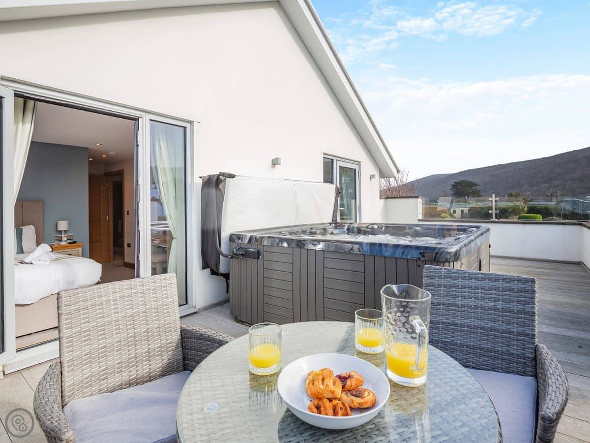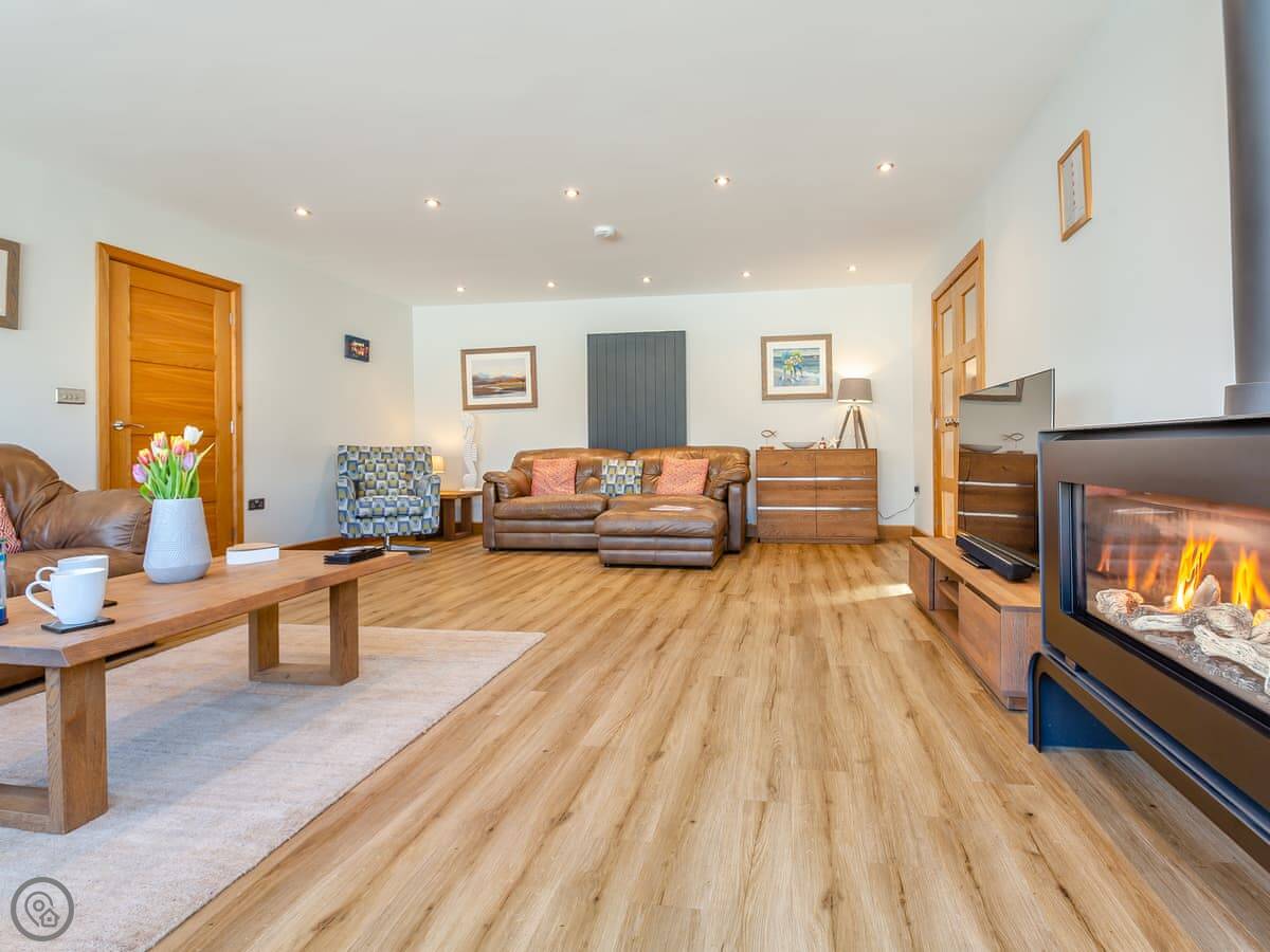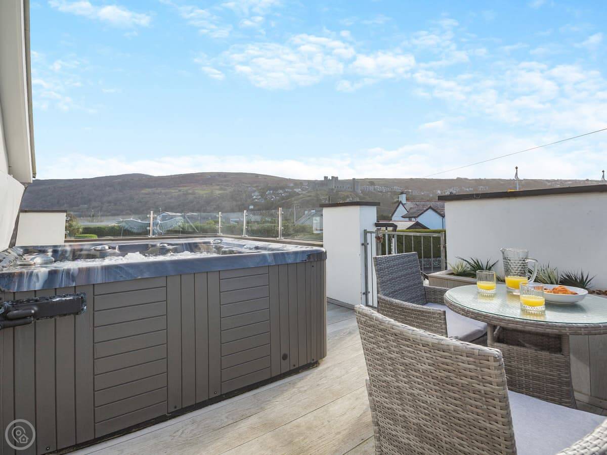 The main bit is open plan: kitchen, dining, lounge. The lounge has one of those electric log-effect fires. It’s comfortable, not huge. Doors open out to a balcony with a hot tub on it. That’s the feature. You can see the castle from it. The hot tub takes a while to heat up when you first get here, so don't expect it to be ready the evening you arrive.