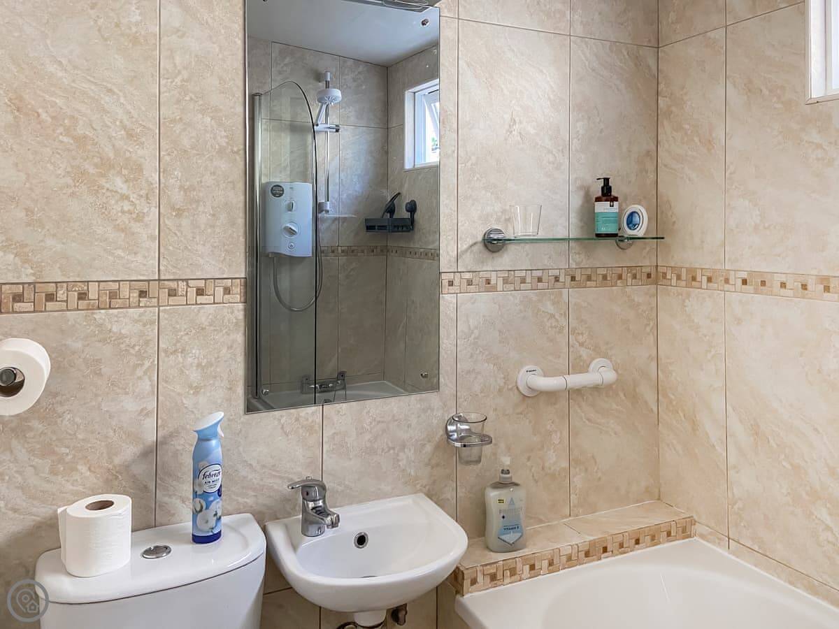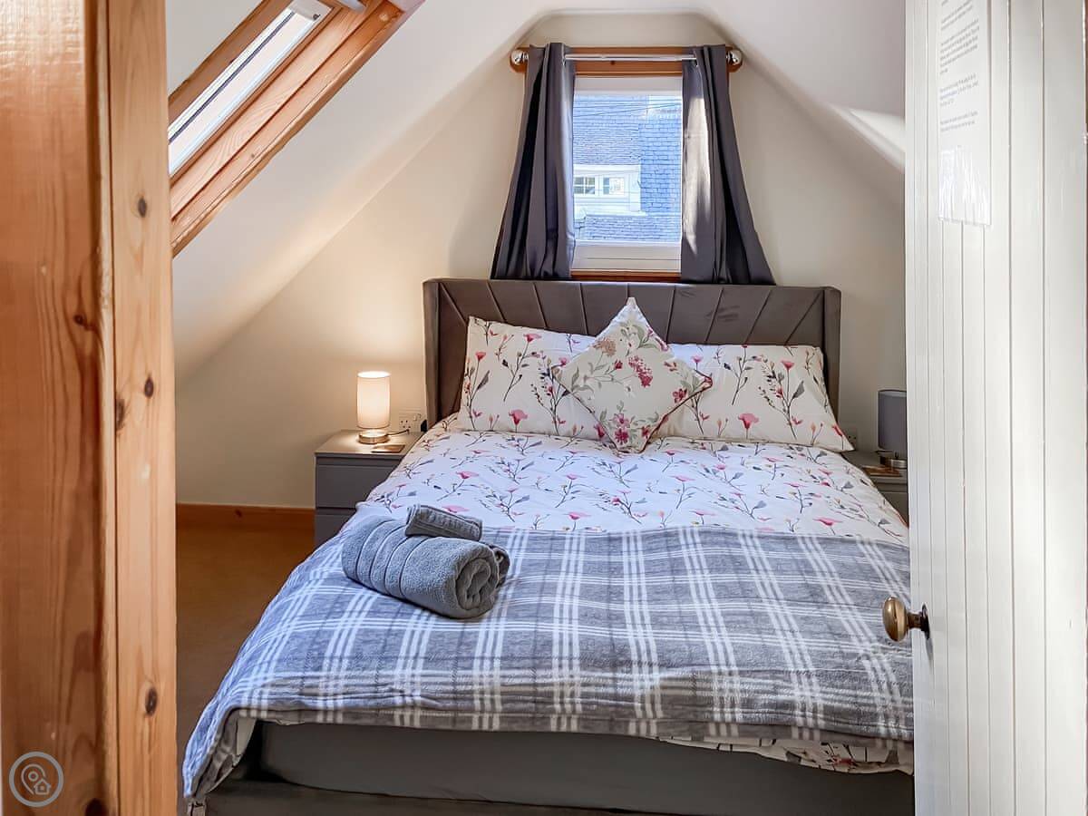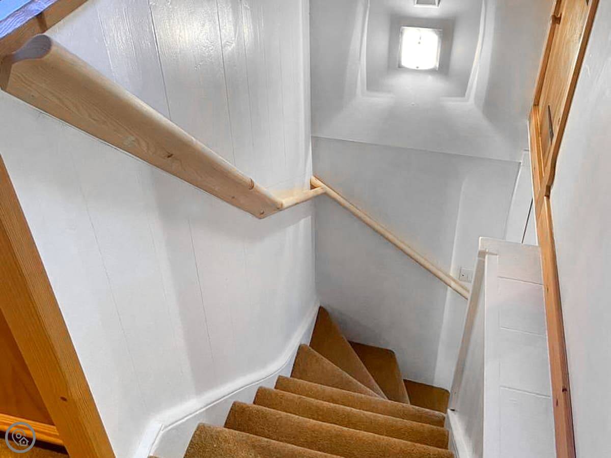 It sleeps four. There are three bedrooms and one bathroom. One double bedroom is on the ground floor next to the bathroom. Upstairs, there's another double and a small room with a single bed. The stairs are the original ones, so they're quite steep and narrow. The bathroom has a shower over the bath and a heated towel rail.