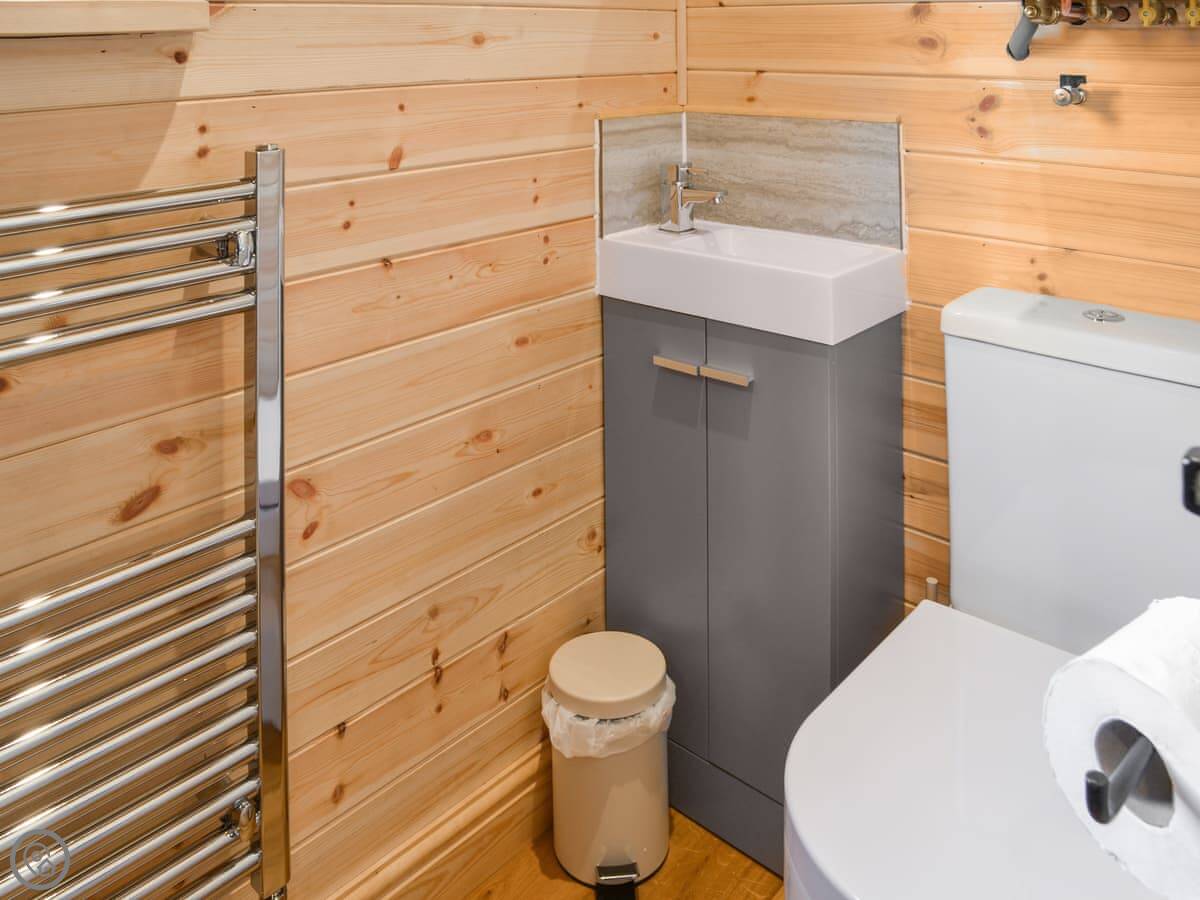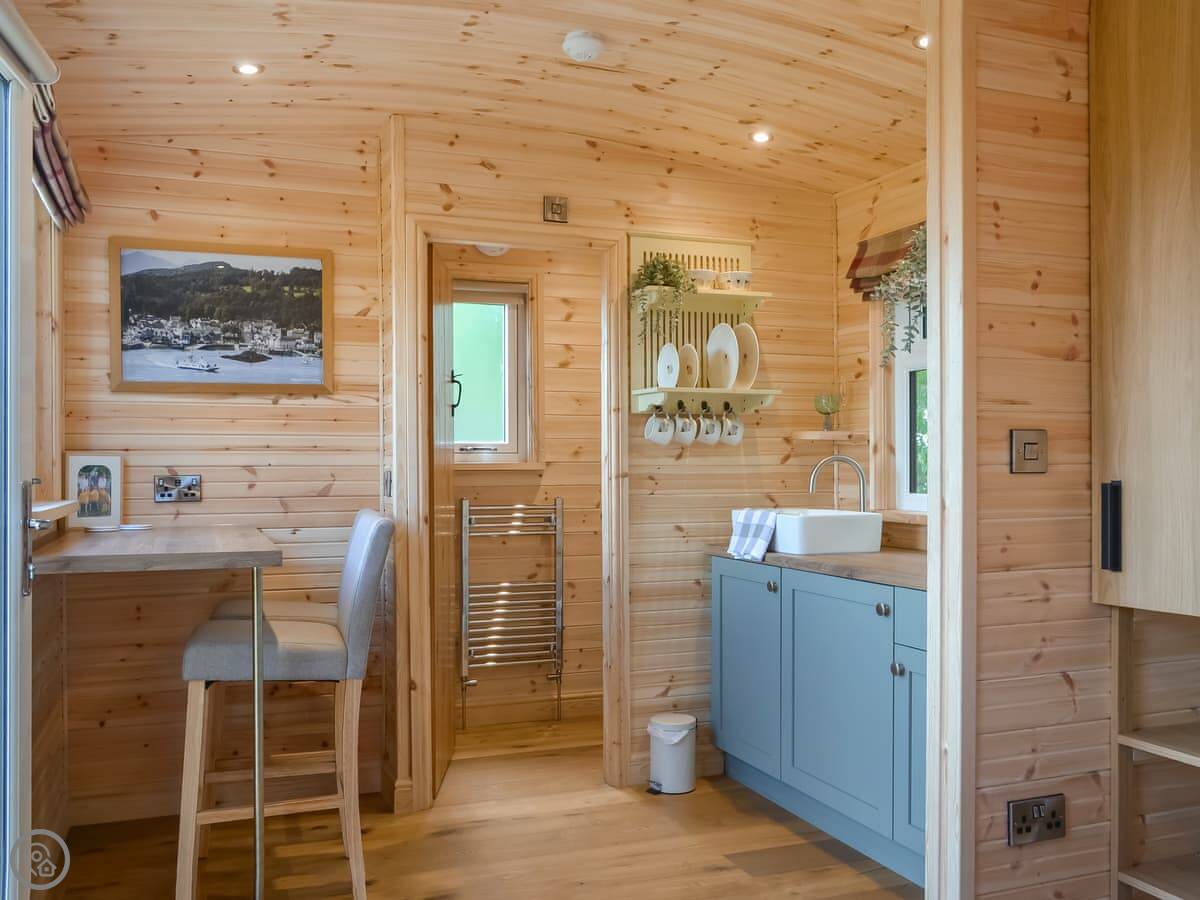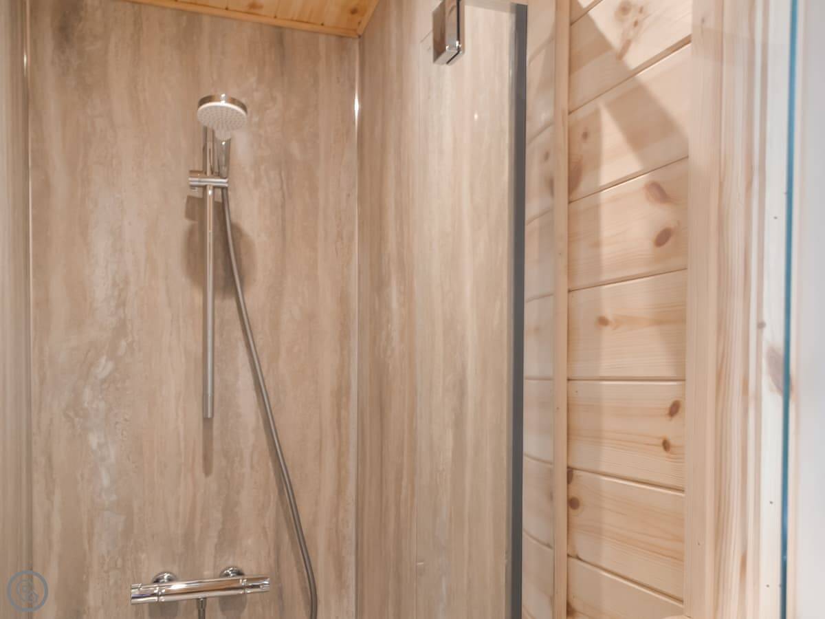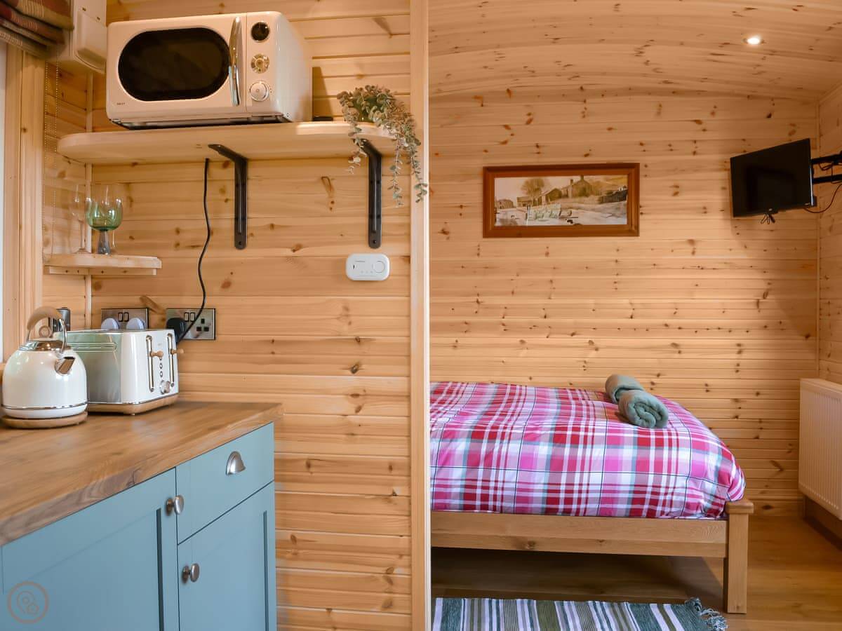 It's a 4 Star place, so it's got everything you need. There's a double bed, a sofa, and a TV in the one room. The kitchen area is small but works: there's an electric hob, a microwave, and a Belfast sink. The shower room is separate. The whole thing is wood inside. It's warm.