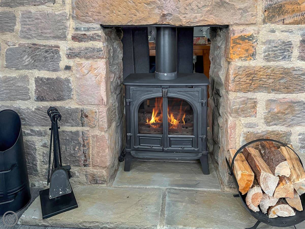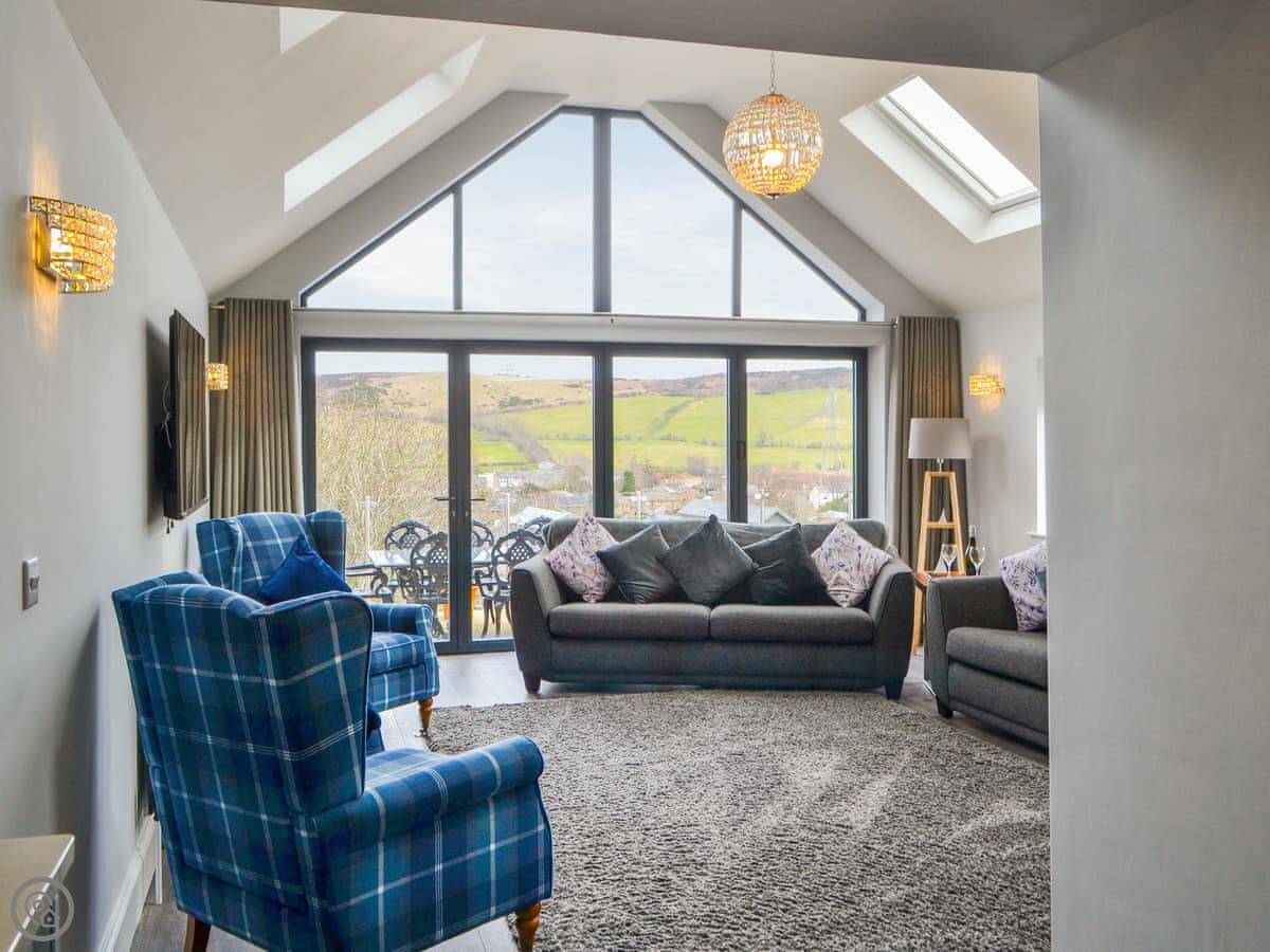 The main living area is open plan on the ground floor. There's a wood burner and bi-fold doors that open straight into the back garden. The garden looks out over fields, which is nice. It's a proper view.