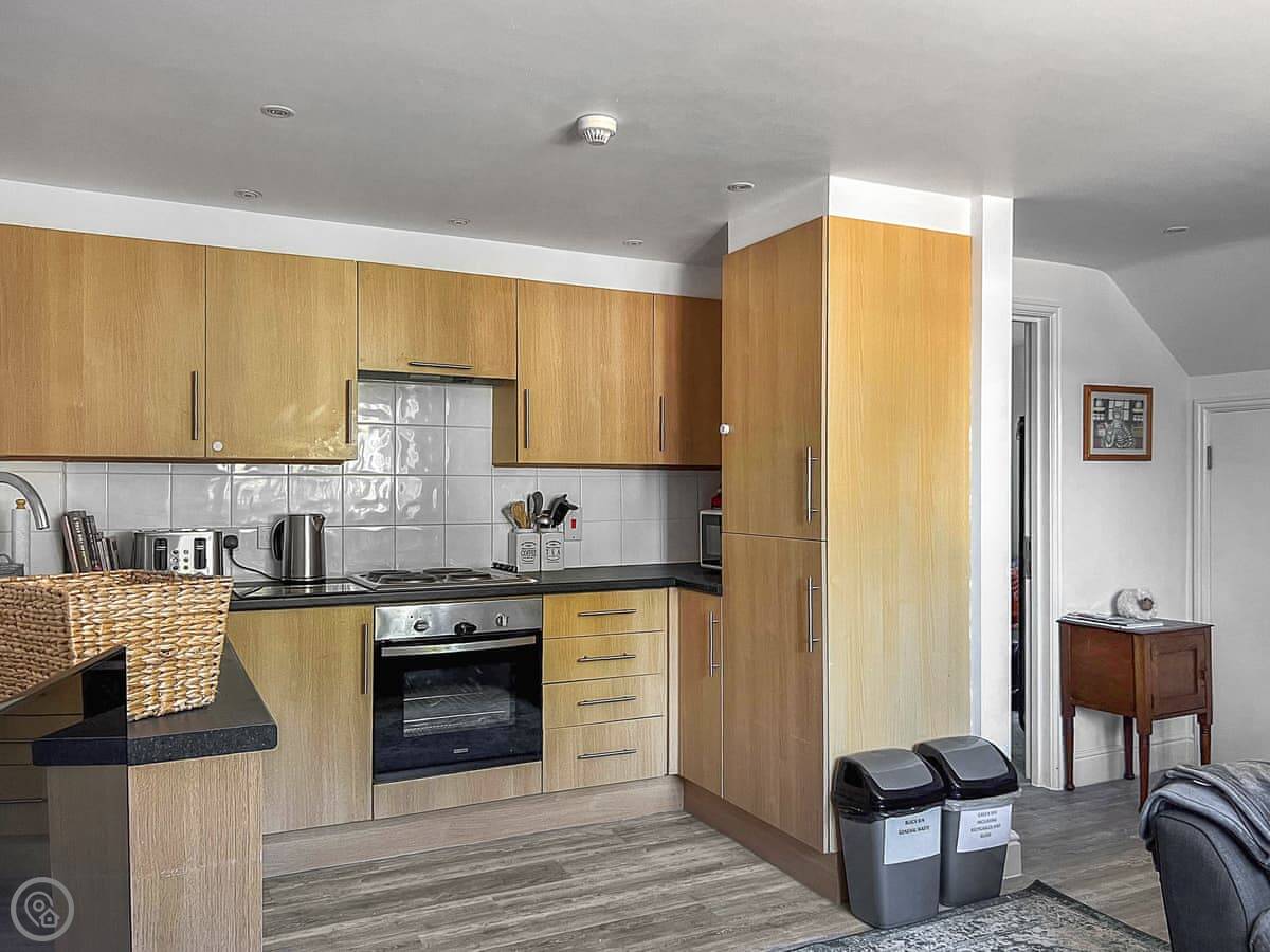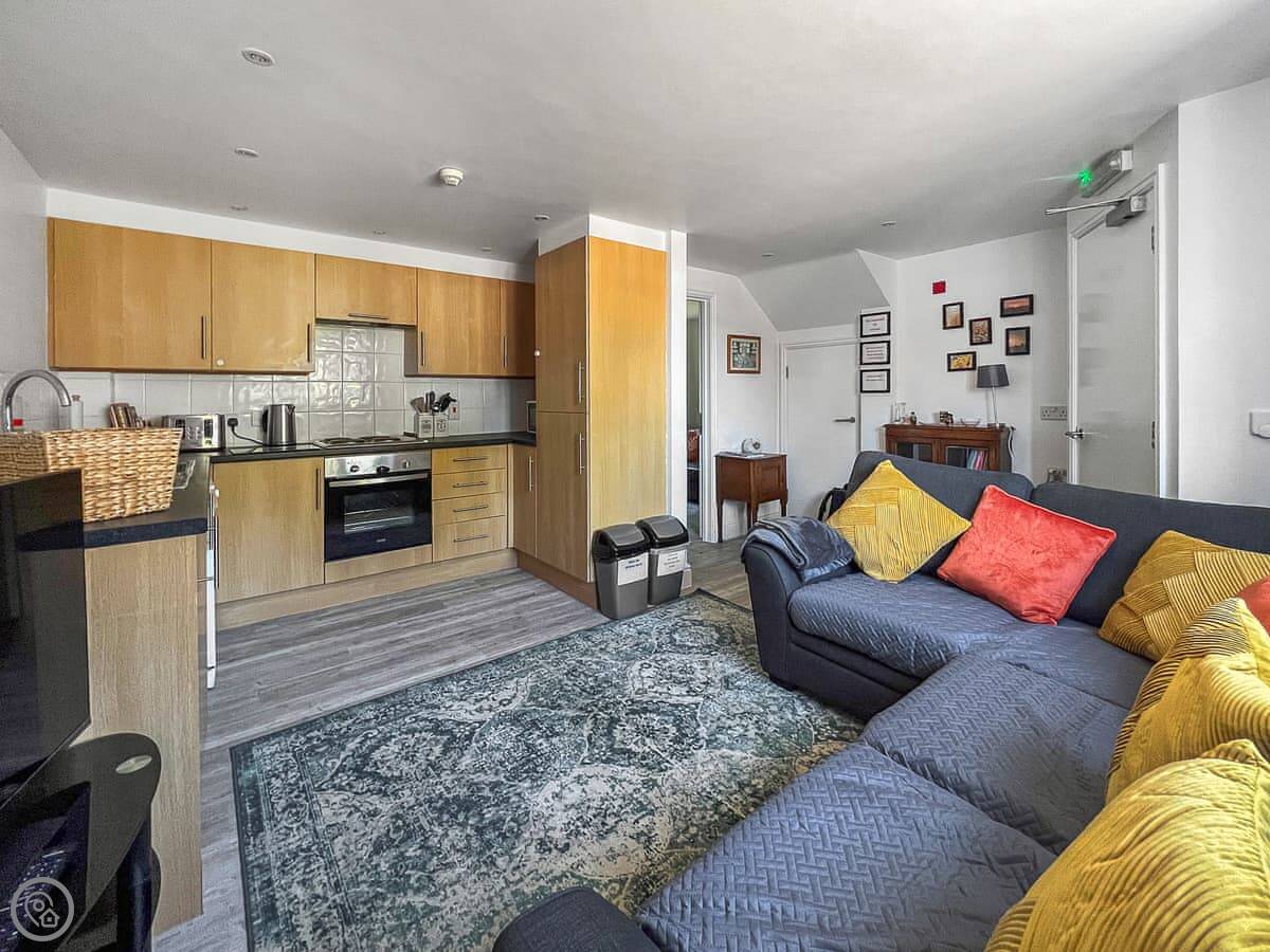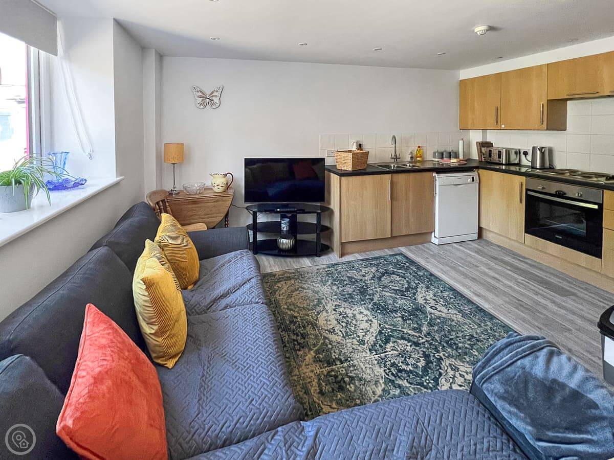The main living space is open-plan. It's not huge, but it's fine for a group. There's a kitchen area, seating, and a Smart TV. You get WiFi. It's clean and has a 4 Star rating.