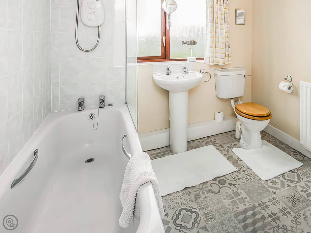 It sleeps four. Two bedrooms upstairs, one kingsize and one twin. There are two bathrooms, one on each floor, which is useful. It's got a 4 Star rating, so it's comfortable and well-equipped. It's not huge, but it's got everything you need. There's a downstairs loo.
