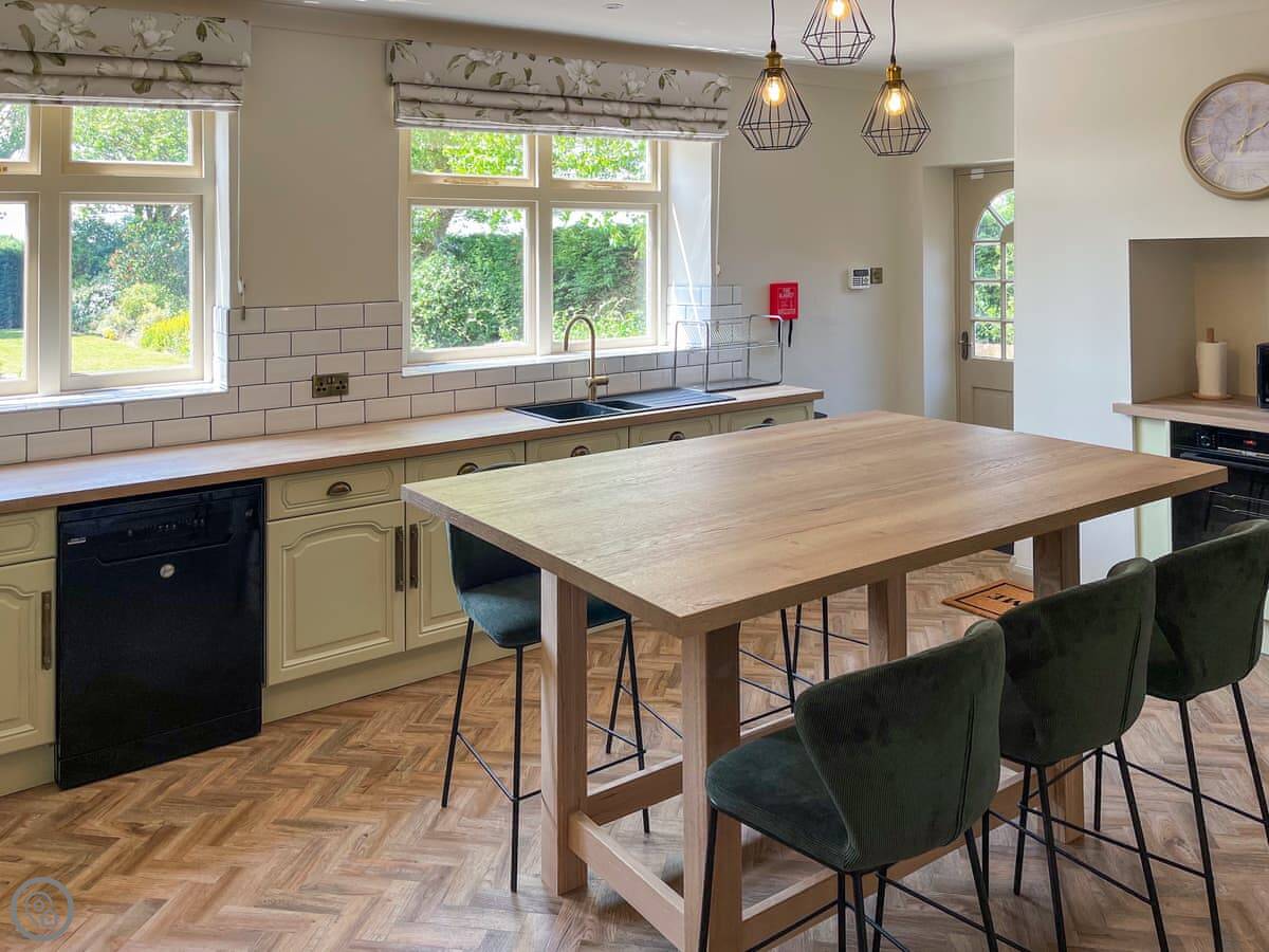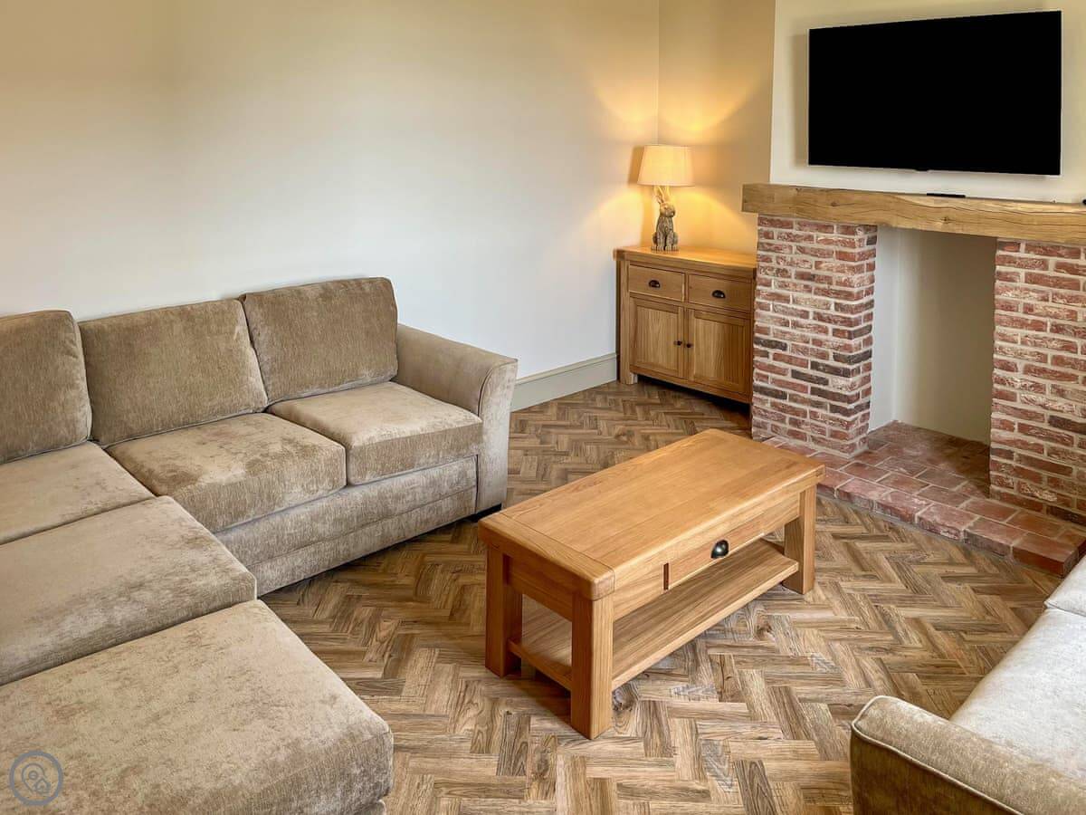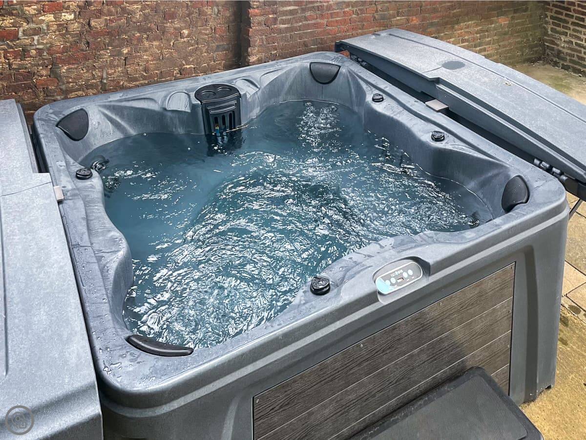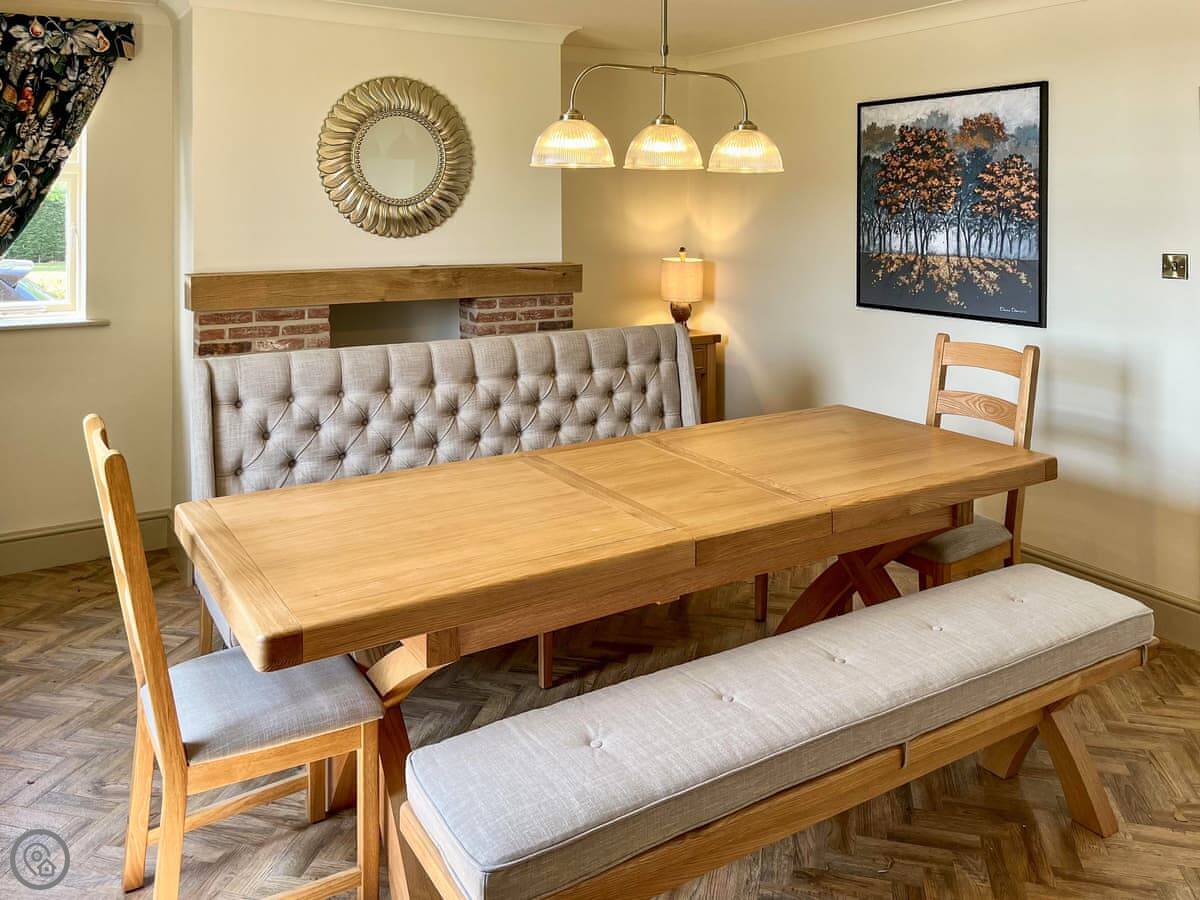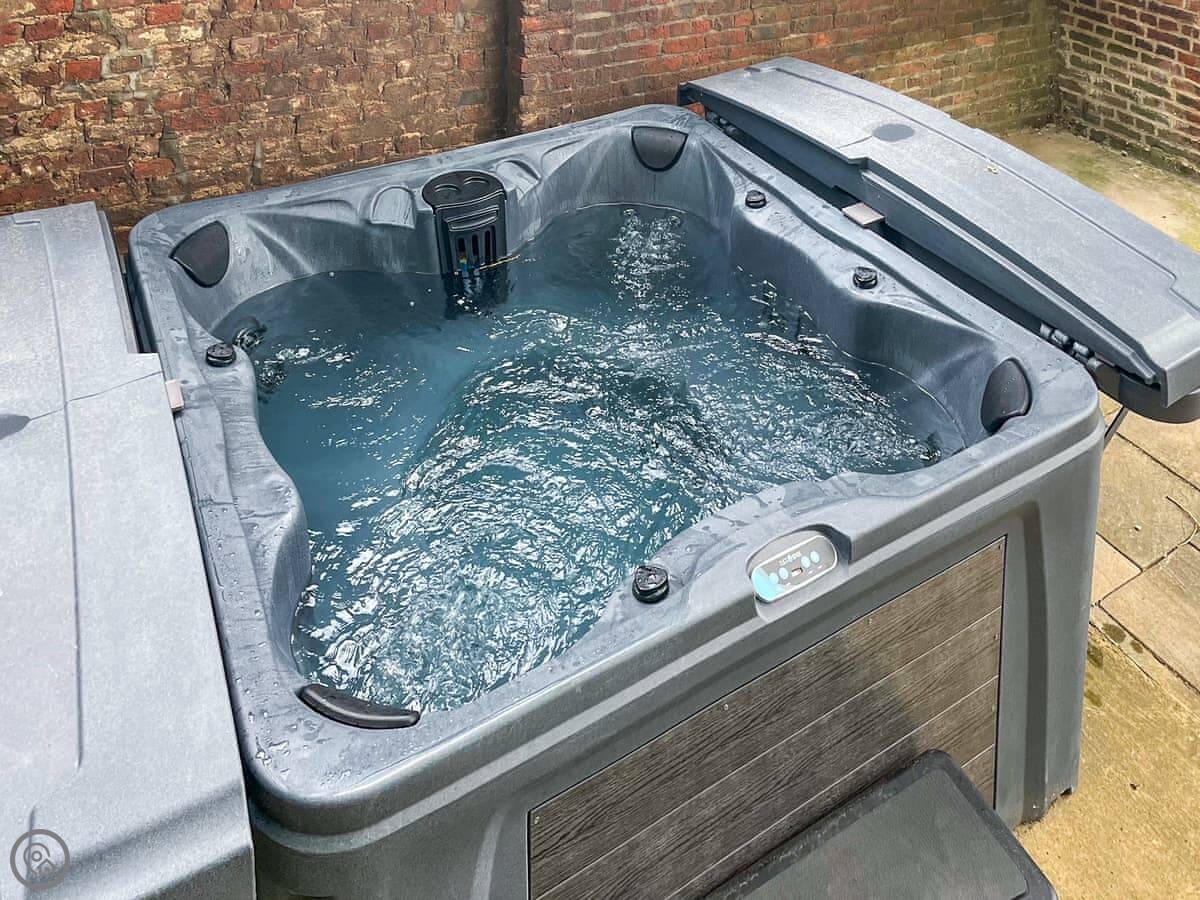 There’s a big garden with a patio area. The hot tub is out there. Inside, there’s a decent sized living area and a separate dining space. The kitchen has a dishwasher. Everything’s included: bedding, towels, electricity, wifi. There’s a TV and parking for a few cars on the drive.