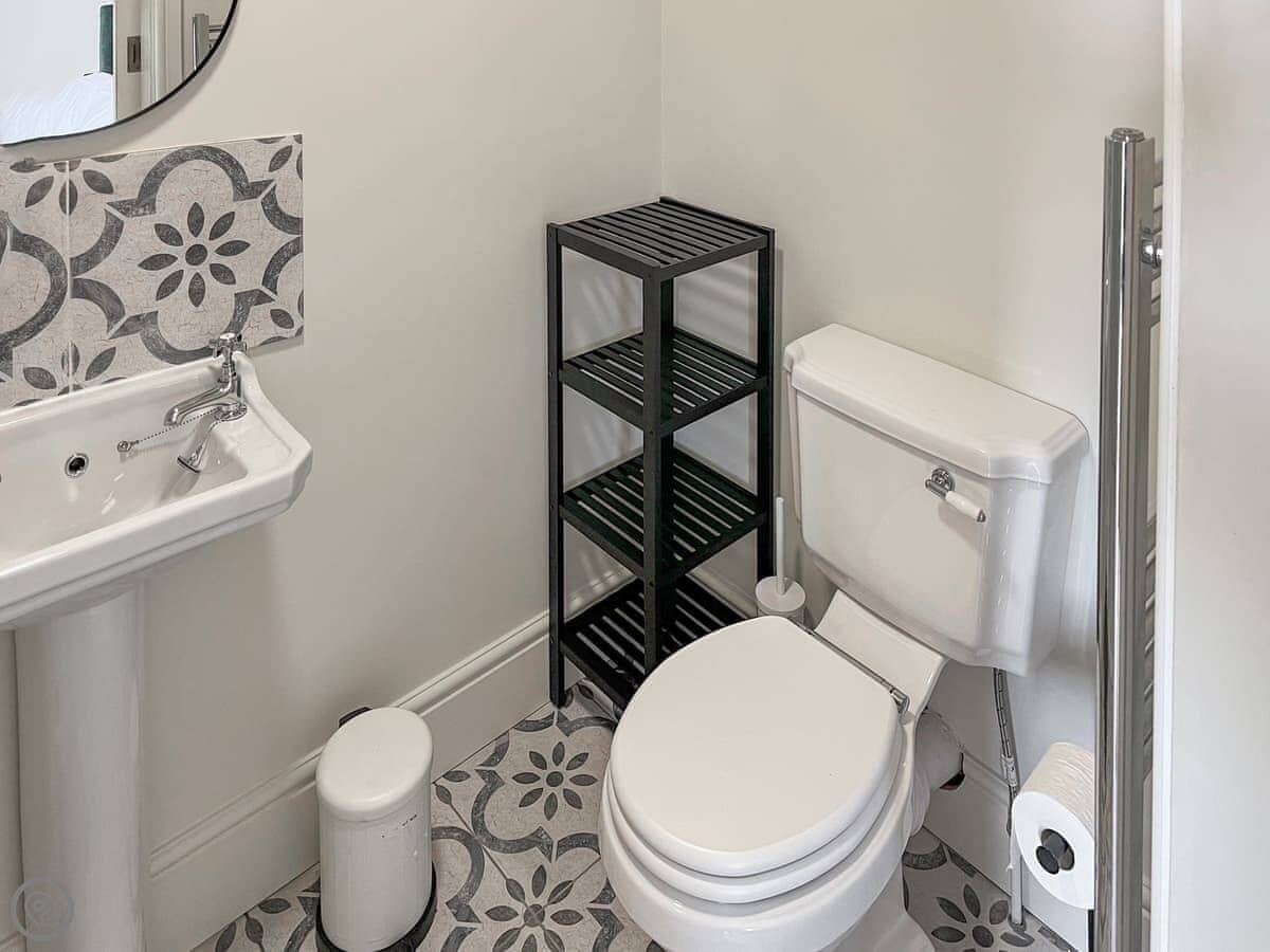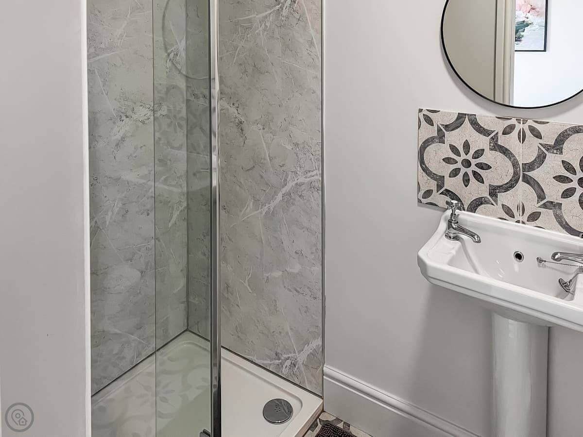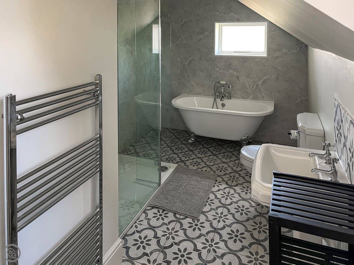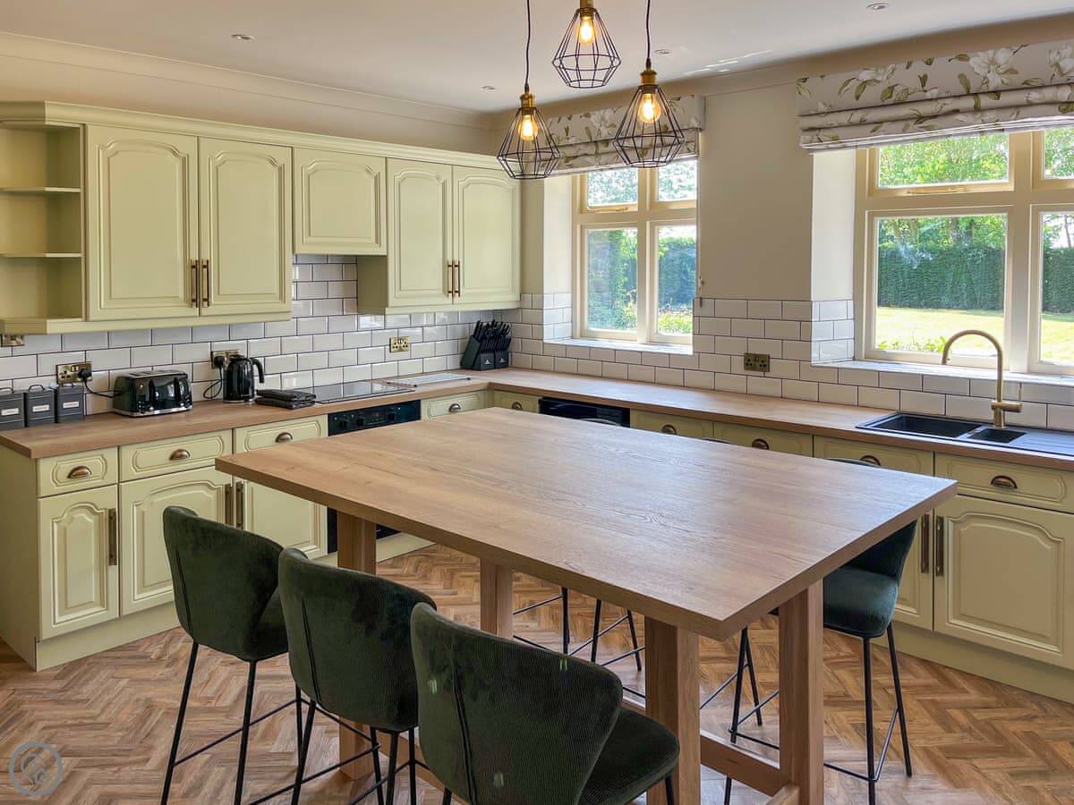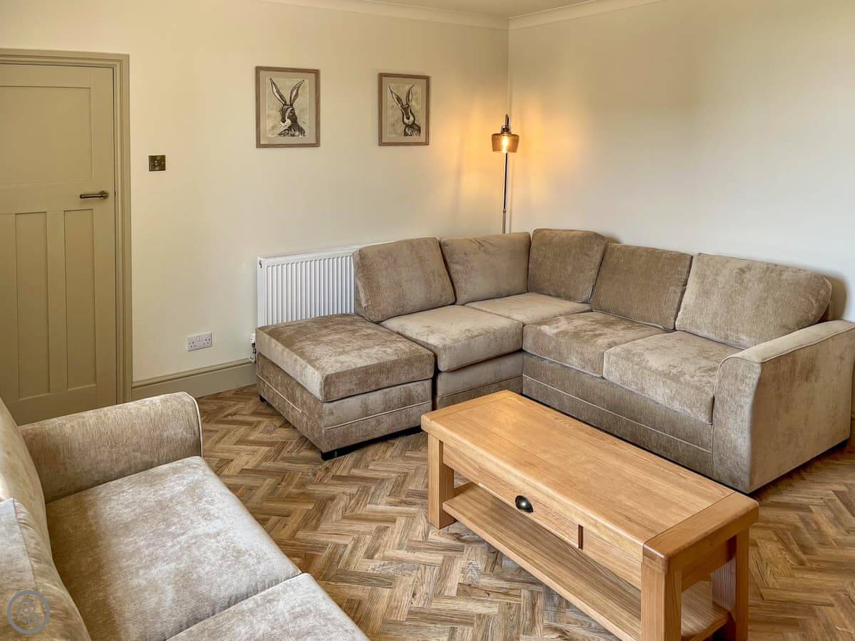 There’s a big garden with a patio area. The hot tub is out there. Inside, there’s a decent sized living area and a separate dining space. The kitchen has a dishwasher. Everything’s included: bedding, towels, electricity, wifi. There’s a TV and parking for a few cars on the drive.