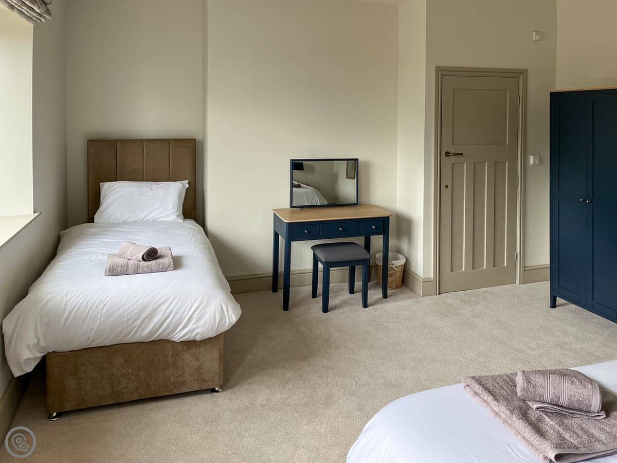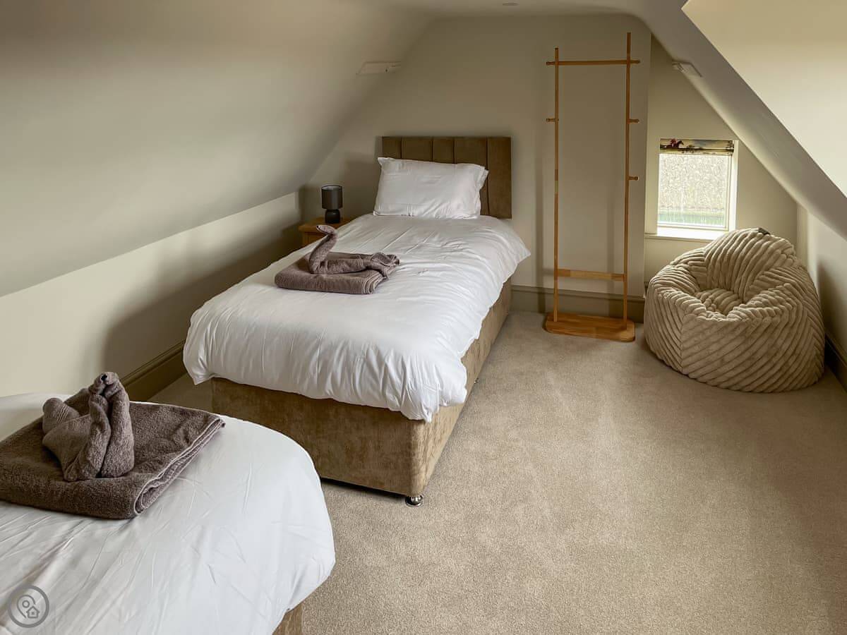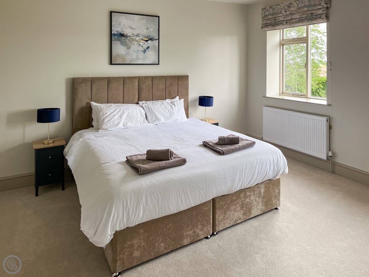 It sleeps eleven people. Five bedrooms, two bathrooms. The rating is 4 Star, so it’s well kitted out. The master bedroom is a good size with a kingsize bed. Two others are kingsize too. One room has a double and a single bed, and there are two twin rooms.